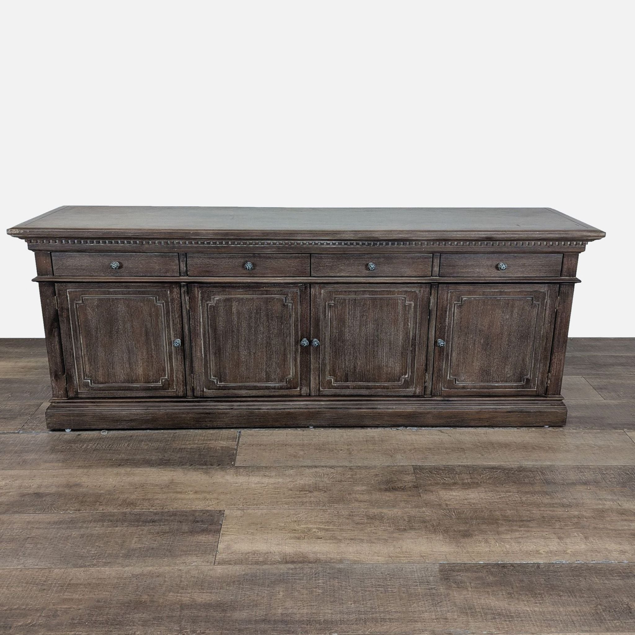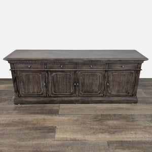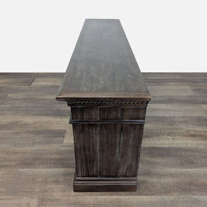 Evoking the architectural classicism of turn-of-the-century design, this piece is designed by Geoffrey Hawkes. It features hand-carved fluted cornices, corbels and dentil detailing, and is constructed of hardwood with mortise-and-tenon joinery.