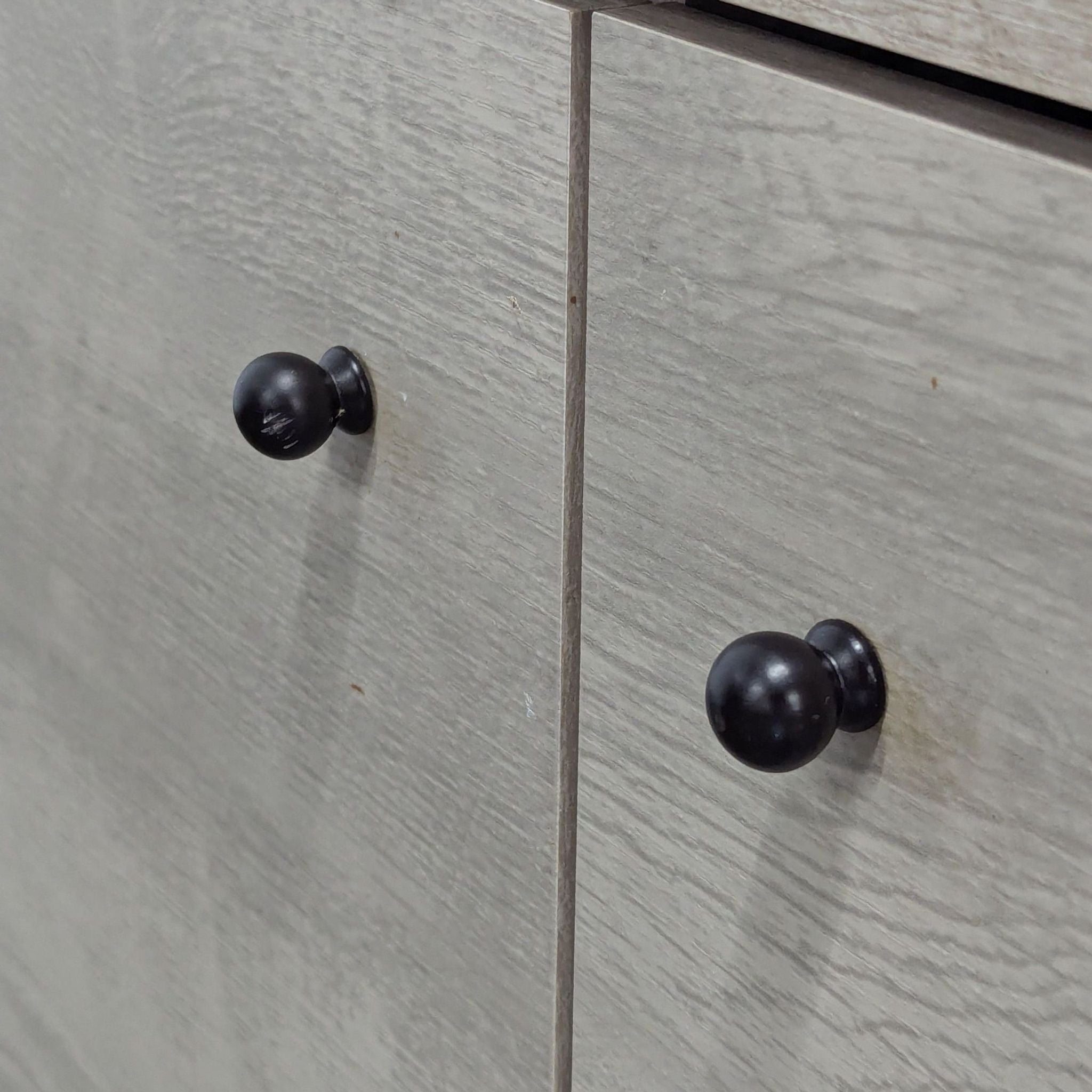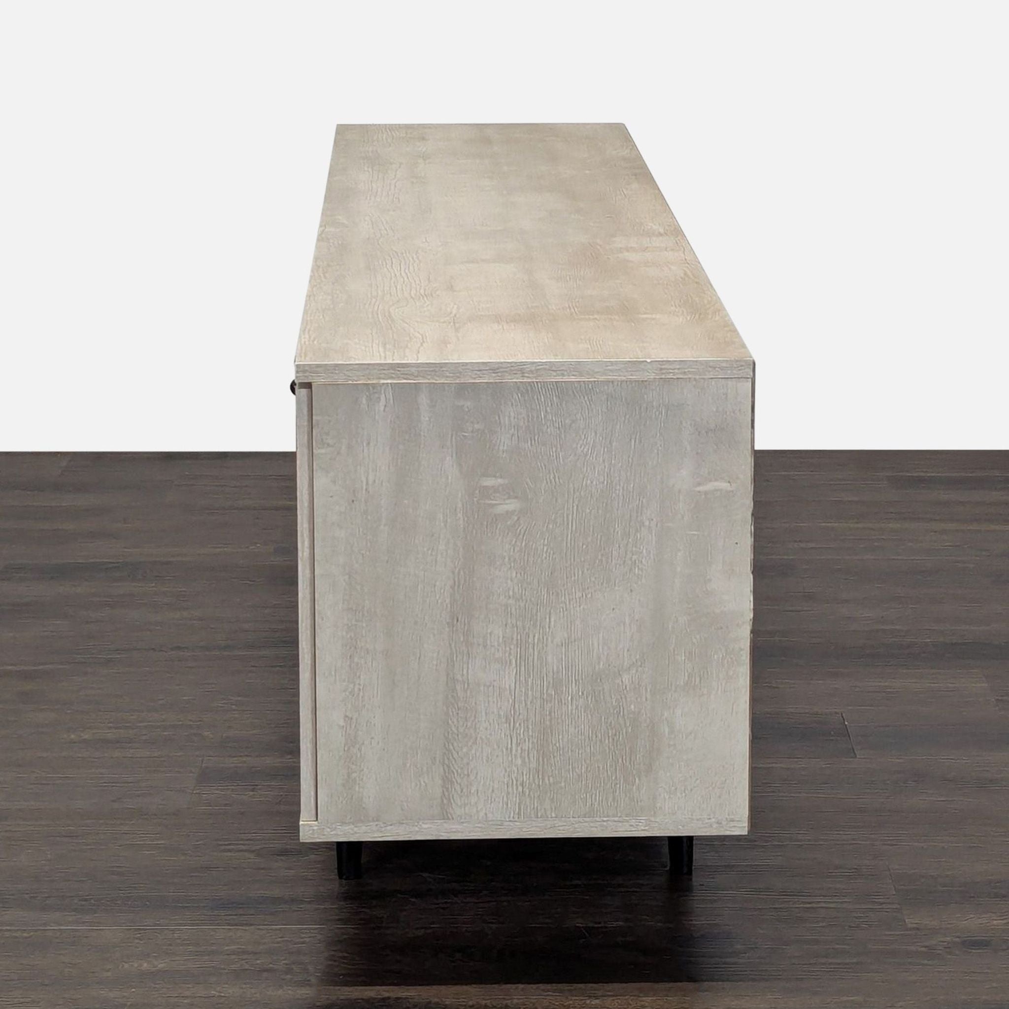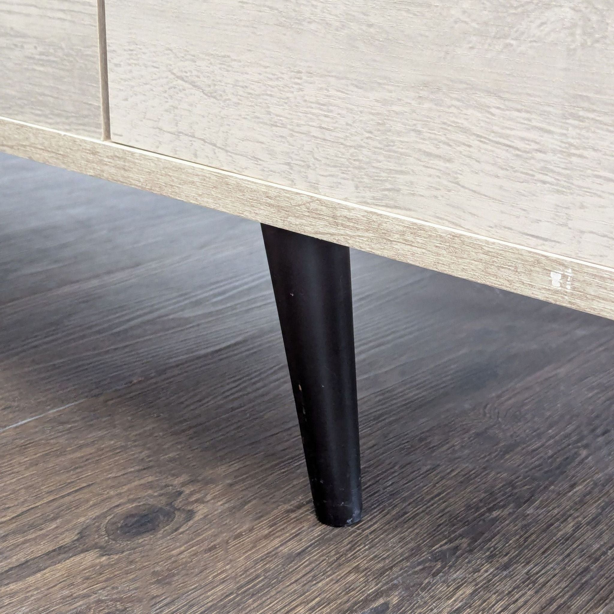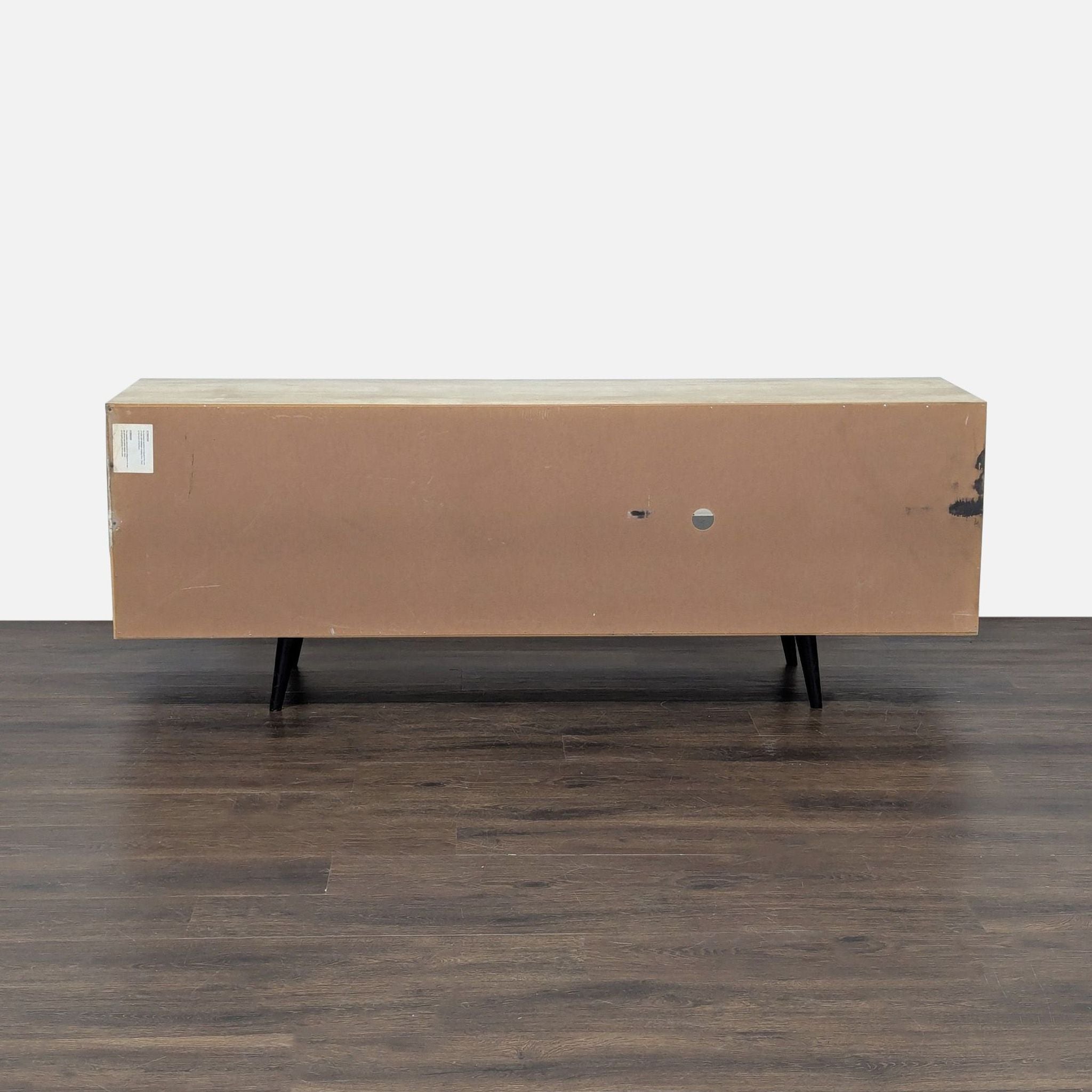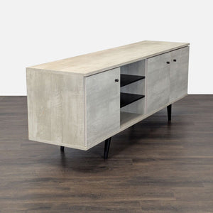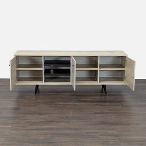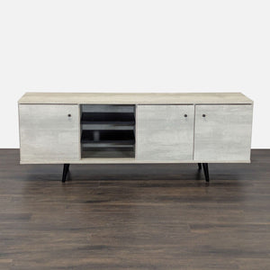 This stand, in a sand finish, features three cabinets for storage, holes for cord management, and a mid-century modern design.