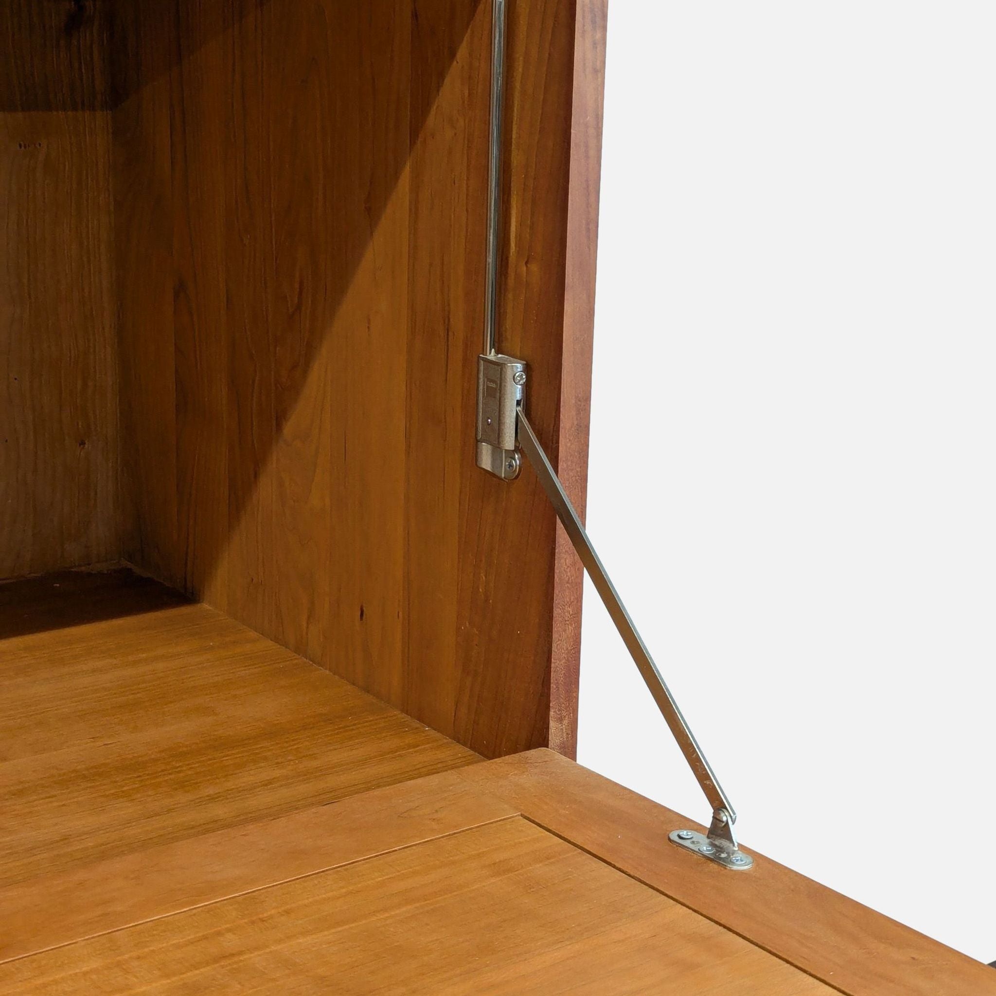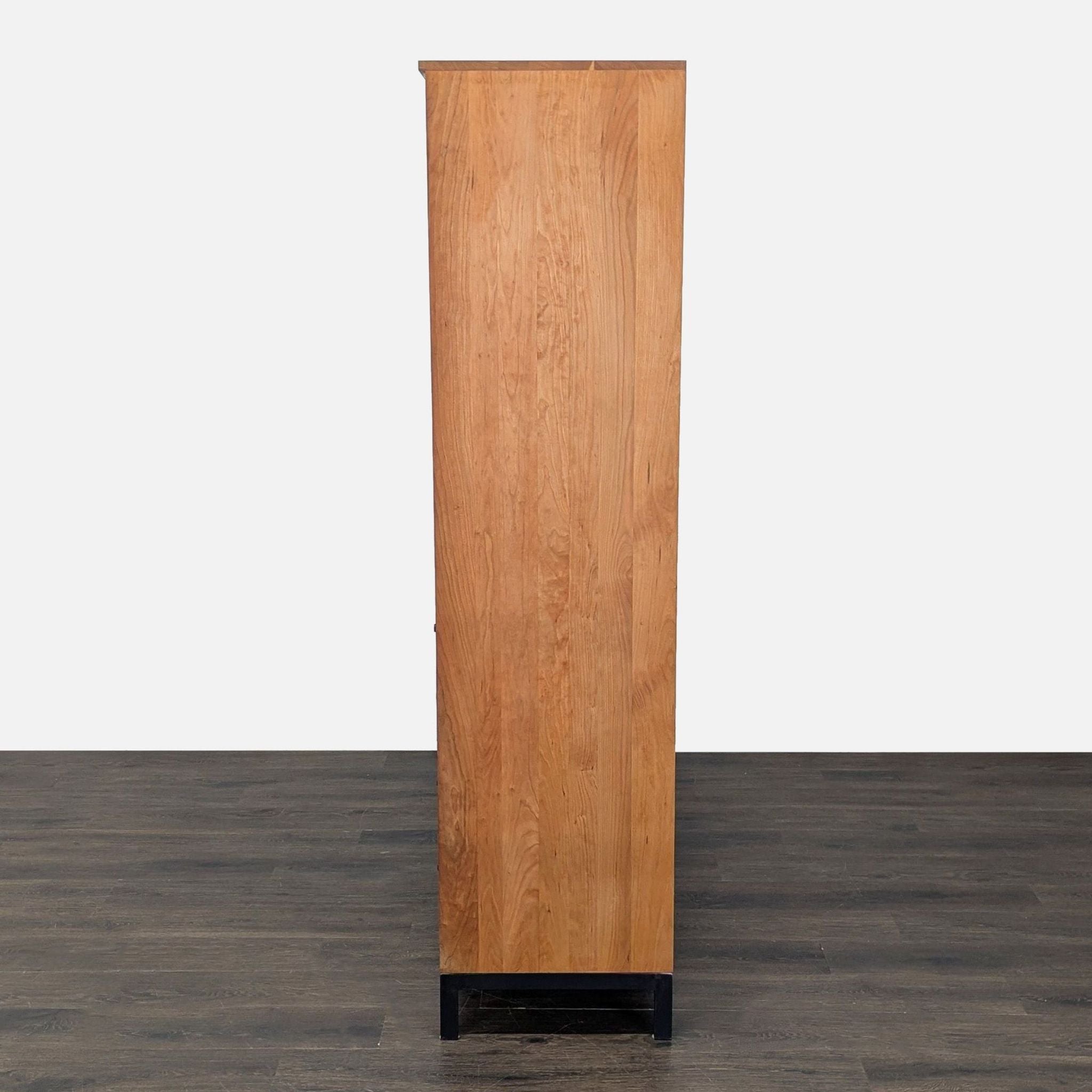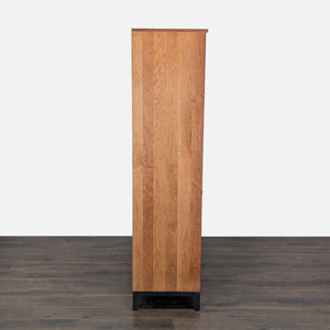 Cherry wood and steel cabinet. Cabinet holds 50 bottles of wine, has 5 drawers, cabinet with shelf, and pull-out bar shelf. The unit rests on a steel base.