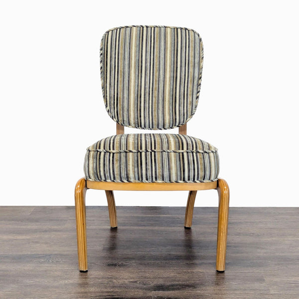 Glam round glass top dining table with metal base and four Adrian upholstered dining chairs.