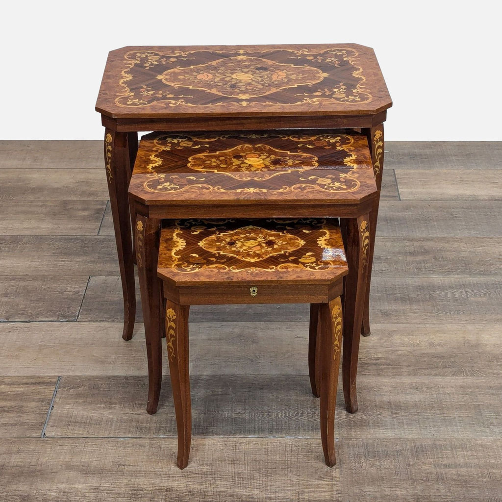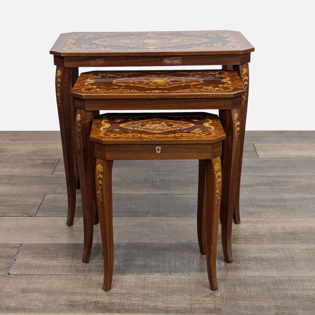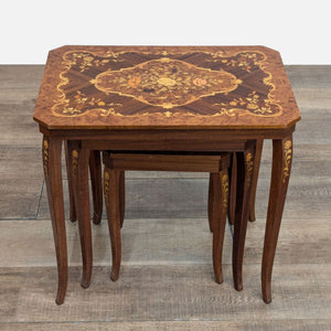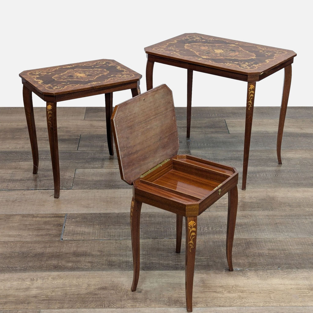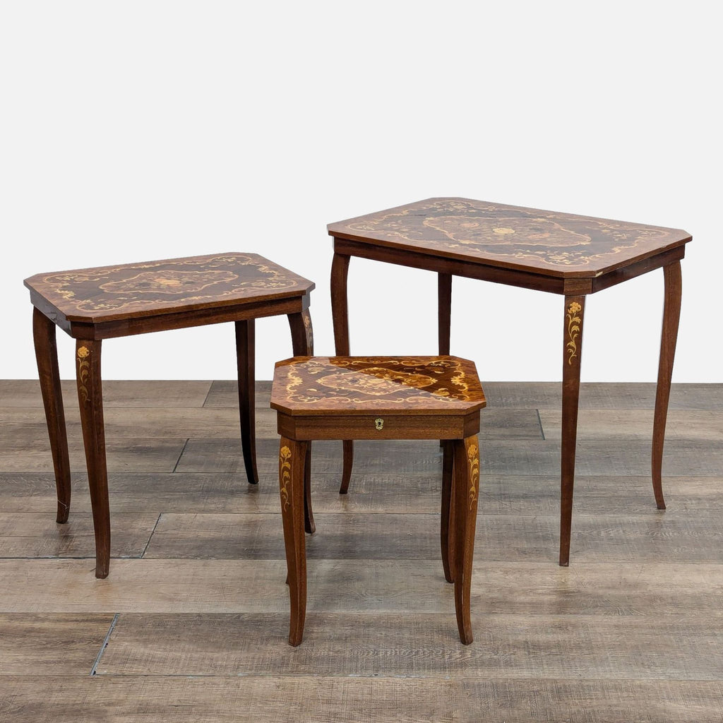 Late 20th century, mixed woods, with intricate floral inlays, raised on cabriole legs, the smallest table has a hinged lid and divided interior with music box