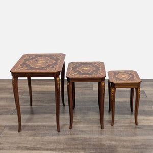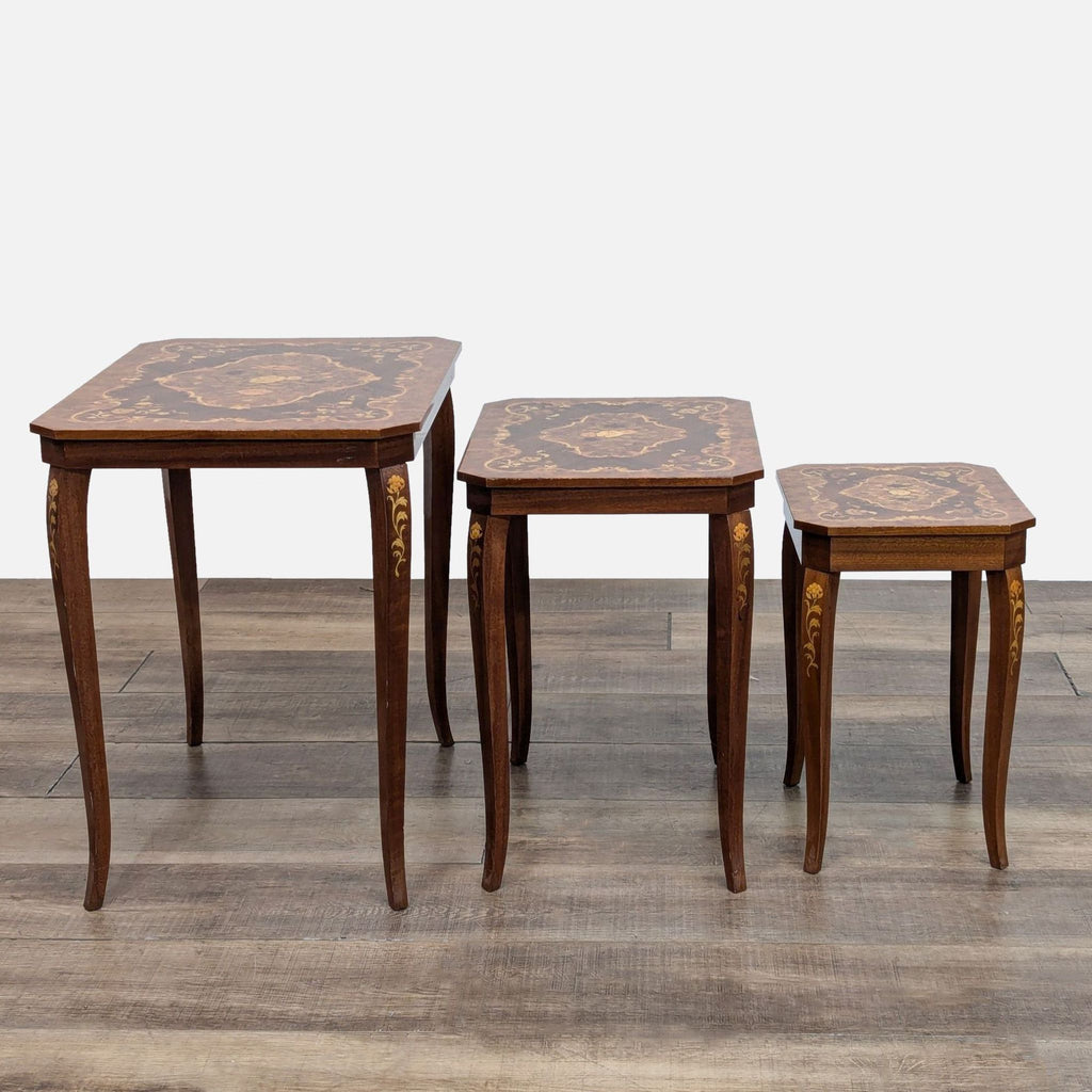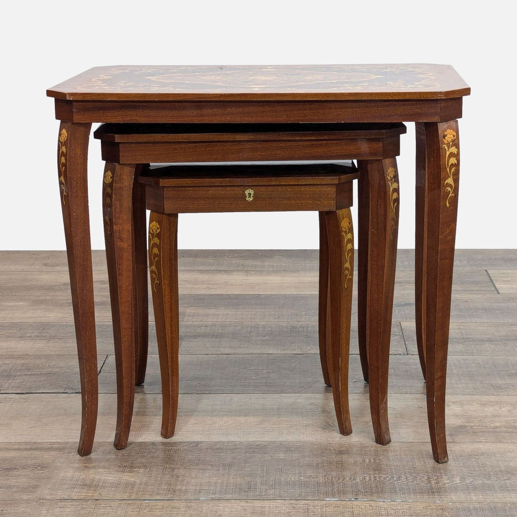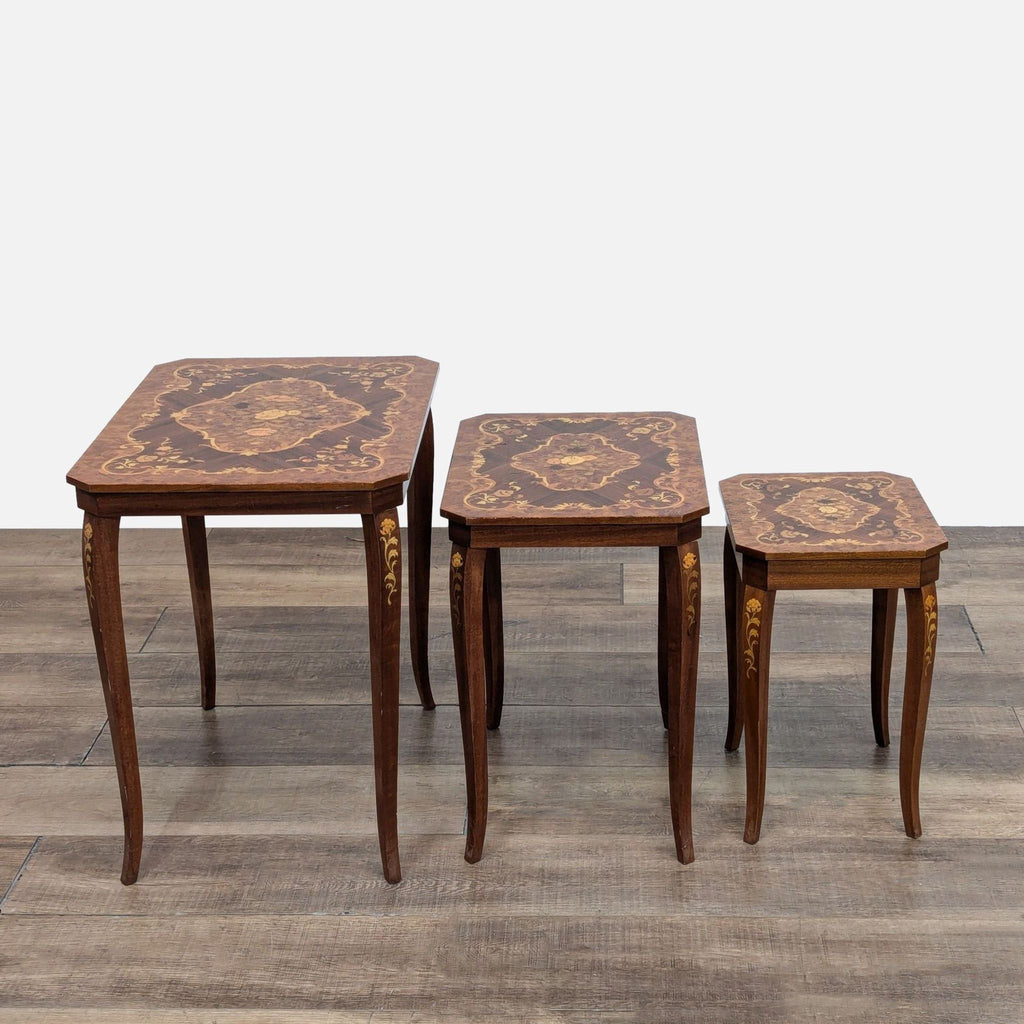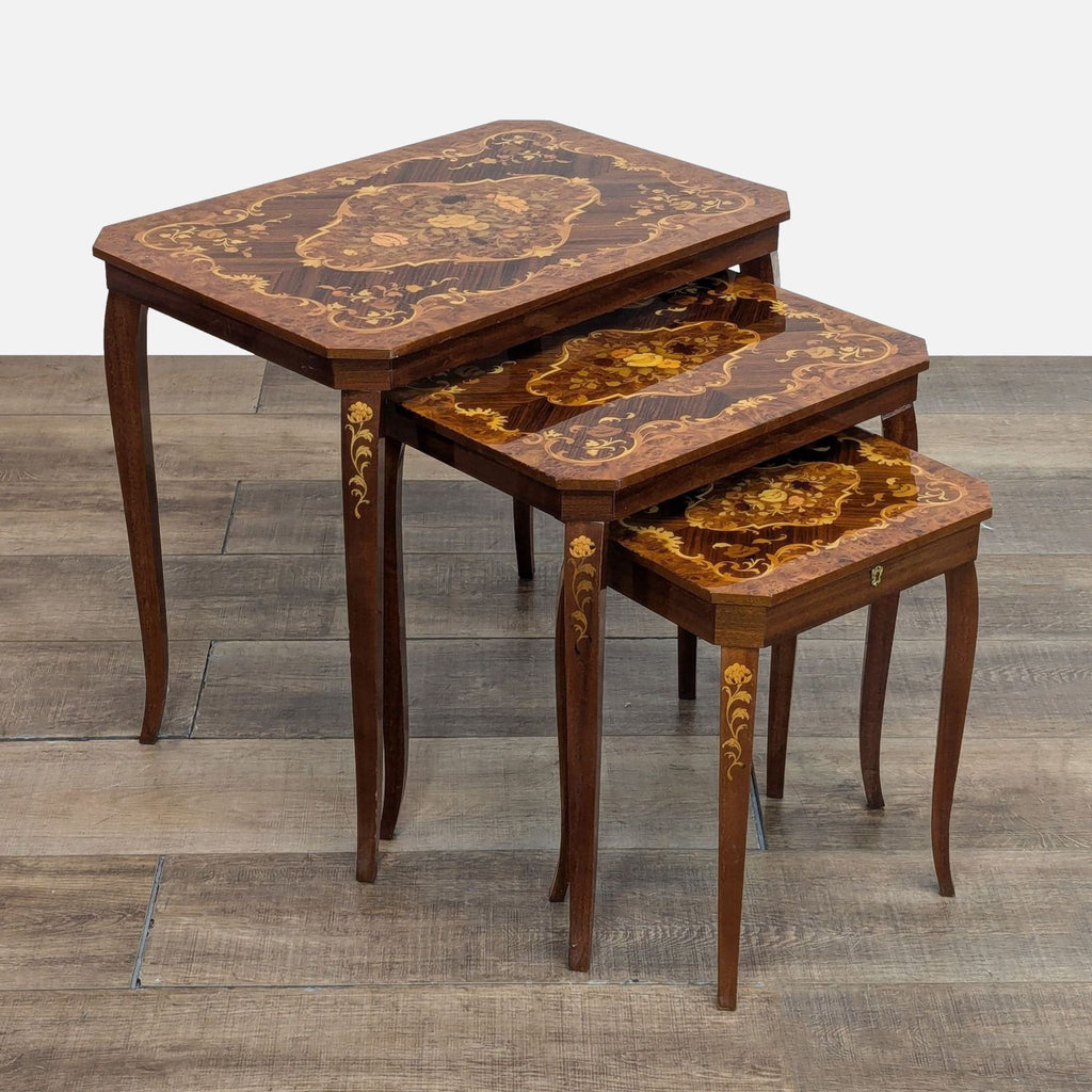 Late 20th century, mixed woods, with intricate floral inlays, raised on cabriole legs, the smallest table has a hinged lid and divided interior with music box