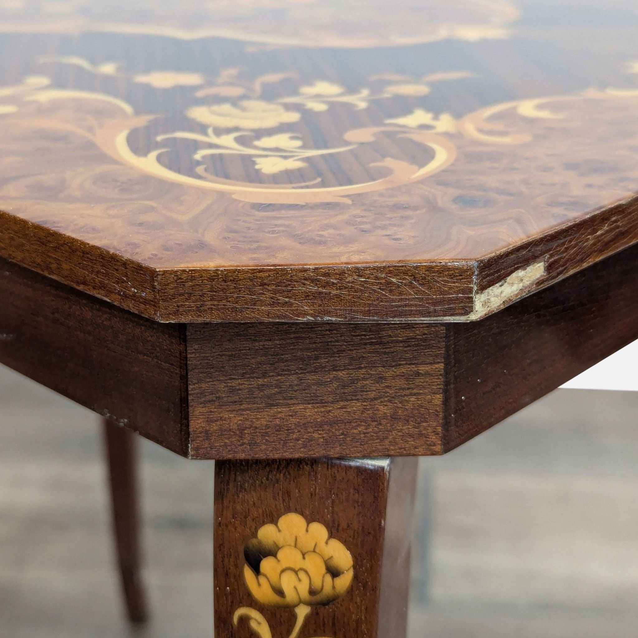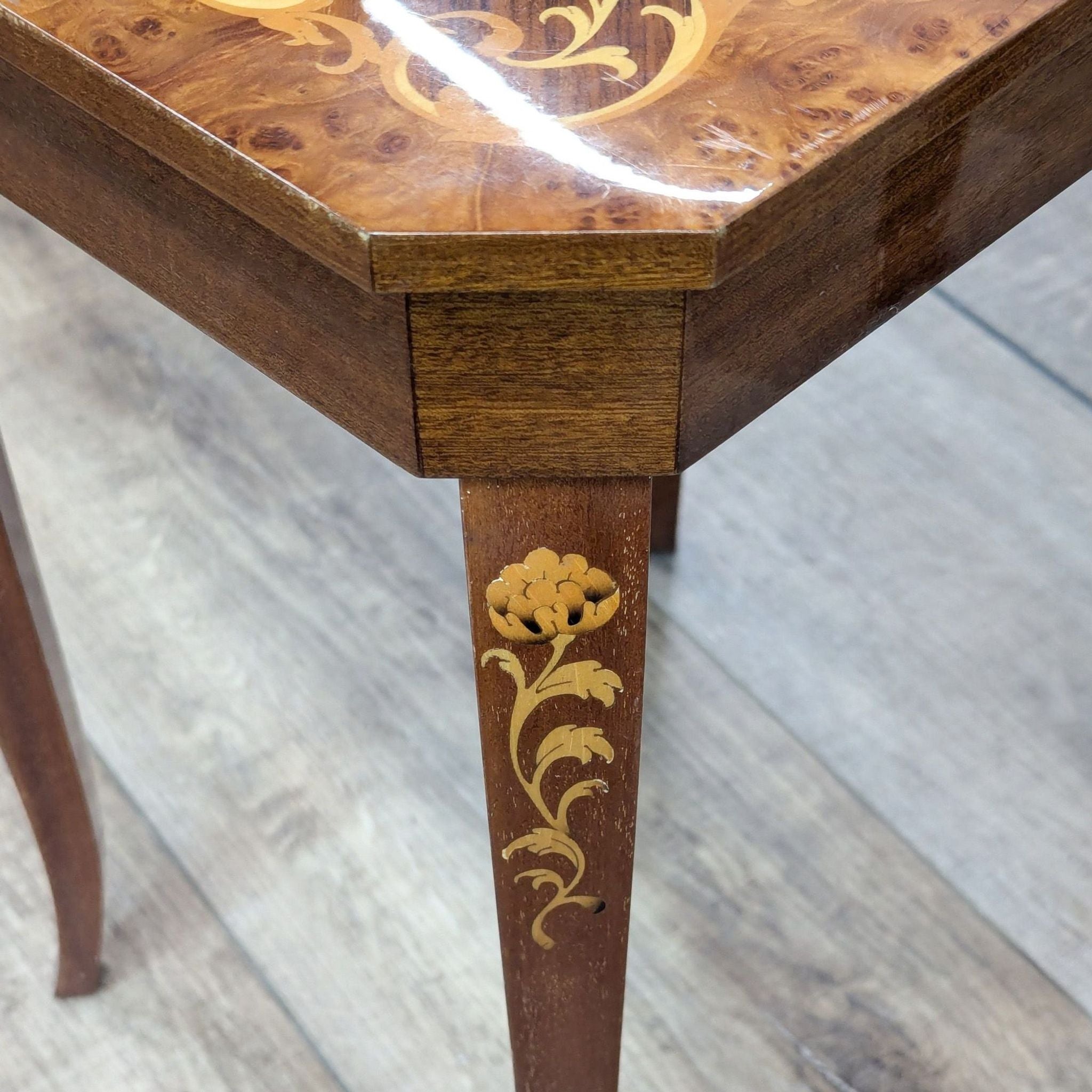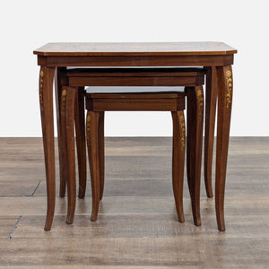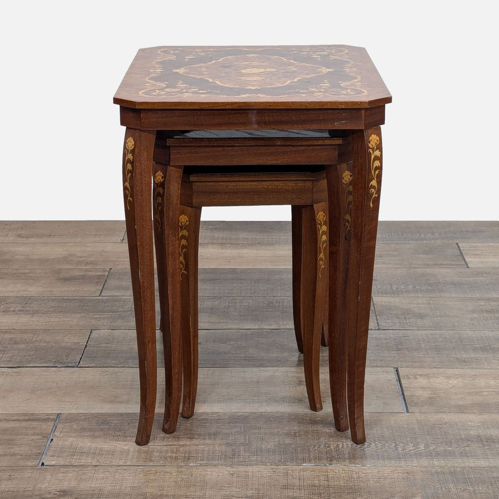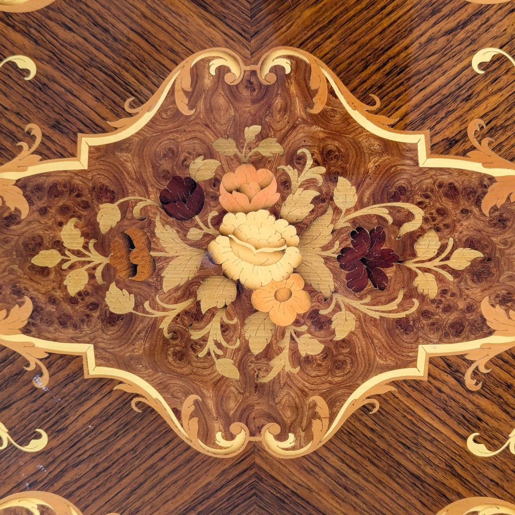 Late 20th century, mixed woods, with intricate floral inlays, raised on cabriole legs, the smallest table has a hinged lid and divided interior with music box