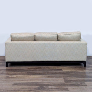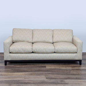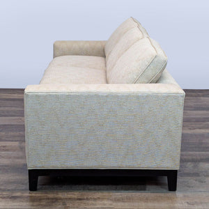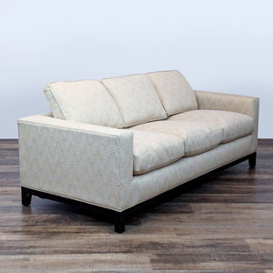 This three-seat sofa designed by renowned French designer Christian Liaigre for Holly Hunt exemplifies Liaigre’s signature minimalist aesthetic with clean, architectural lines, low-profile track arms, and plush, deep cushions for exceptional comfort. Newly reupholstered in a neutral, textured fabric with subtle patterning, the sofa rests on dark-stained wood legs.