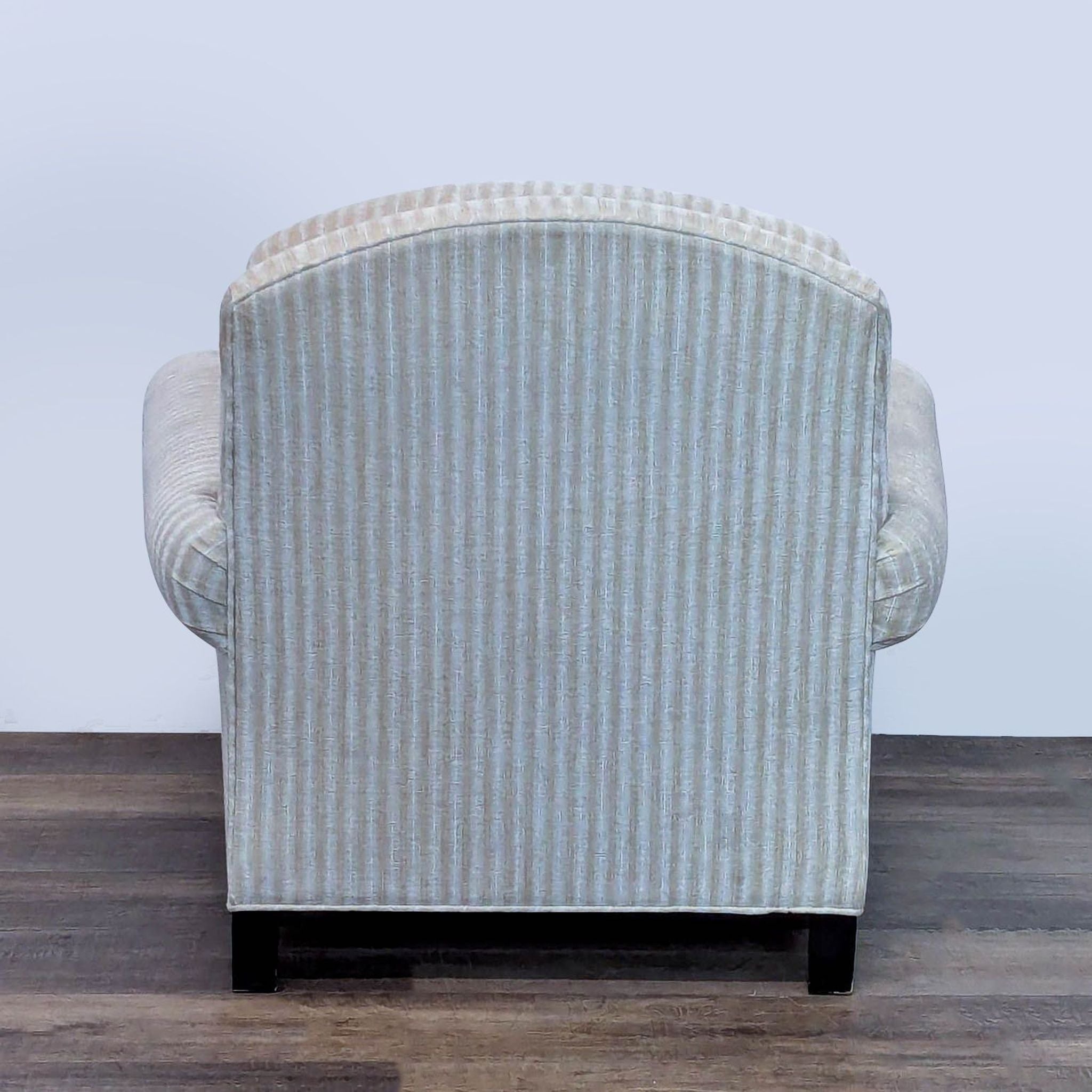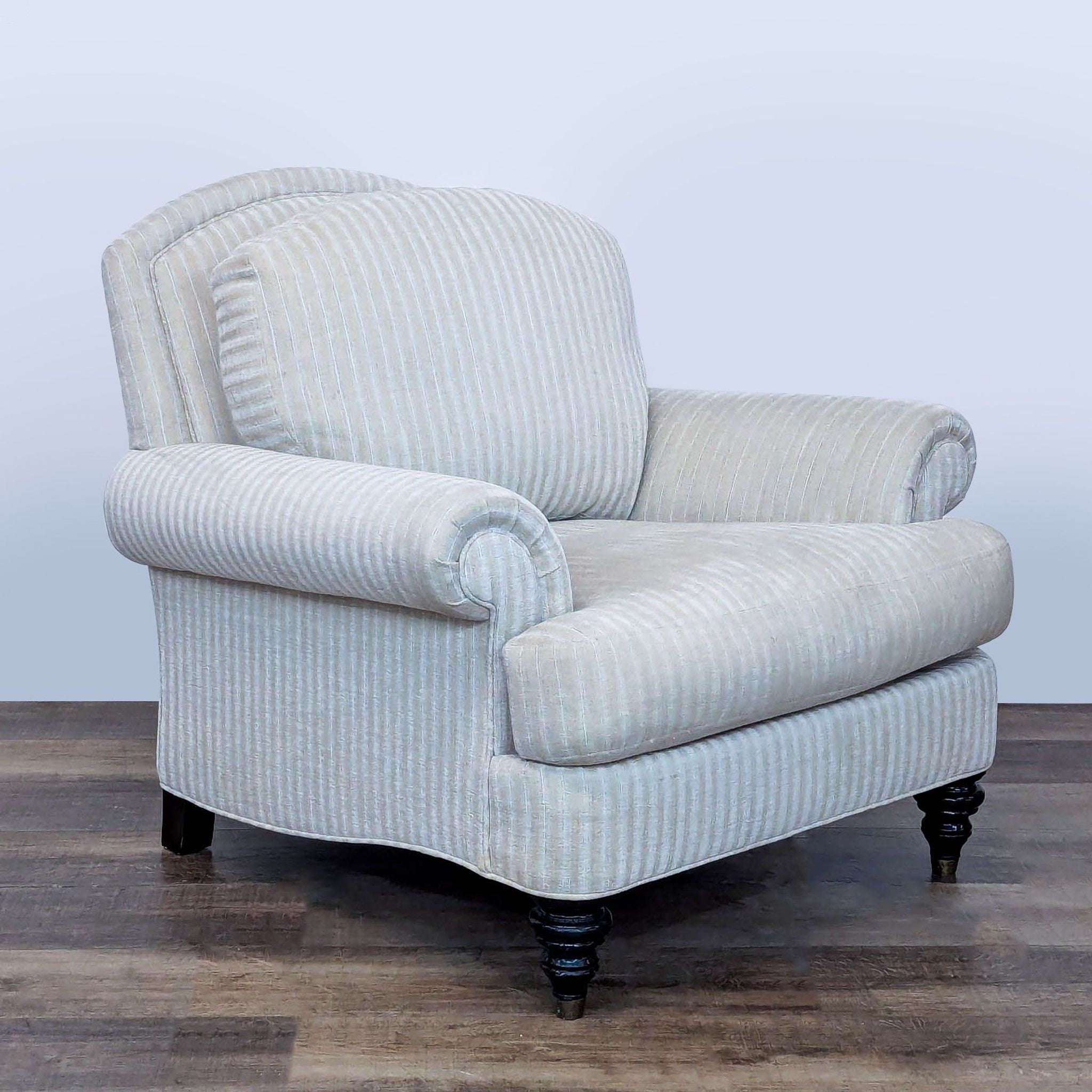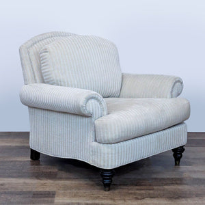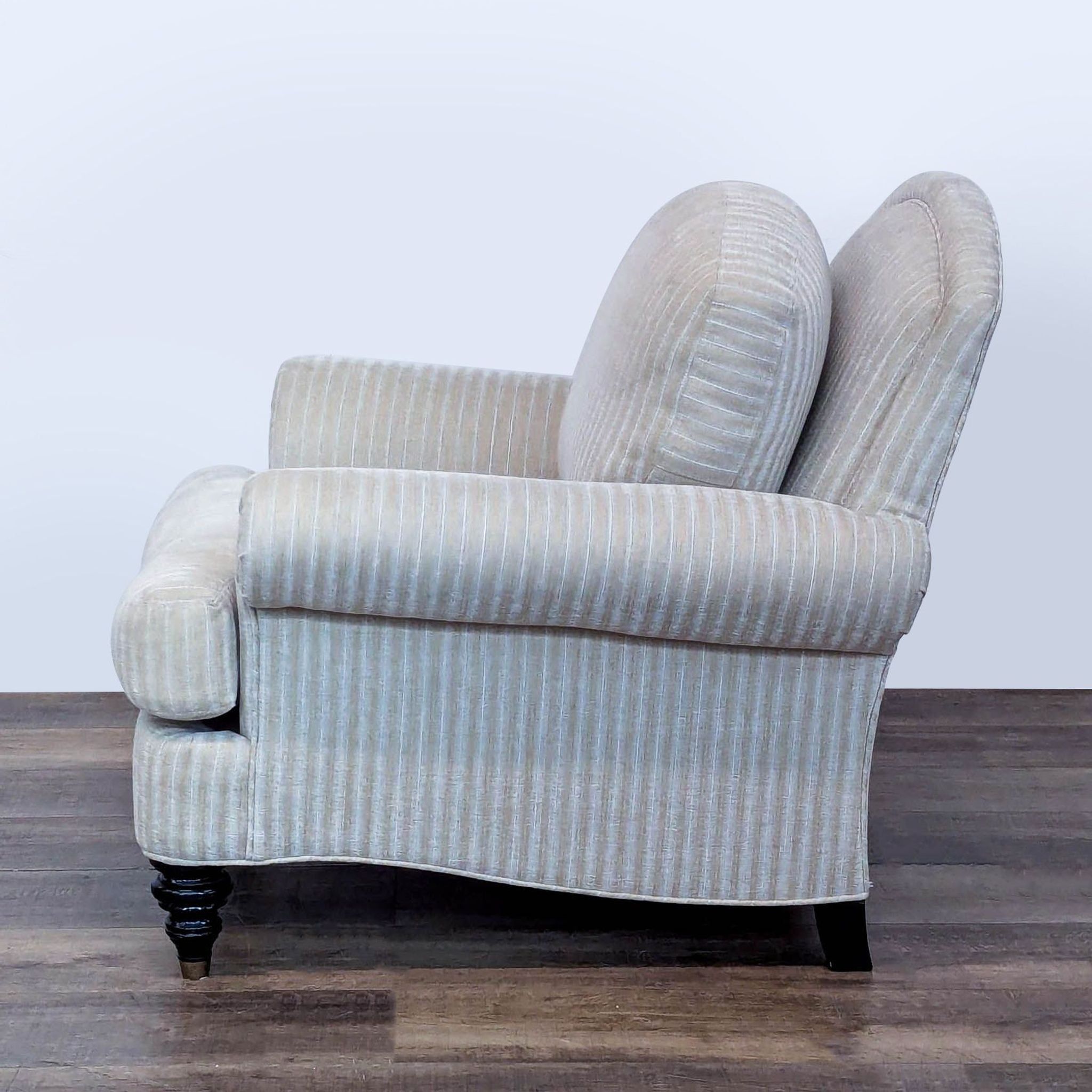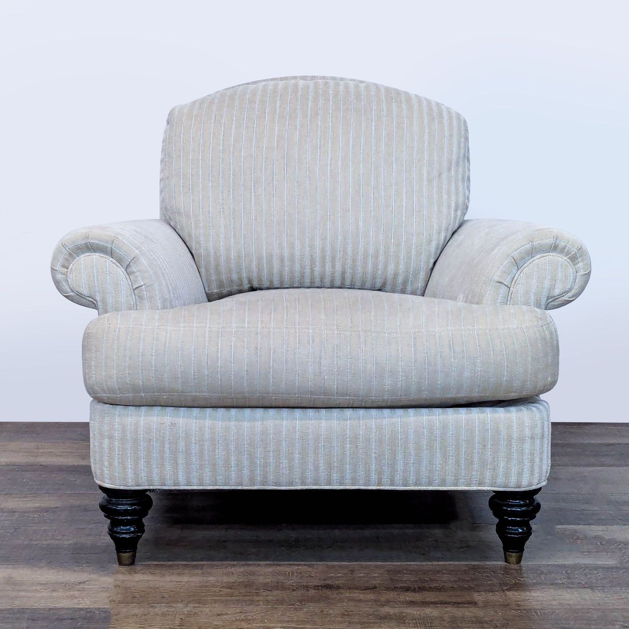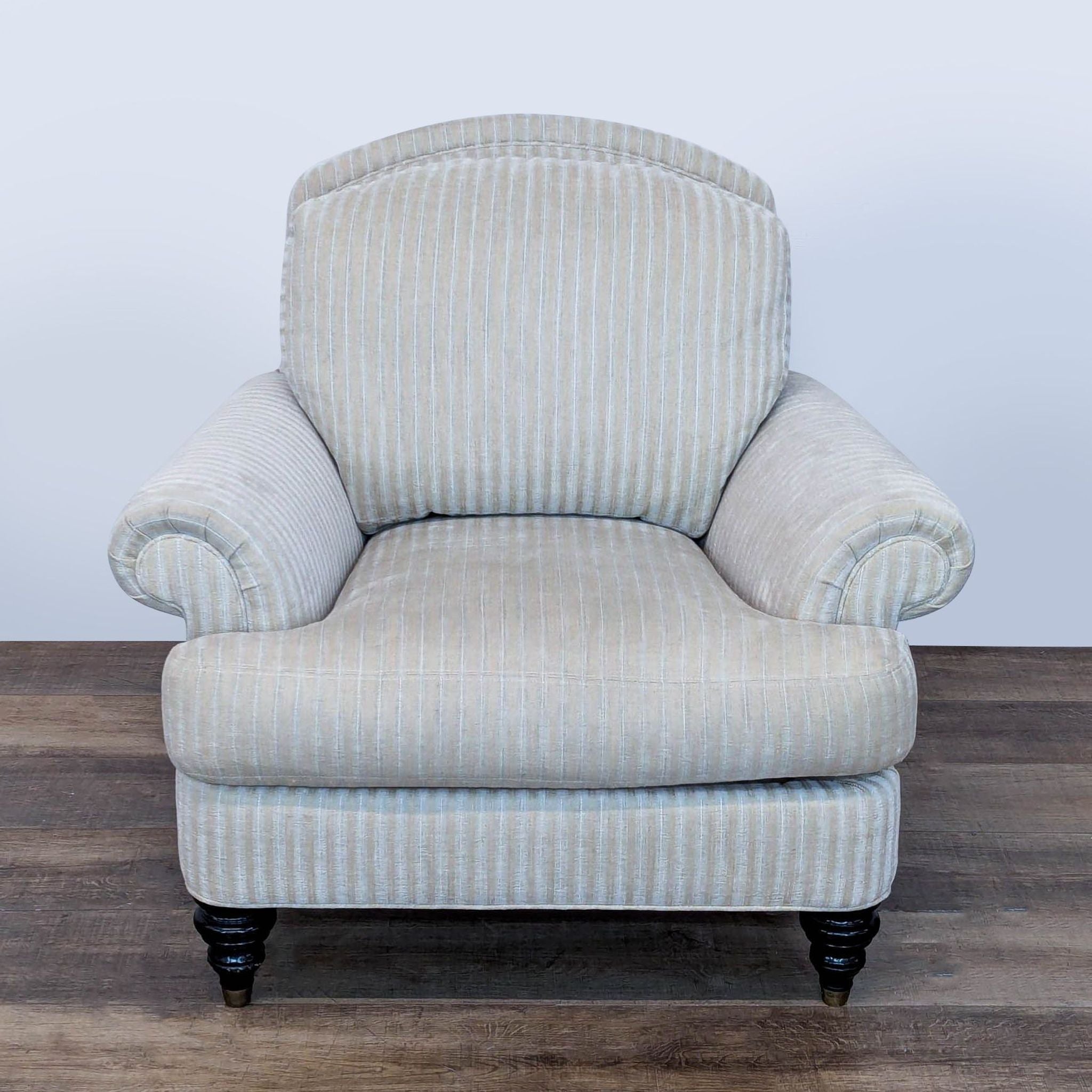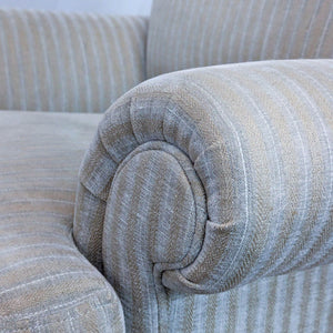 Features striped upholstery, rolled arms and turned wood legs with brass caps.
