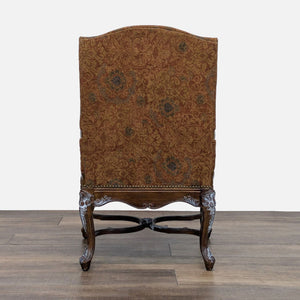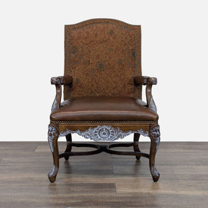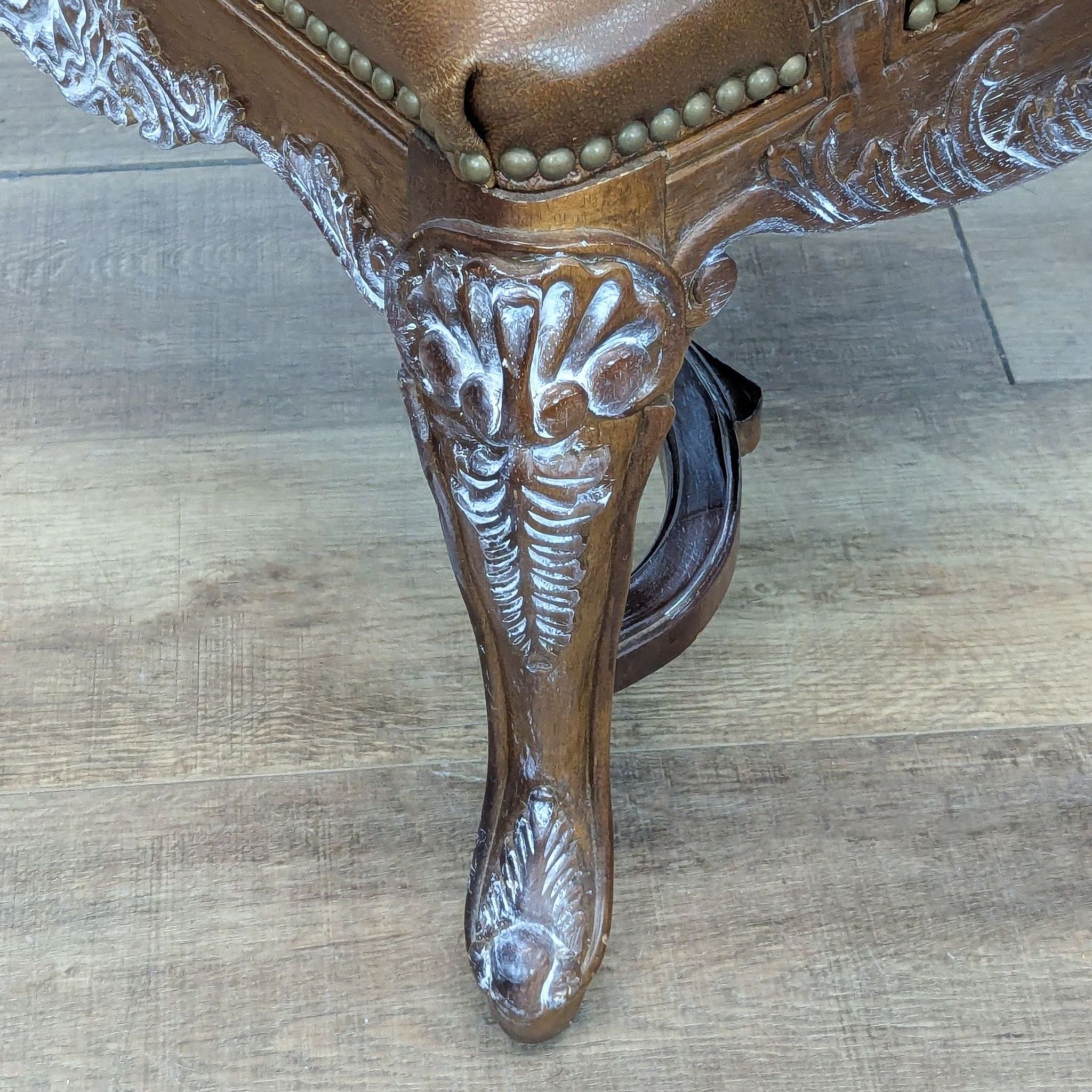 This chair features a high, upholstered back with a leather seat. The wooden frame is intricately carved, with a whitewash finish to accent the carved details.