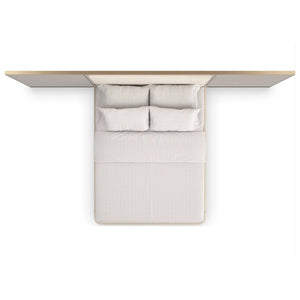 Features paneled wings in Koto veneers with a Chevron pattern inspired by early Greek motifs, framing a parsons-style headboard dressed in a soft yet durable wool-like flannel. A metal spline in Brushed Gold lends separation and a hint of shimmer. Seemingly floating on a Brushed Gold plinth base.