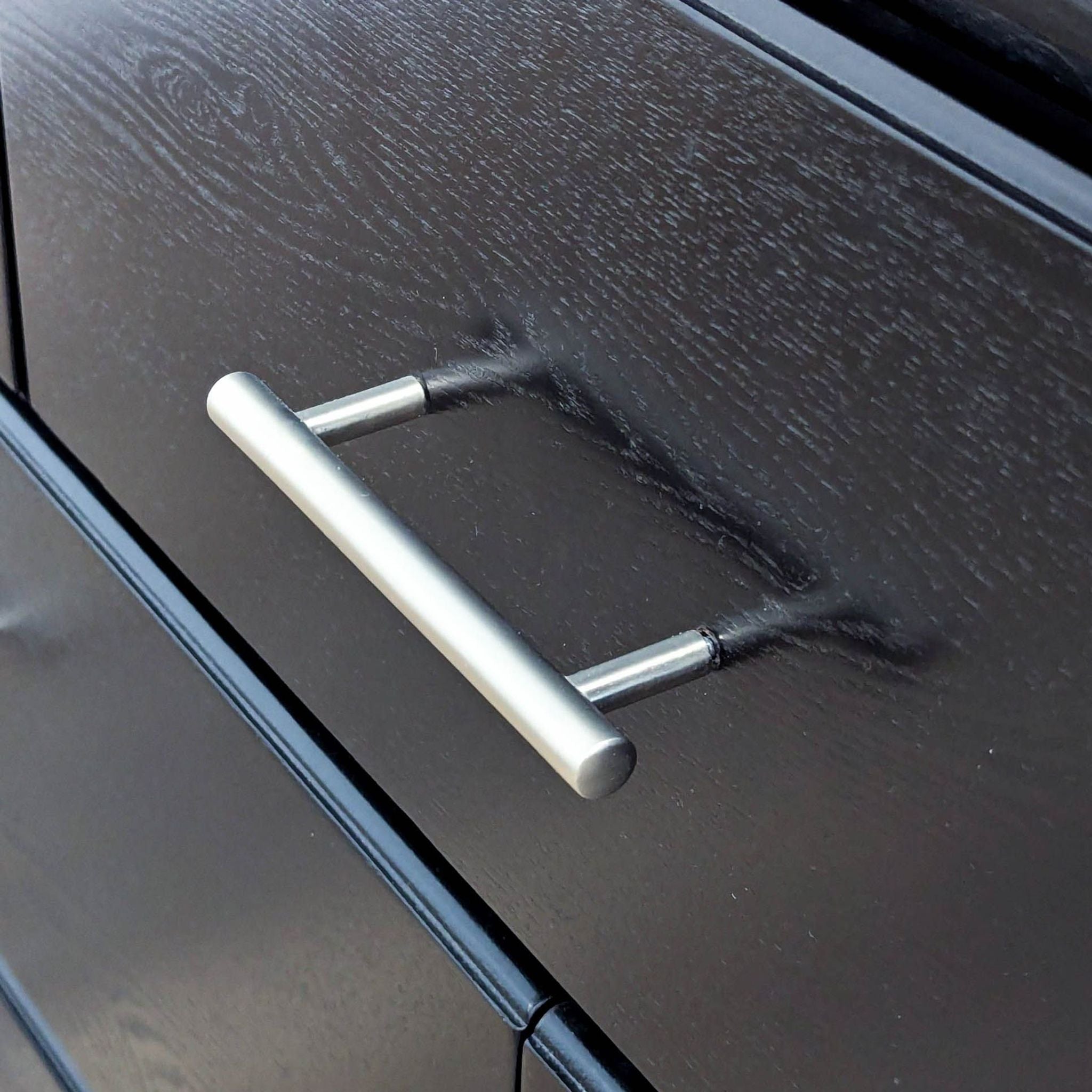 Features 7 drawers on metal glides with brushed nickel bar handles.