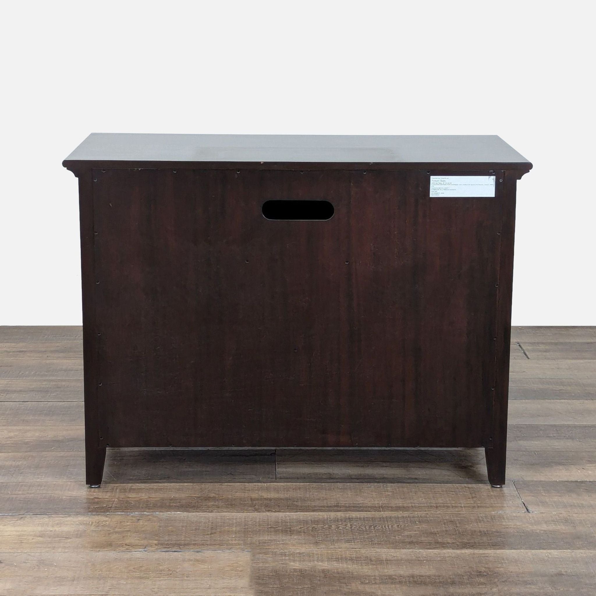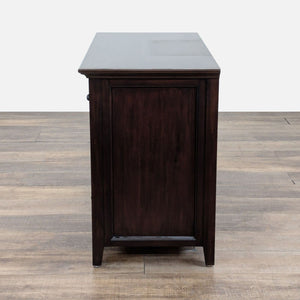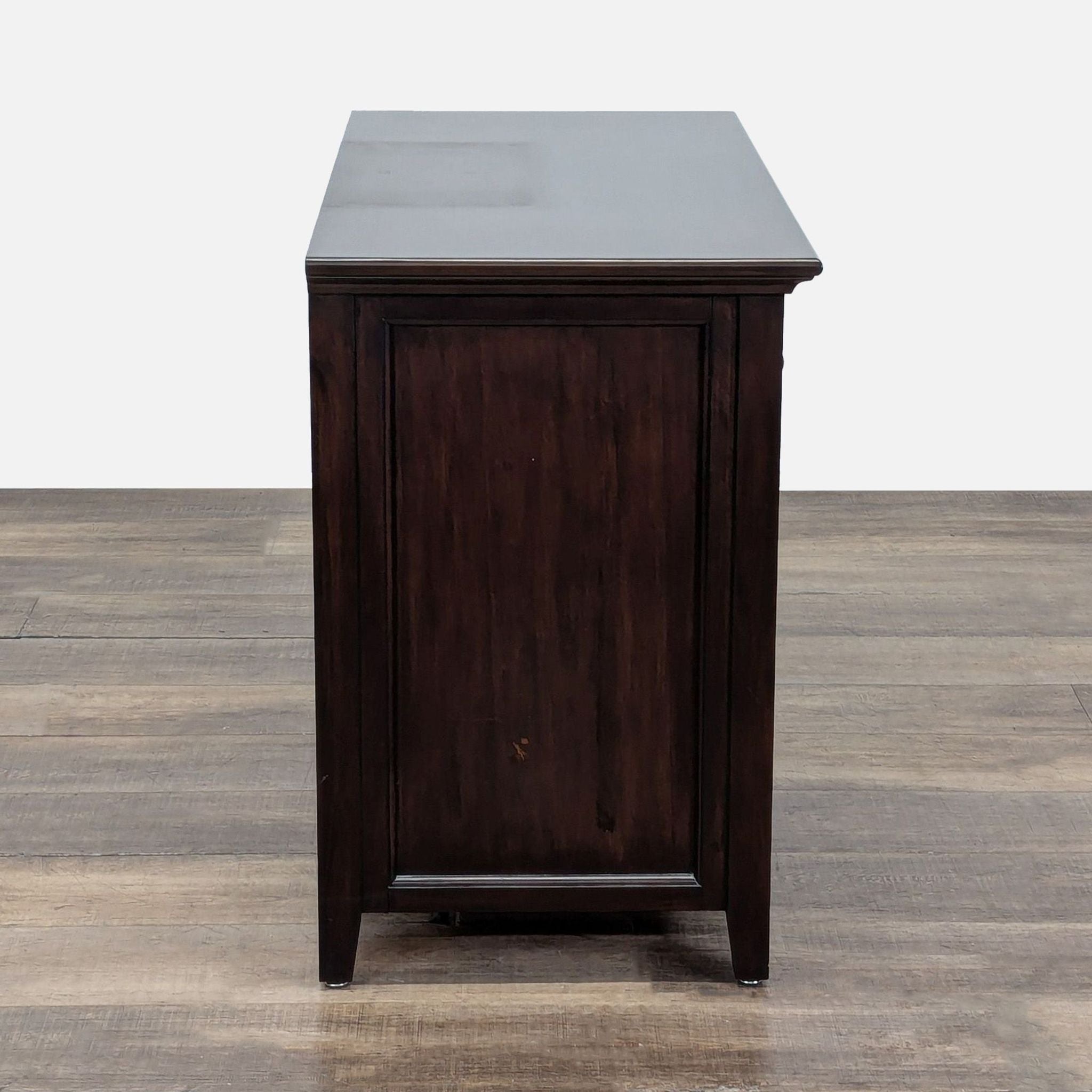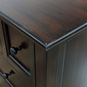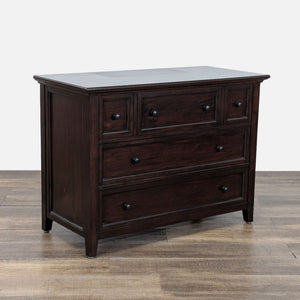 Wood dresser with with dark finish and 5 drawers with recessed panels.