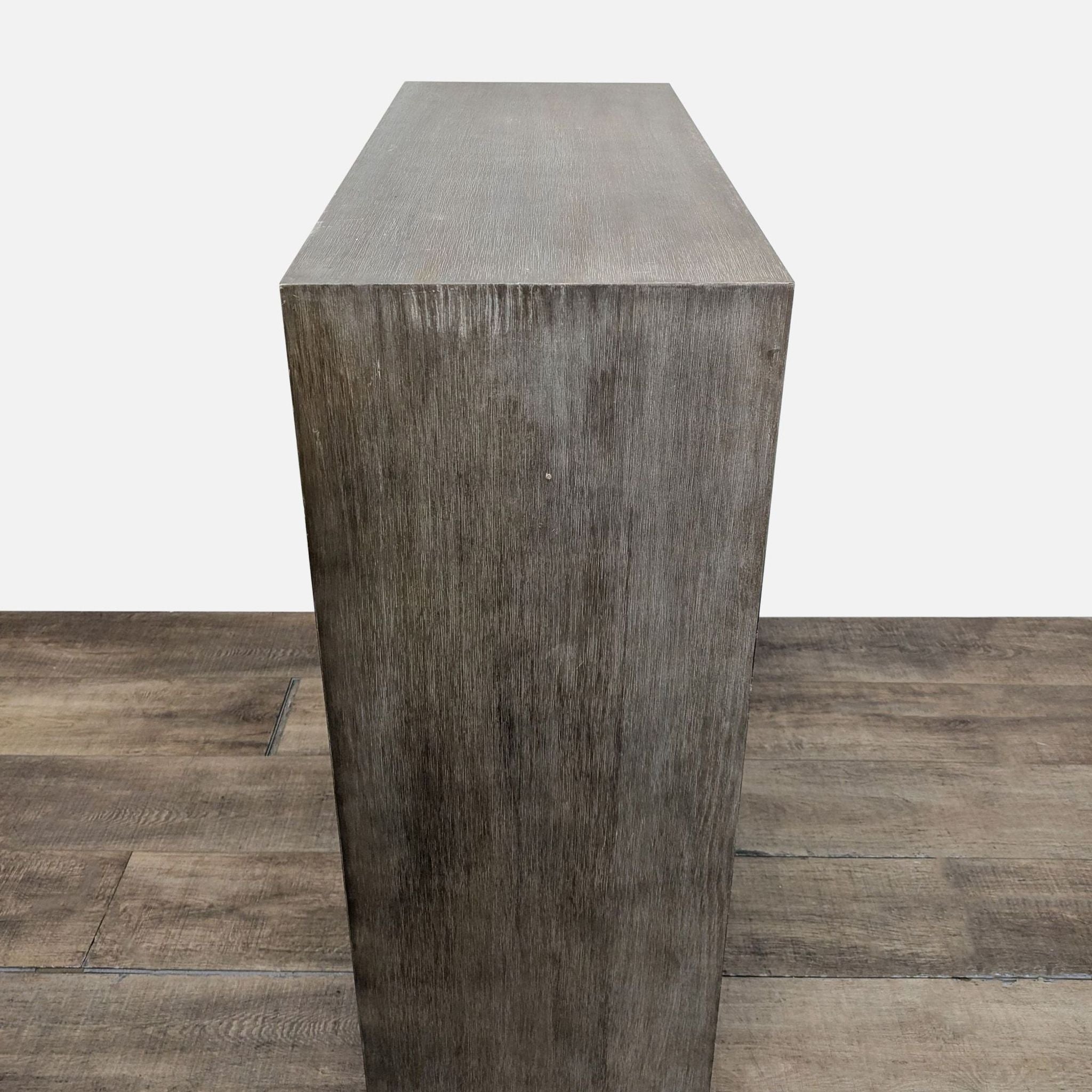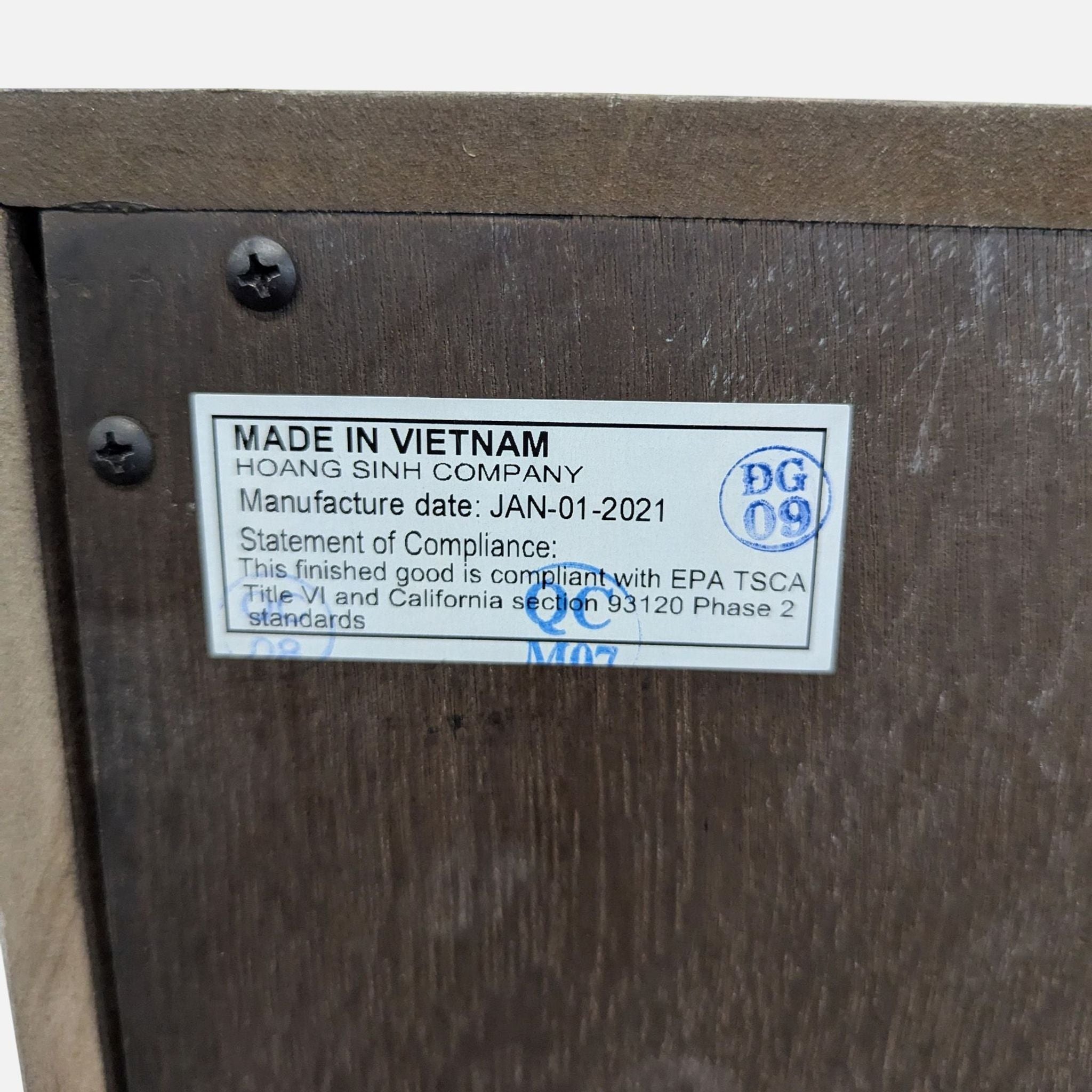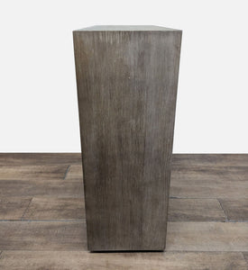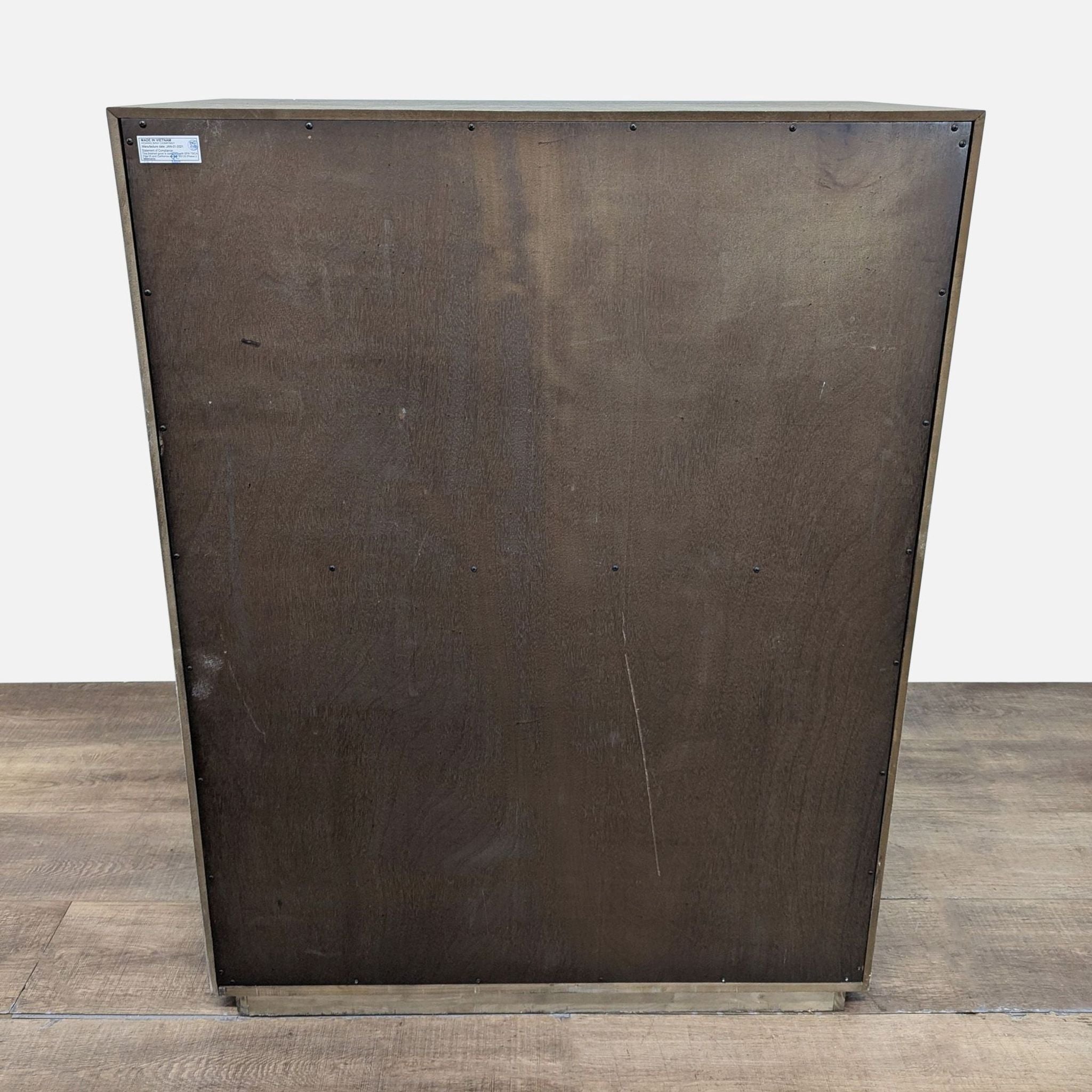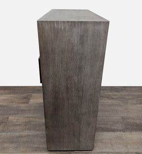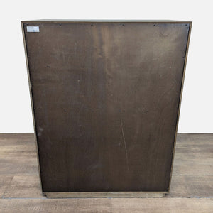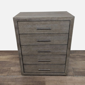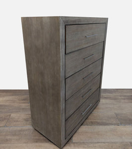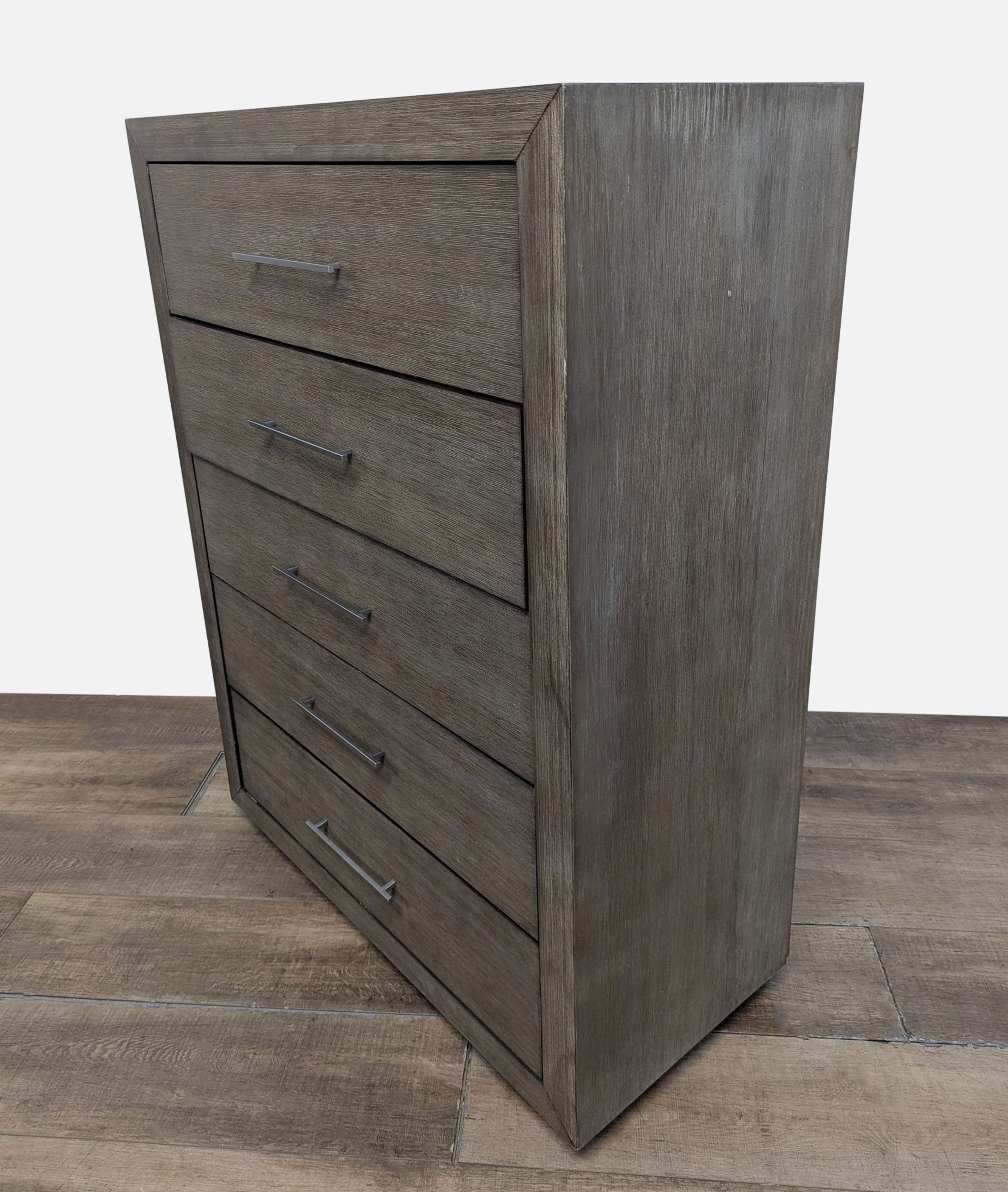 The chest features a transitional style with clean lines and a rustic dark pine finish enhanced by wire brushing which highlights the natural grain patterns. It includes five spacious drawers, providing ample storage. The drawers have slim, polished nickel or metal bar pulls.