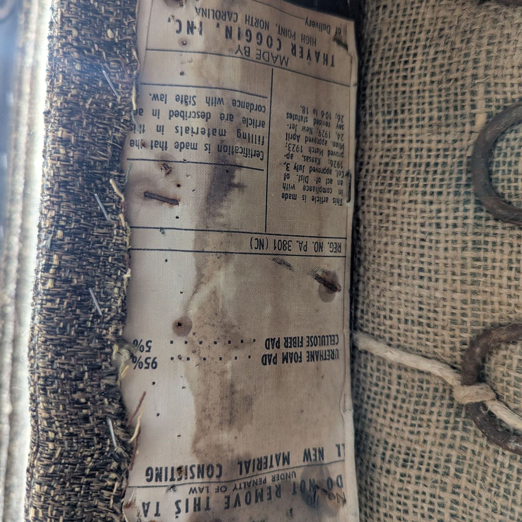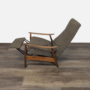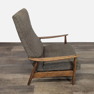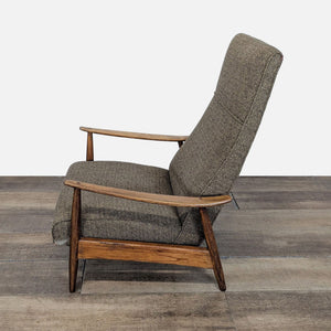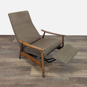 Features a solid walnut wood frame and arms, paired with a textured fabric upholstery and push back recline function.