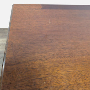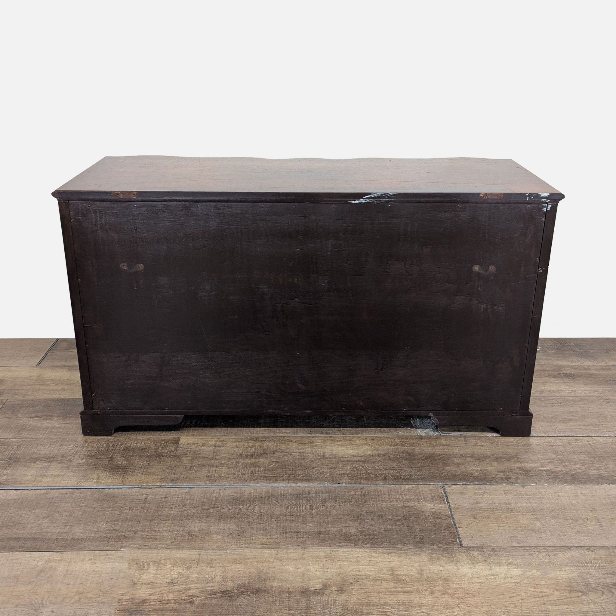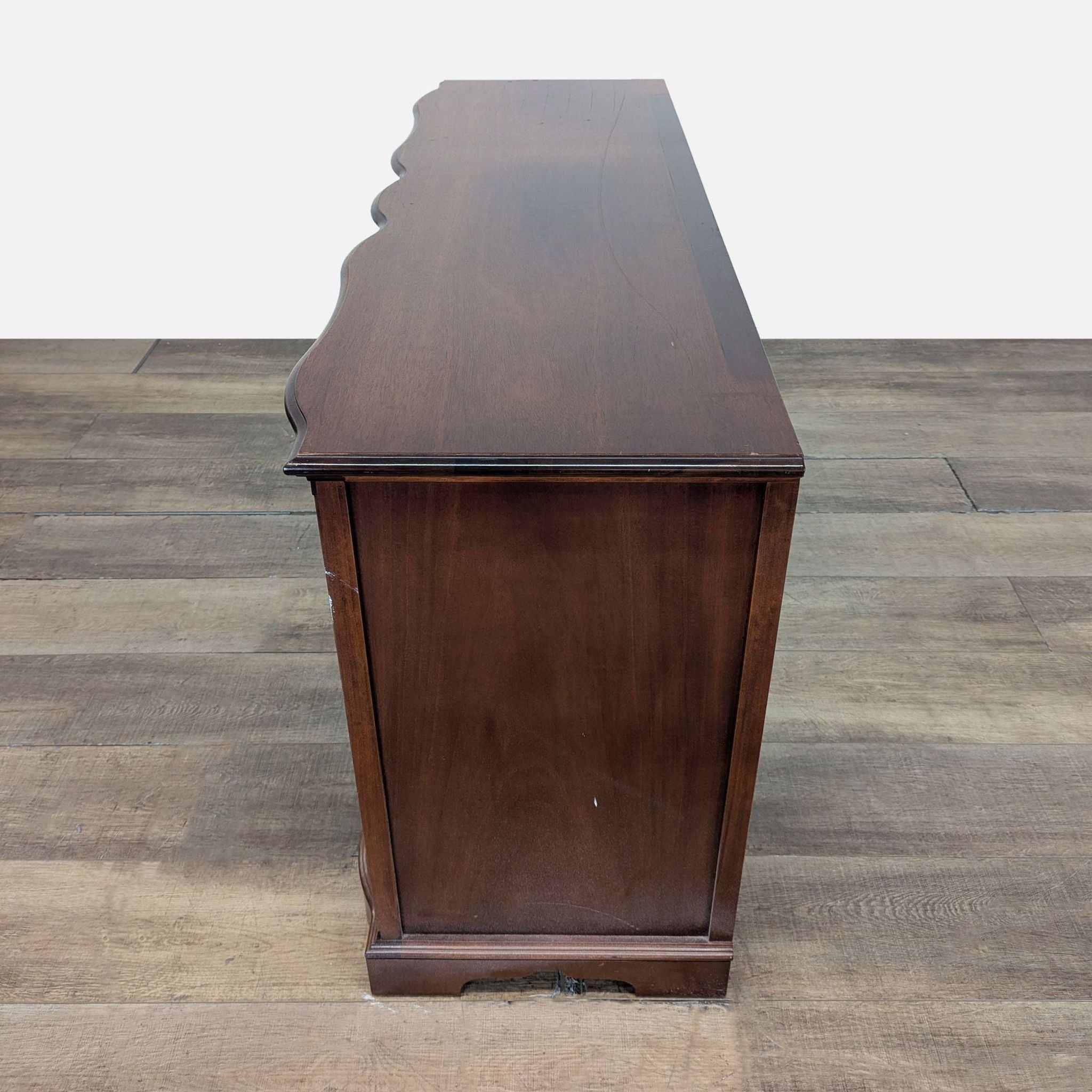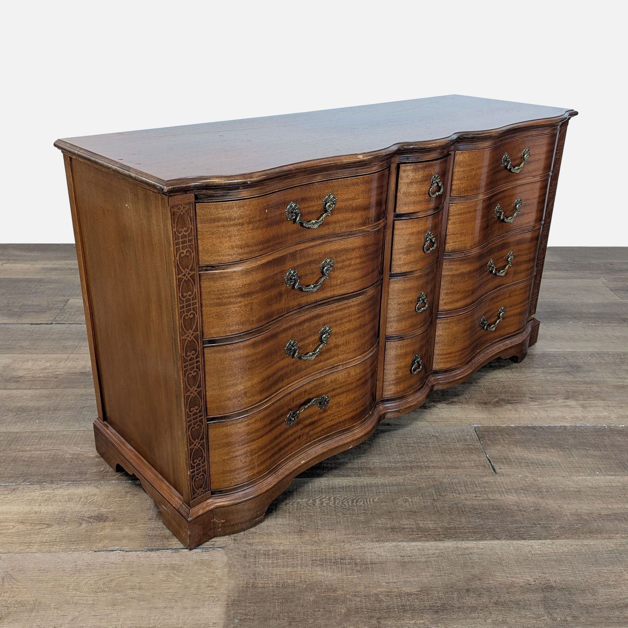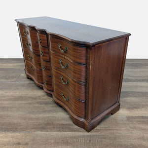 Features serpentine front with brass handles and ornate detailed trim.