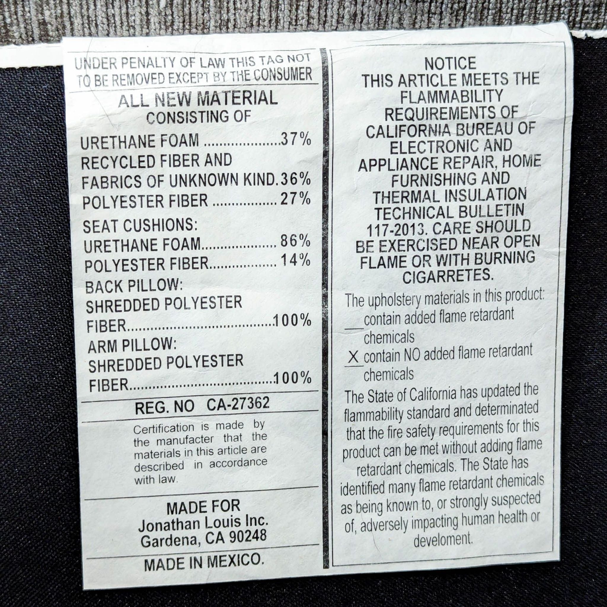 This Jonathan Louis loveseat offers comfortable seating in a modern, compact design. Upholstered in soft gray fabric, it features plush seat and back cushions along with two matching throw pillows. Its clean lines and neutral color make it easy to fit into any living room or small space. Perfect for relaxing or hosting guests.