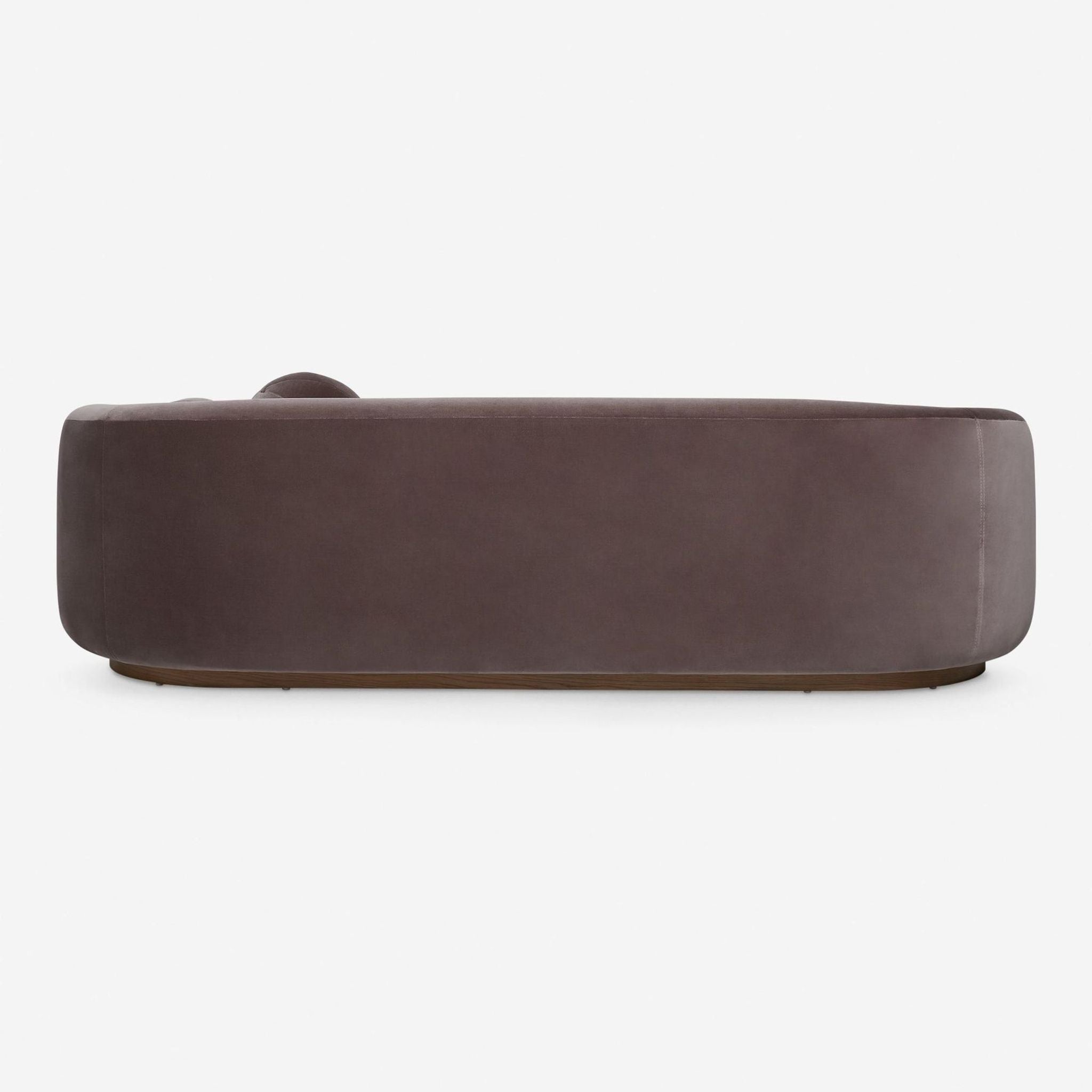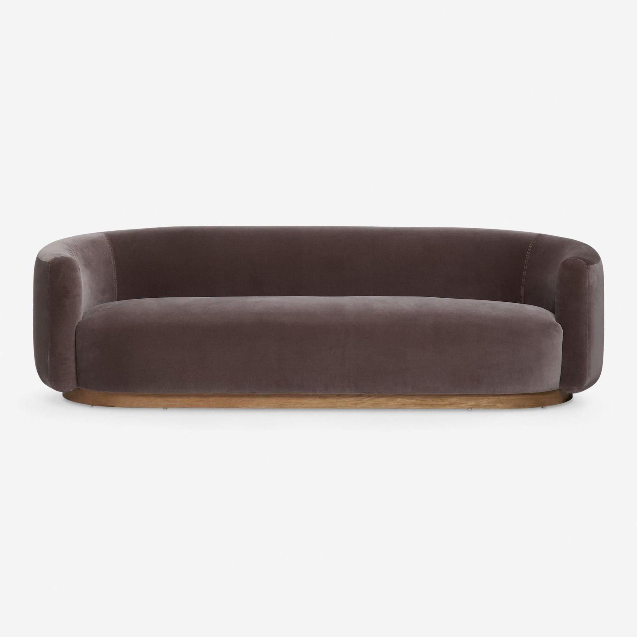 This 3-seat sofa from Lulu and Georgia features a sleek, modern design with soft velvet upholstery and a sturdy wooden base. The curved back and armrests offer a cozy and inviting feel. Comes with two round accent pillows for extra comfort and style. Perfect for any living room.