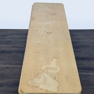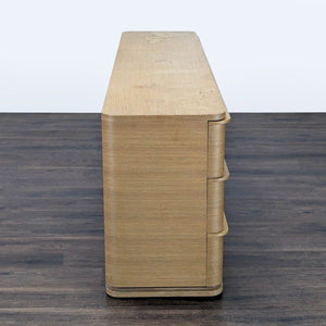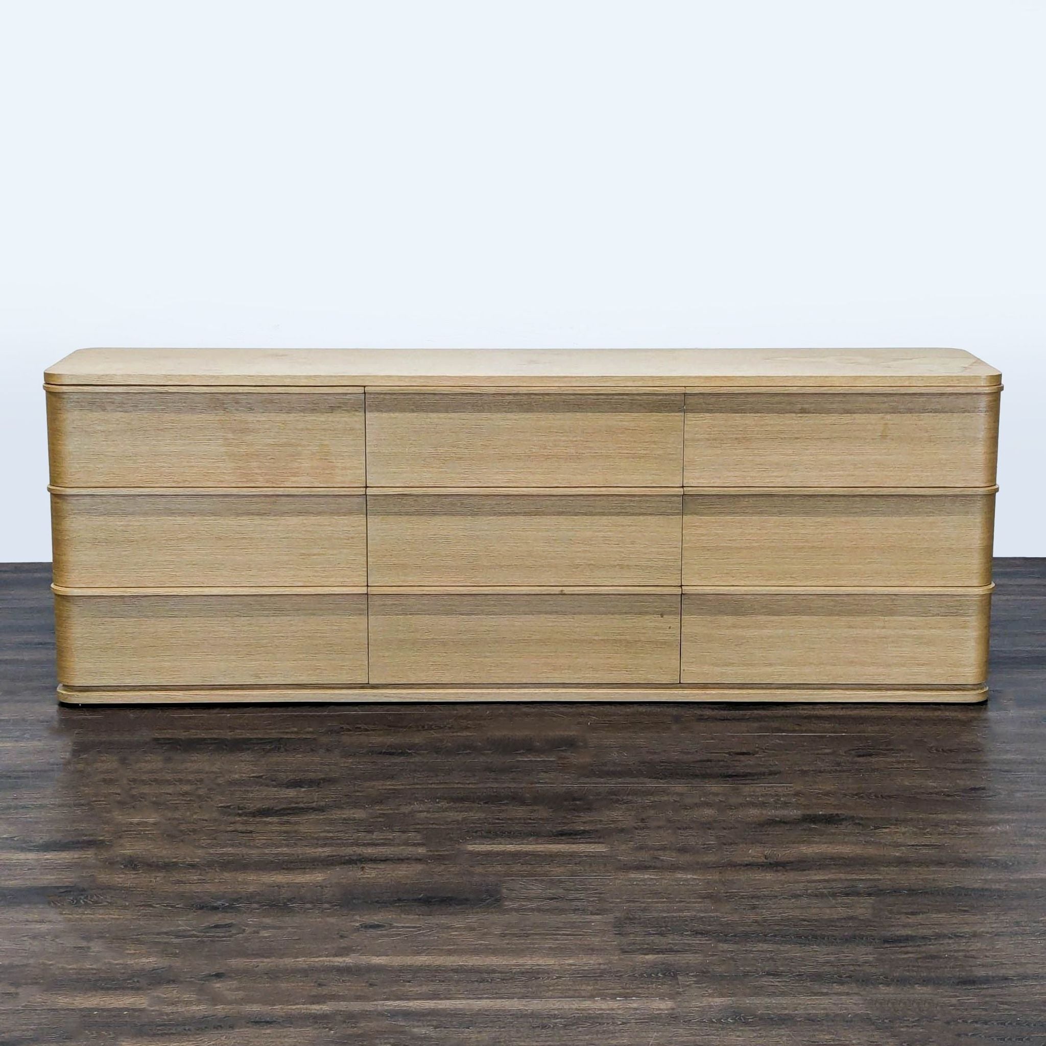 This Restoration Hardware dresser features a sleek modern design with a light wood finish. It offers plenty of storage with nine spacious drawers and smooth rounded corners for a clean look. Perfect for bedrooms or living spaces, this sturdy piece combines style and function for any home.