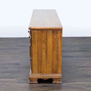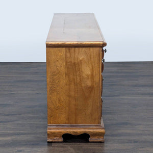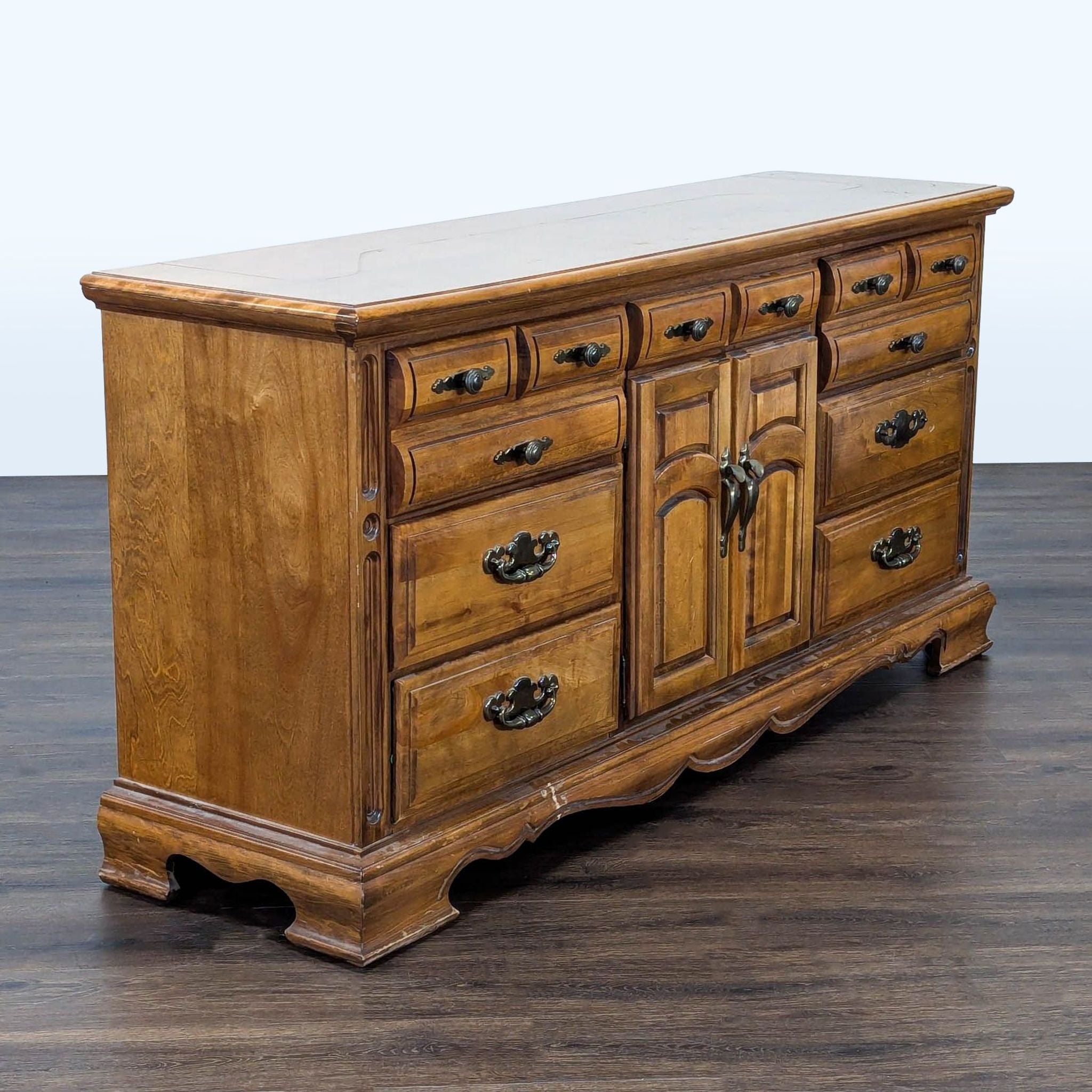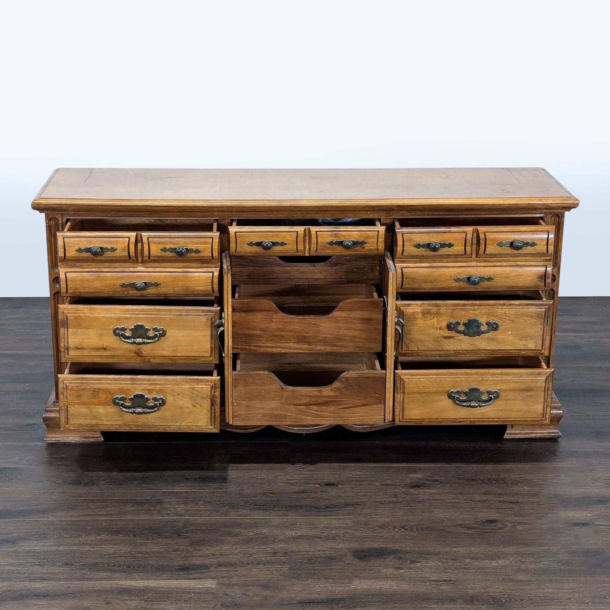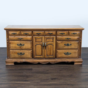 This sturdy wood dresser offers plenty of storage with ten drawers and a central cabinet. The classic natural finish and vintage-style metal handles make it a stylish and practical piece for any bedroom. All drawers slide smoothly and the cabinet doors open to reveal extra storage space. Perfect for clothes, linens, or accessories.