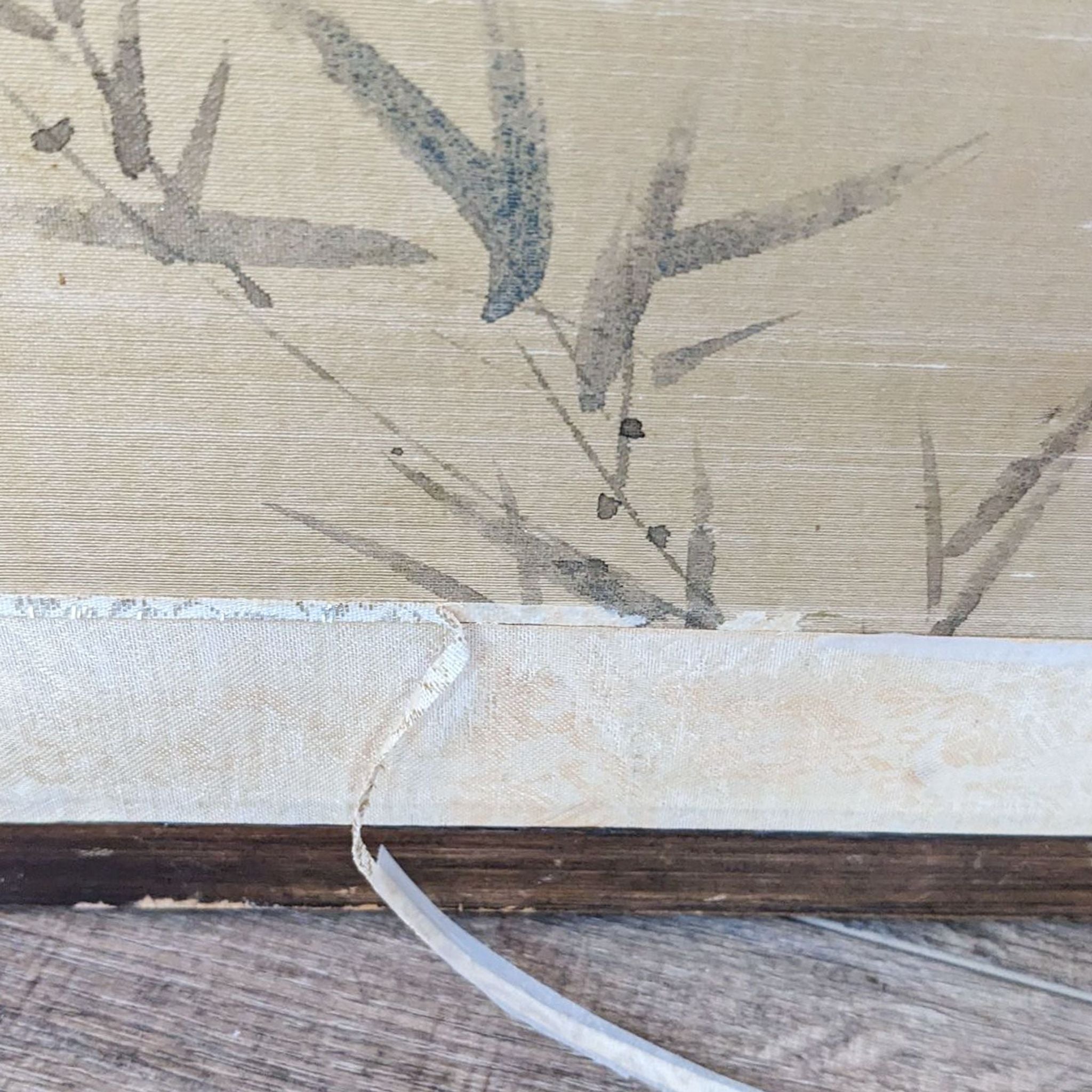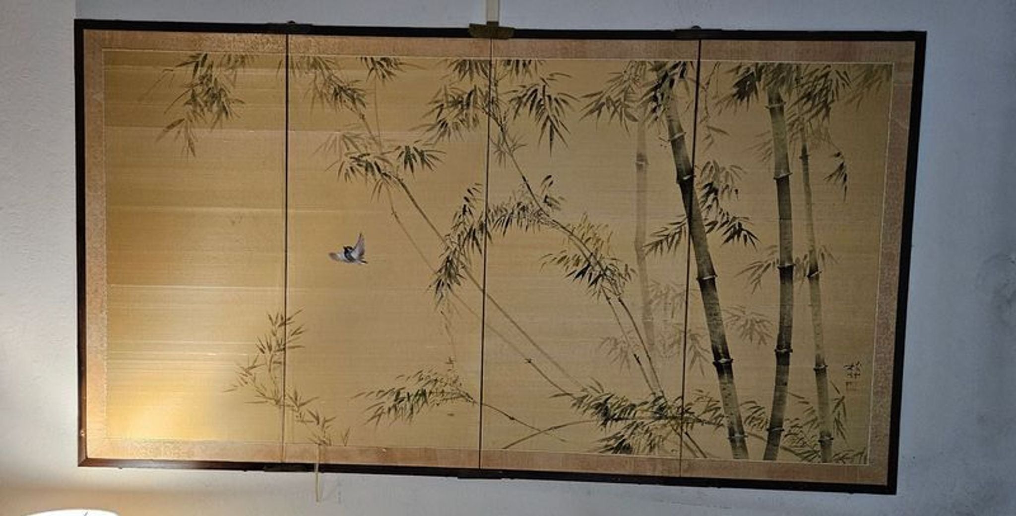Traditional Hand Painted Asian Silk Folding Screen With Bamboo Floral Scene Can Be Wall Art Or Divider