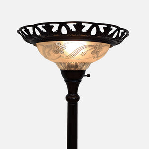This antique style floor lamp features a bronze metal base and with a glass shade designed with an embossed floral pattern and leaf lattice at the top.
