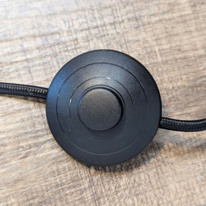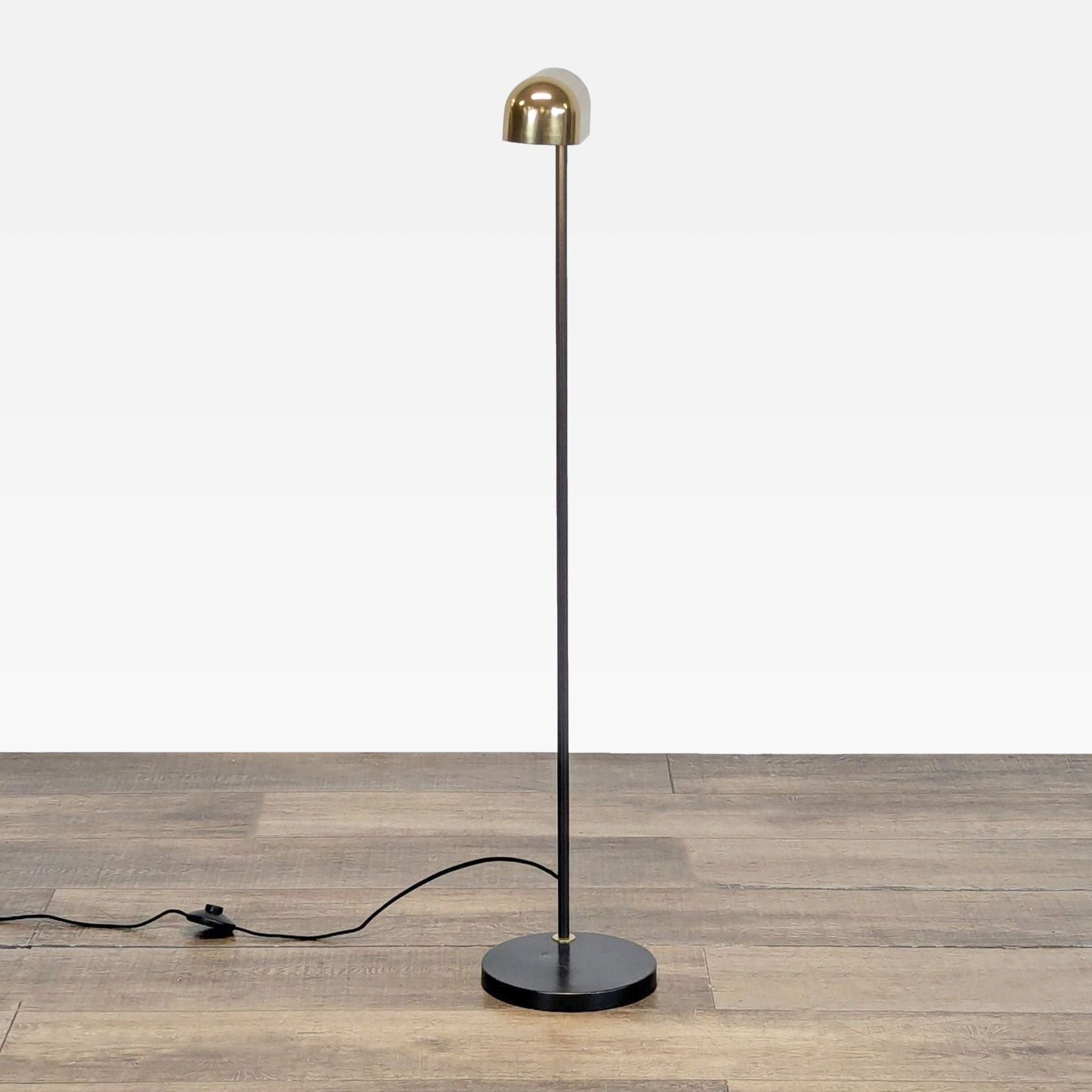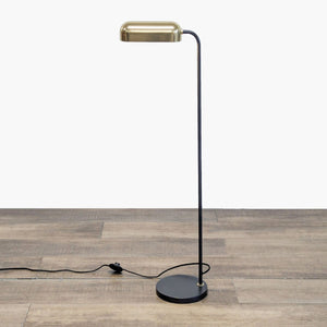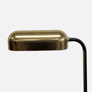 This floor lamp features a blackened bronze body and a brass shade.