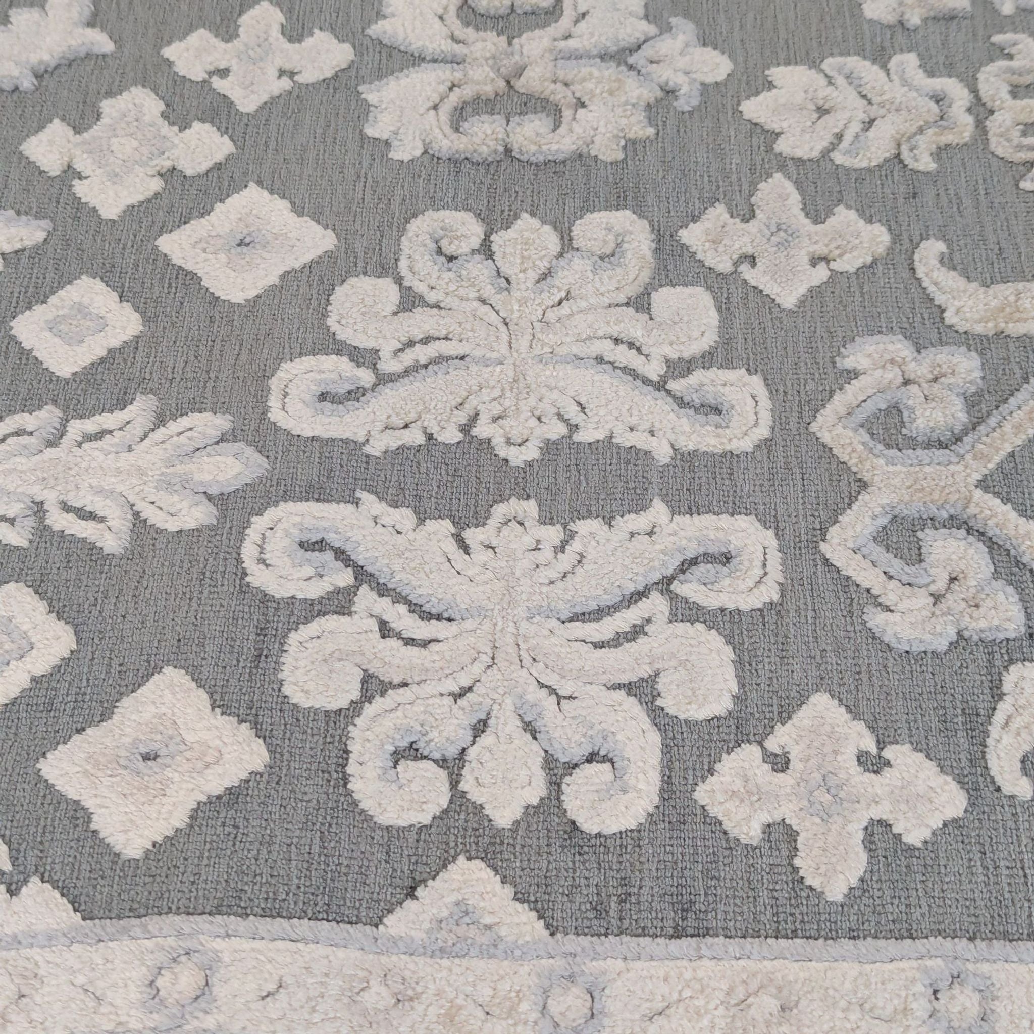 Features a high-low texture and is woven from a rayon and acrylic blend area with an intricate damask-inspired pattern.