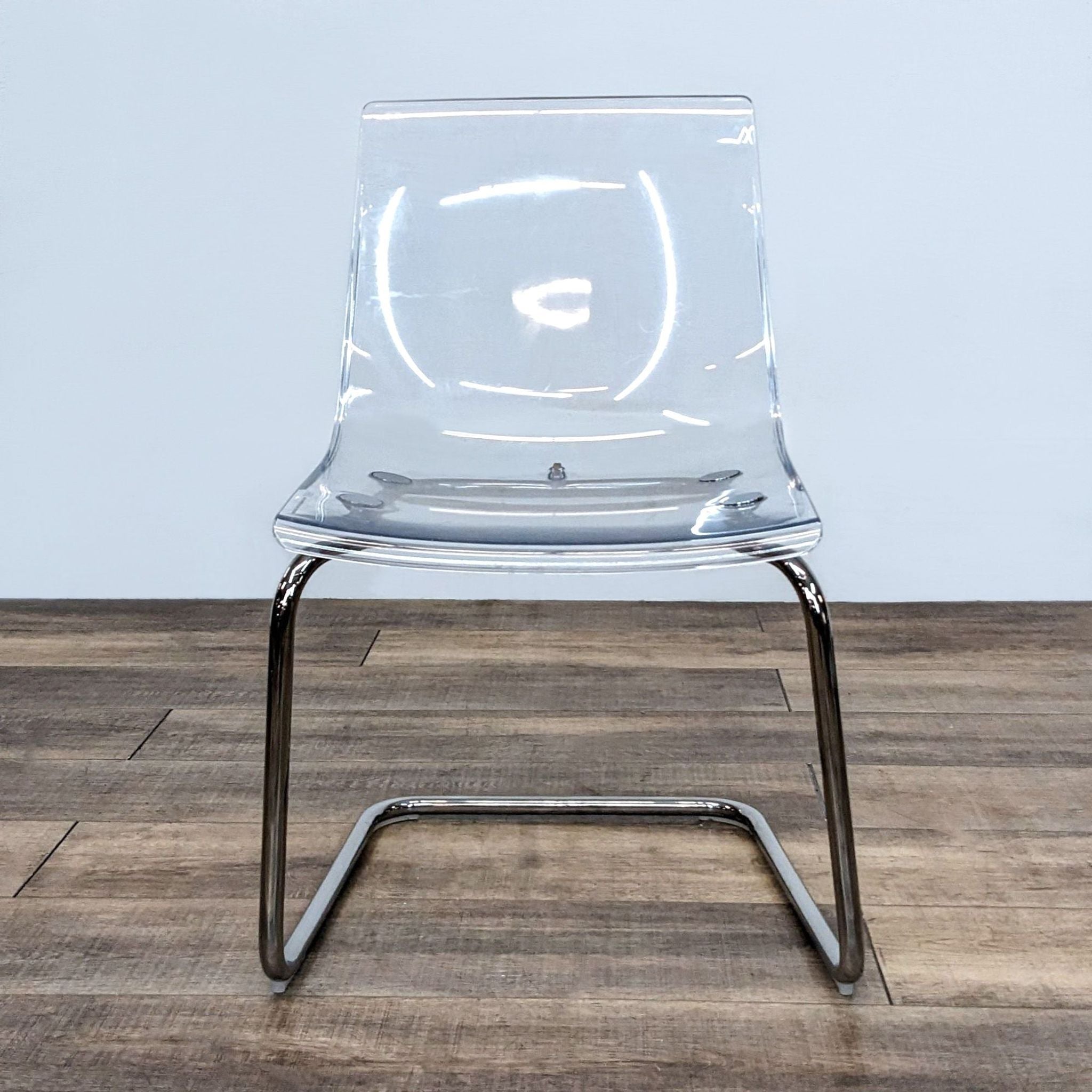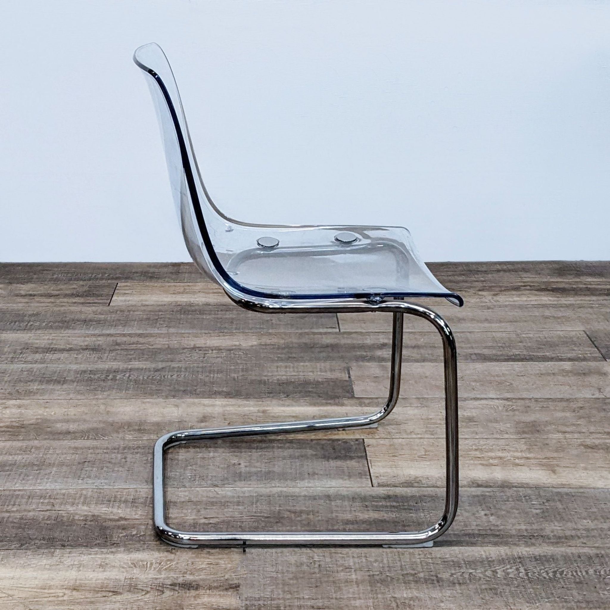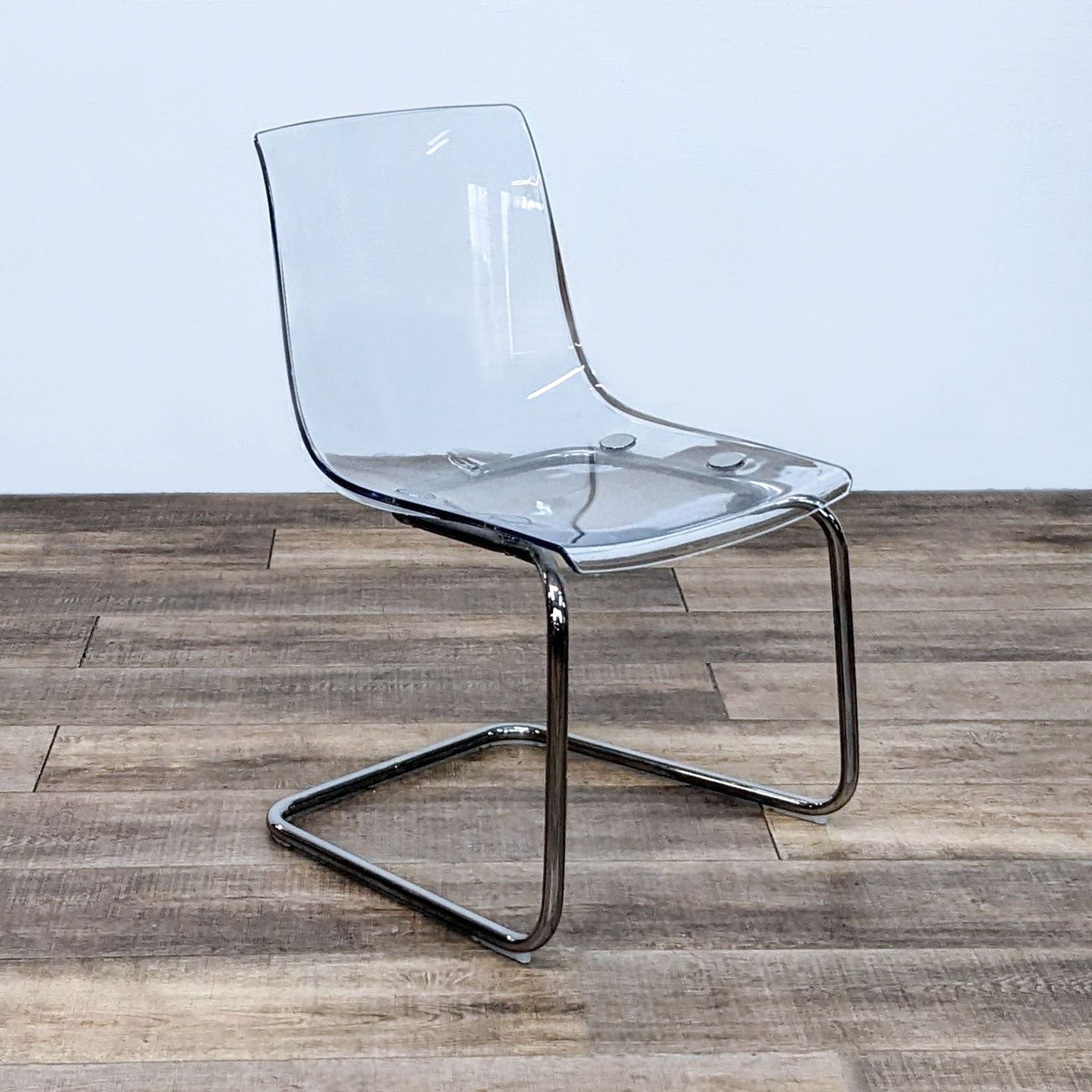The Tobias dining chair by IKEA is transparent and mirrors its surroundings. The seat is flexible and features a chrome plated base.