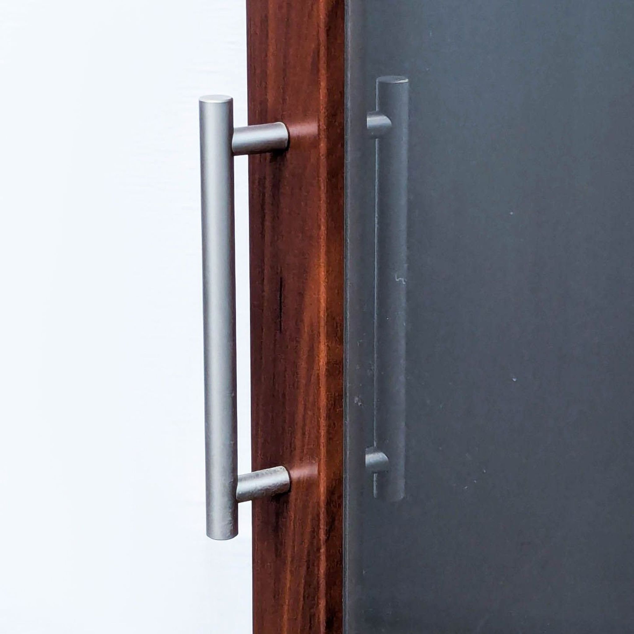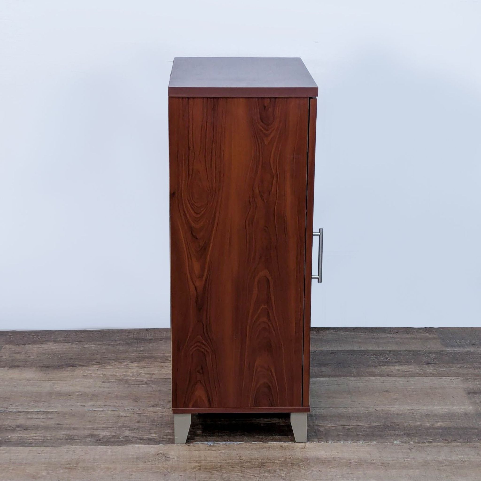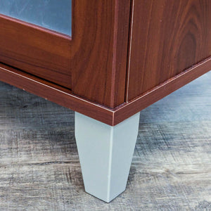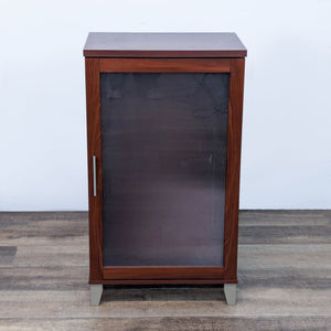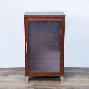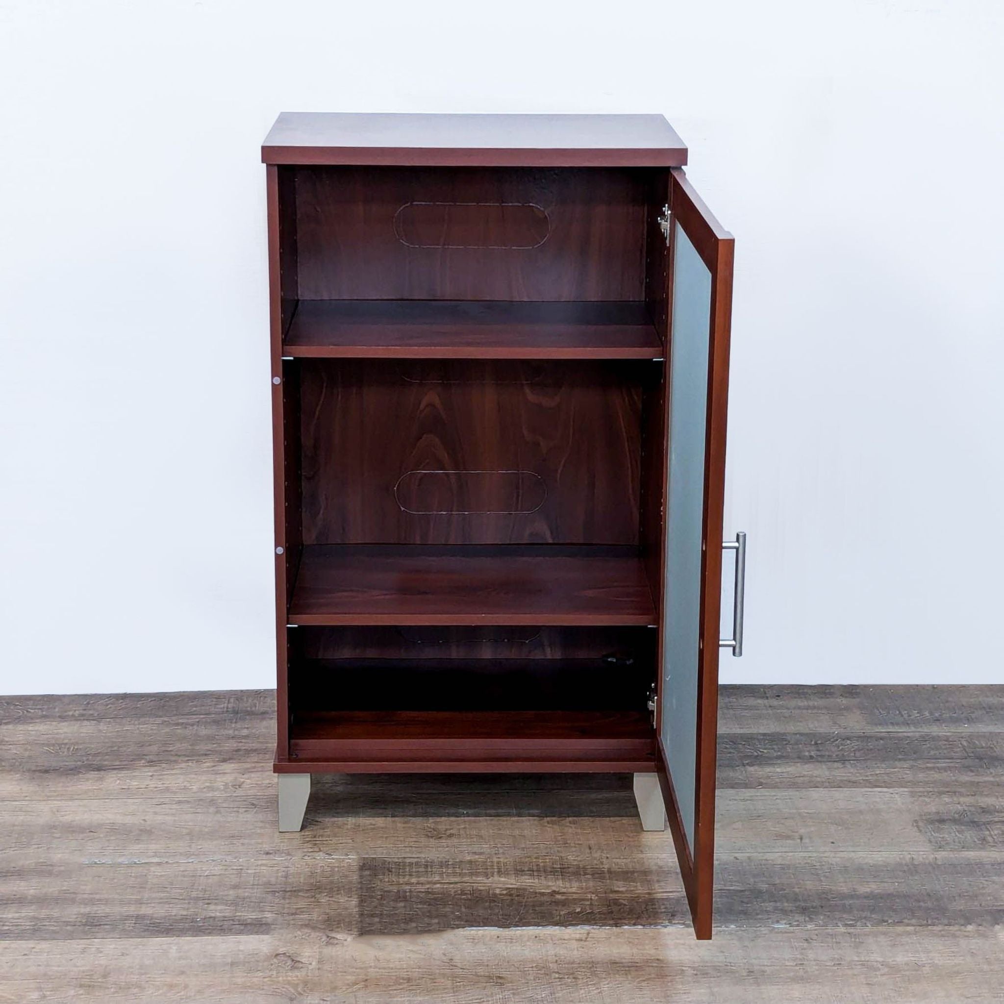 Three adjustable shelves, cord management and ventilation slots, and frosted glass door in a Hansen cherry finish.