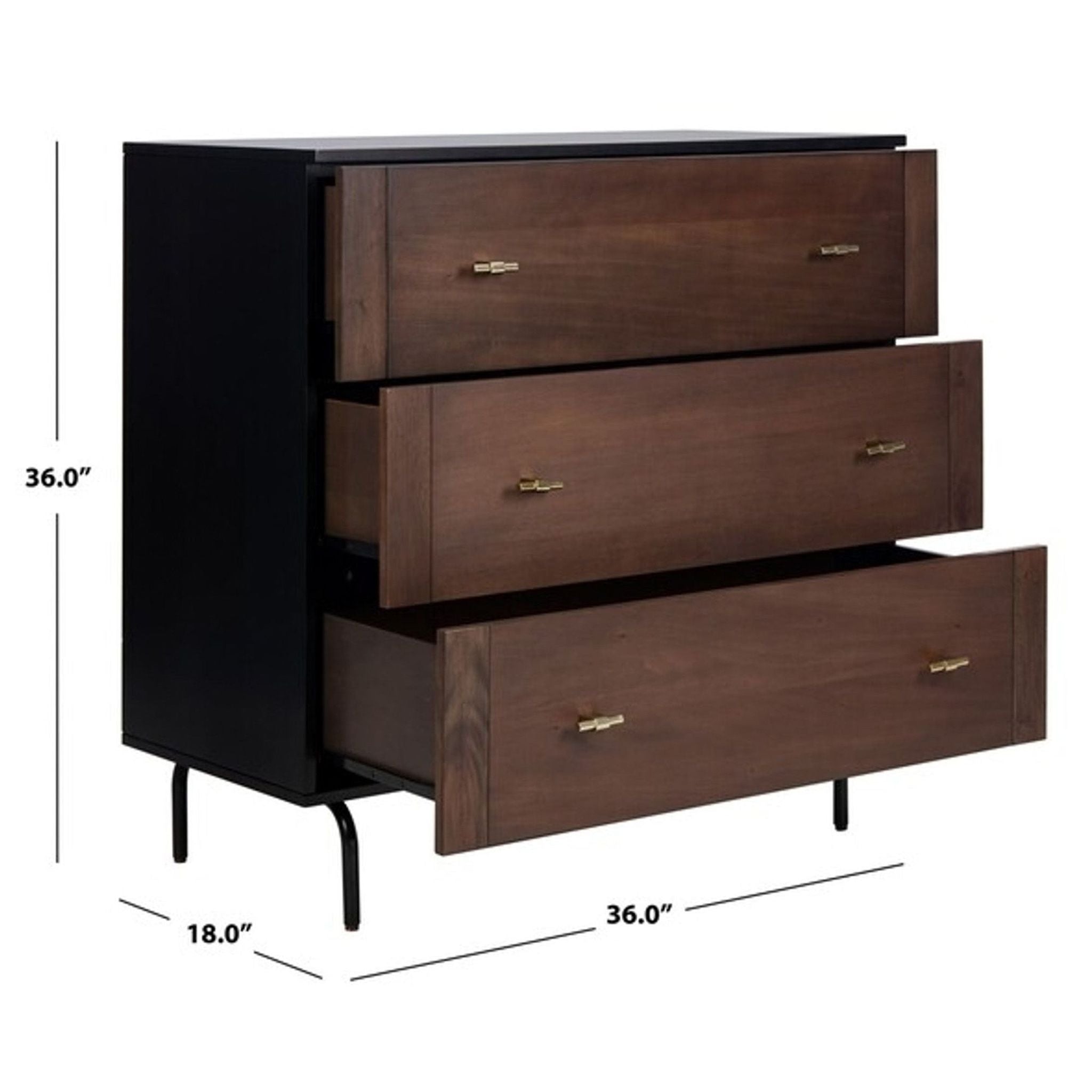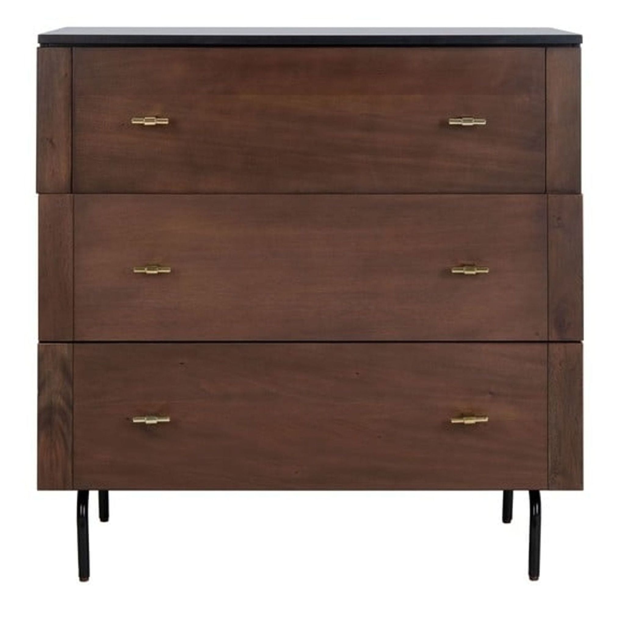 Clean minimalist style with black metal legs and three drawers with modern gold tone pulls.