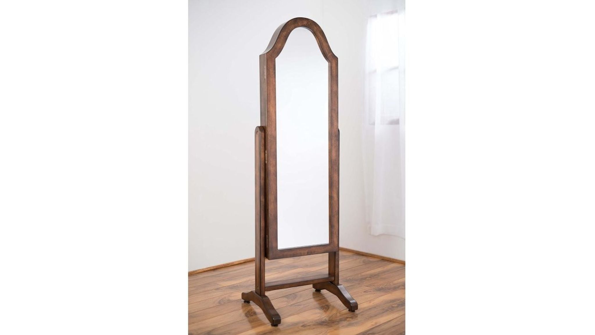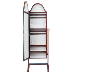 Full length mirror in a walnut finish, fully lined with plush, anti-tarnish felt. The Cabinet has 22 metal necklace hooks, 2 wooden earring bars and 6 smartly divided compartments.