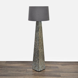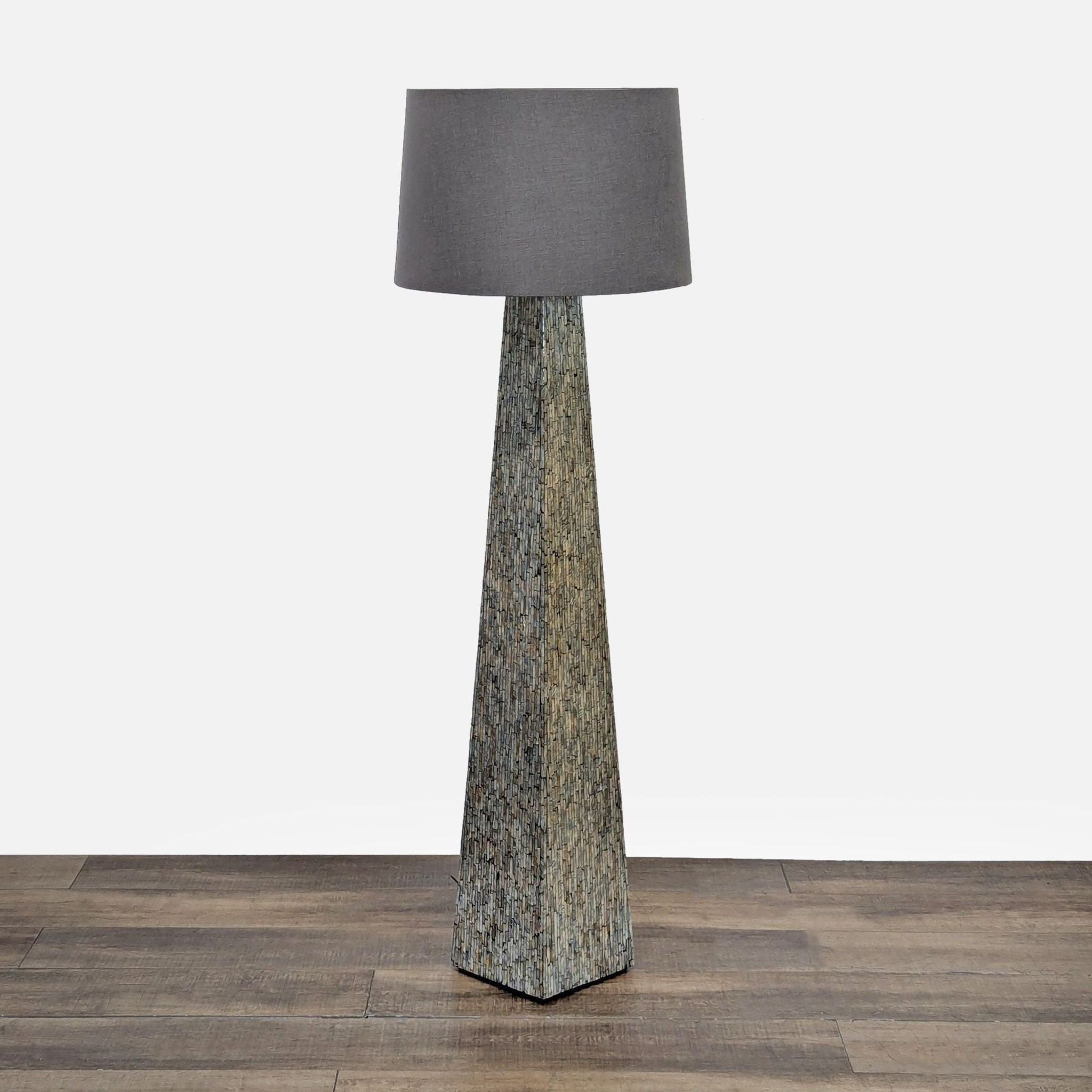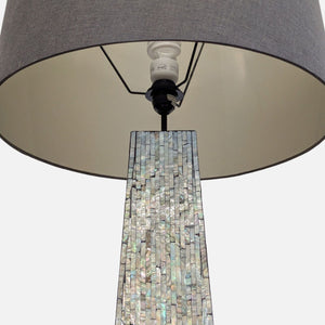 This floor lamp features a tall, tapered base adorned with a mosaic of shimmering mother-of-pearl pieces, giving it a rich, iridescent texture. It is topped with a classic drum-shaped shade.