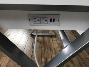 Bearing X form metal legs and hardware, with a single drawer. Electrified. A sleek design for an office space.