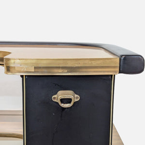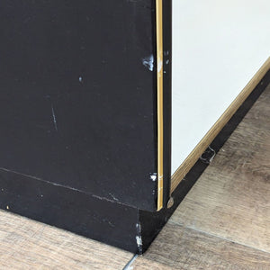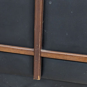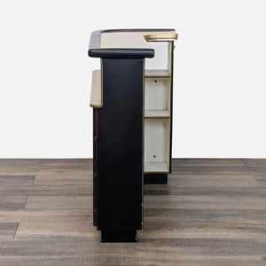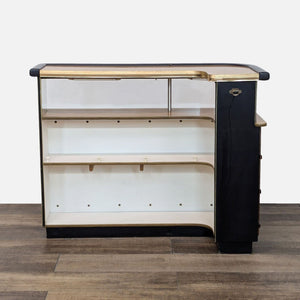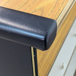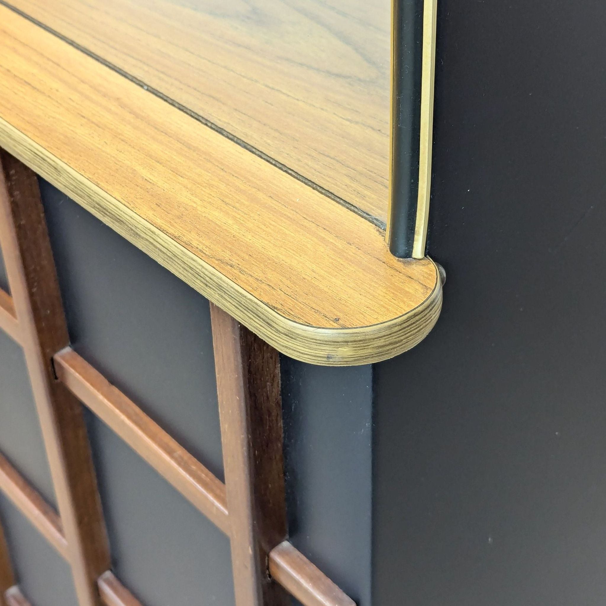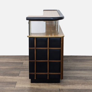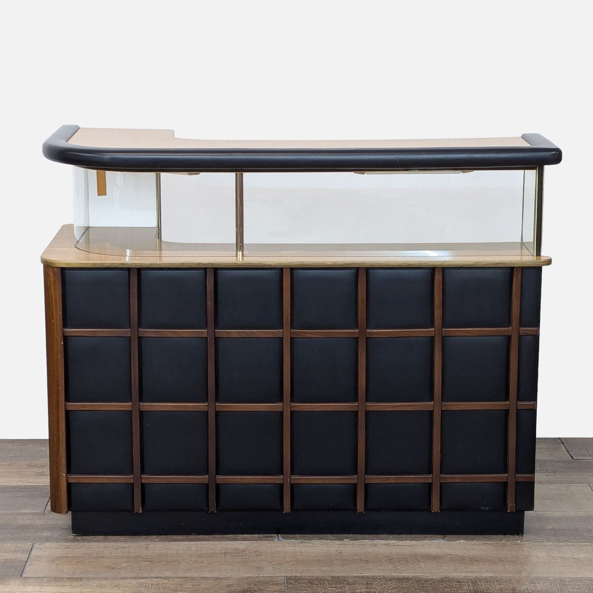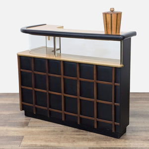 Wooden grid paneling and glass display area between laminate top and upper shelf