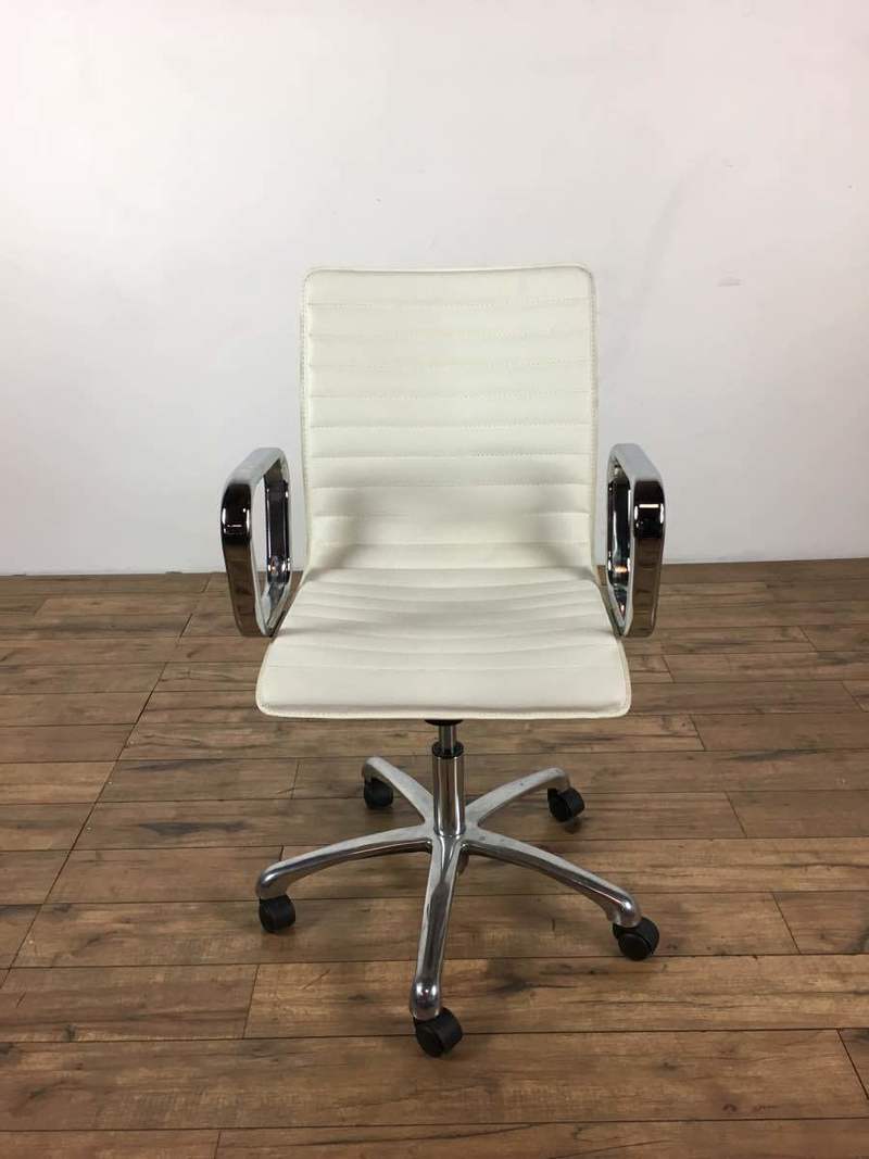 Mid Century Modern Eames Style Office Chair. Covered in luxurious white leather and accented with sleek gleaming chrome, this desk chair is seated on casters for easy movement.