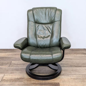 Palliser contemporary forest green leather recliner and ottoman with bentwood supports over a circular base.
