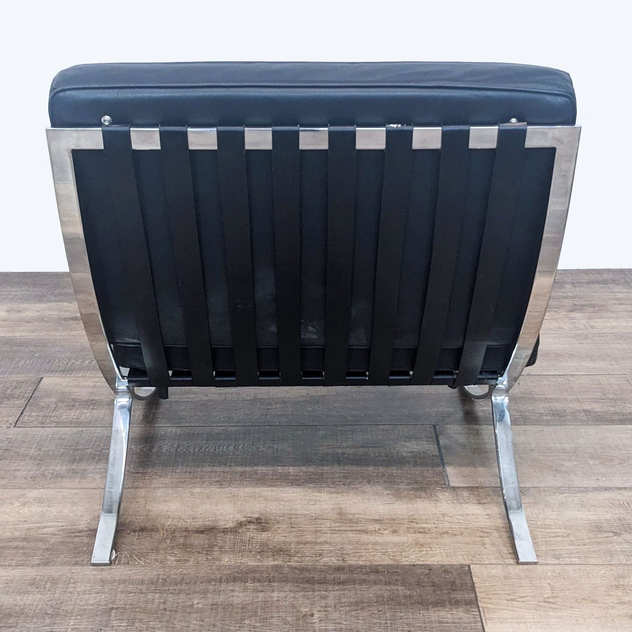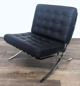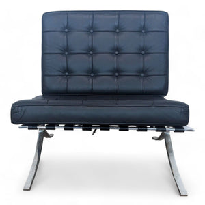 Modern lounge chair stoked like the popular Barcelona Chair with a chromed metal base and leather tufted cushions held onto the frame with leather straps.