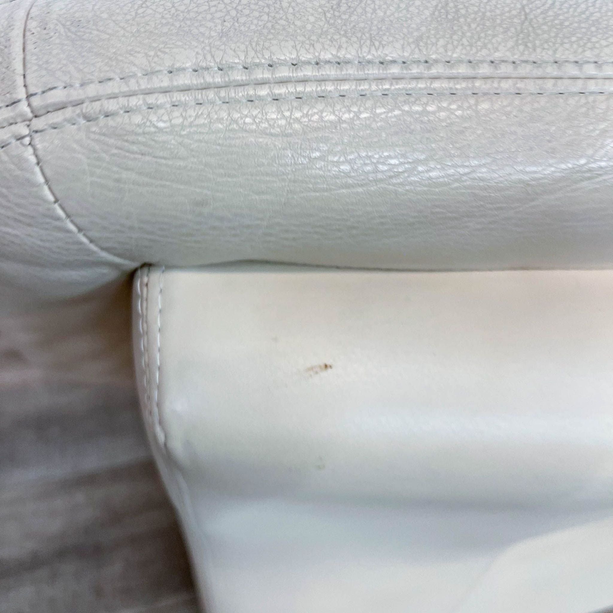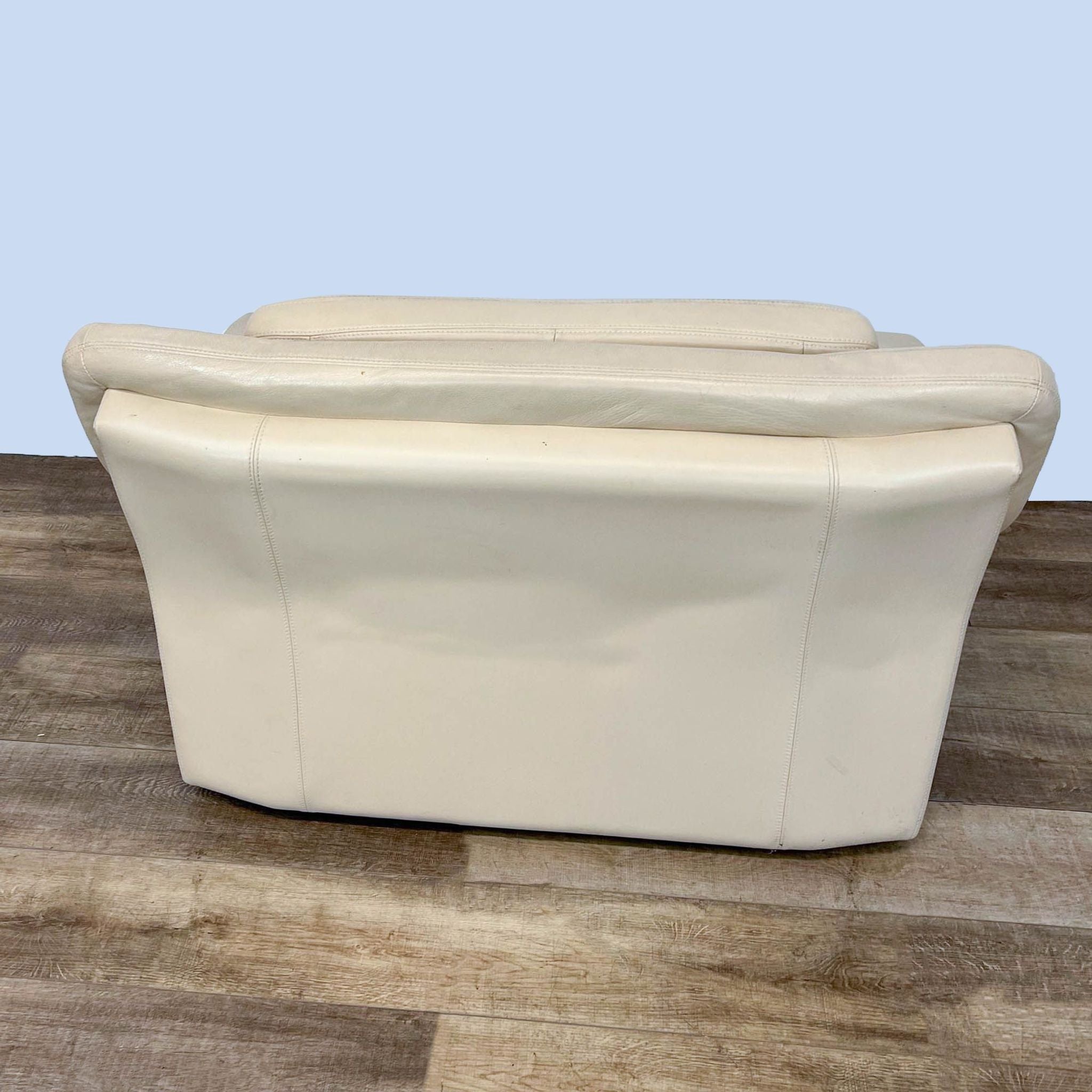 This contemporary lounge chair has soft cushioning with wide armrests and upholstered in cream leather with wood feet.