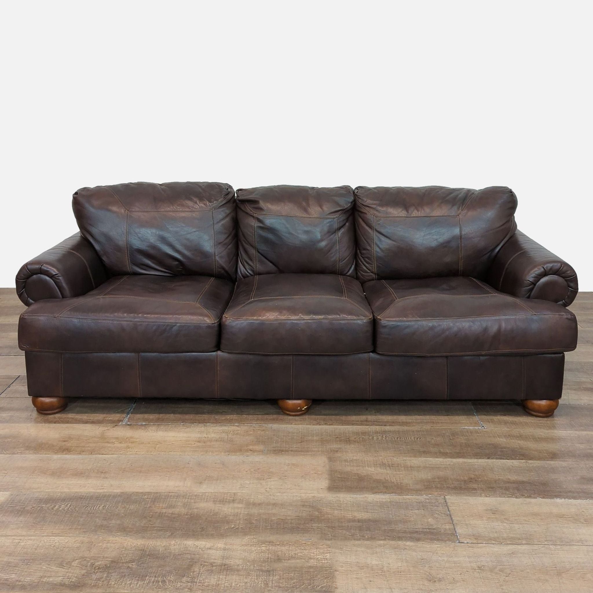 Traditional sofa with leather upholstery, plush cushions, wood feet and rolled arms.