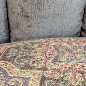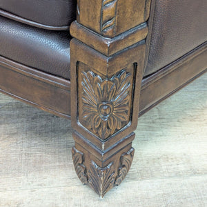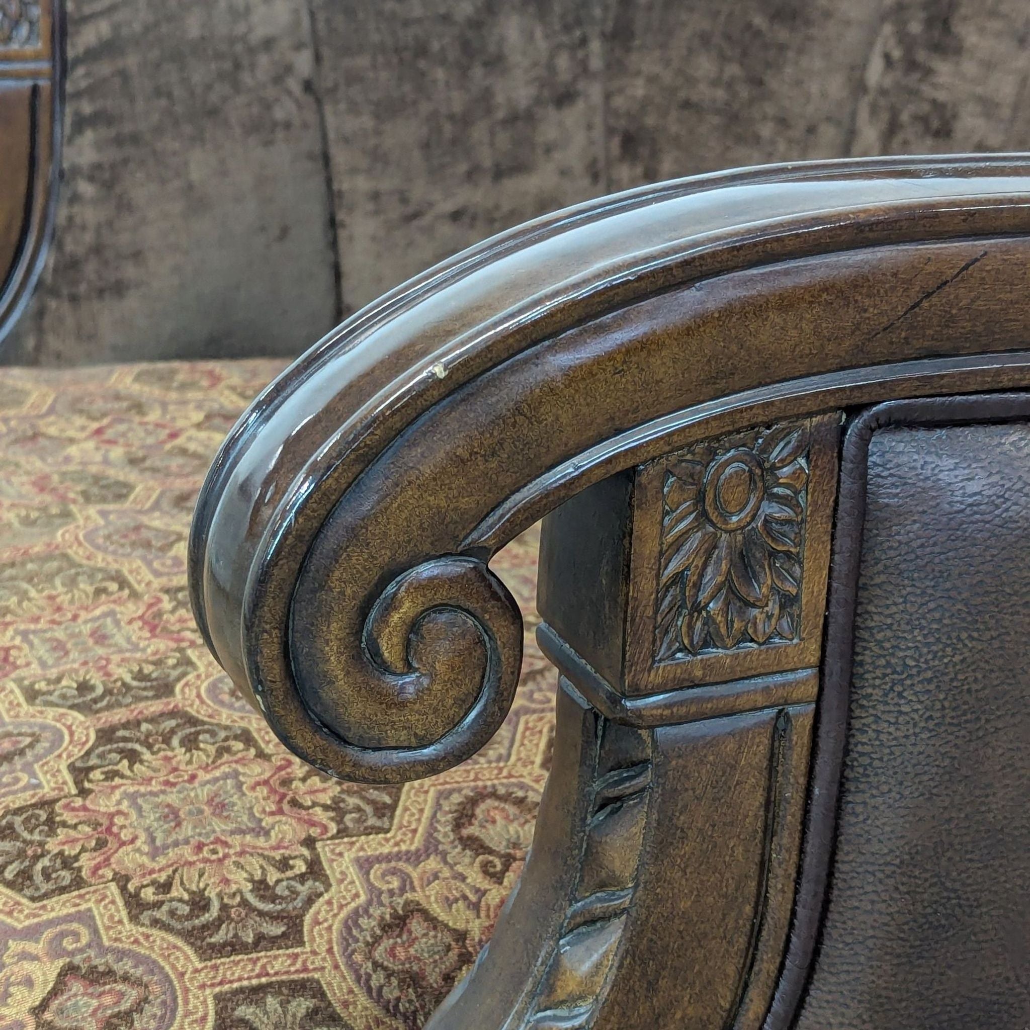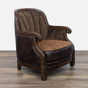 This lounge chair features intricate ravings in the wood frame with a tufted back with leather, velvet and tapestry upholstery.