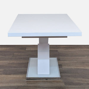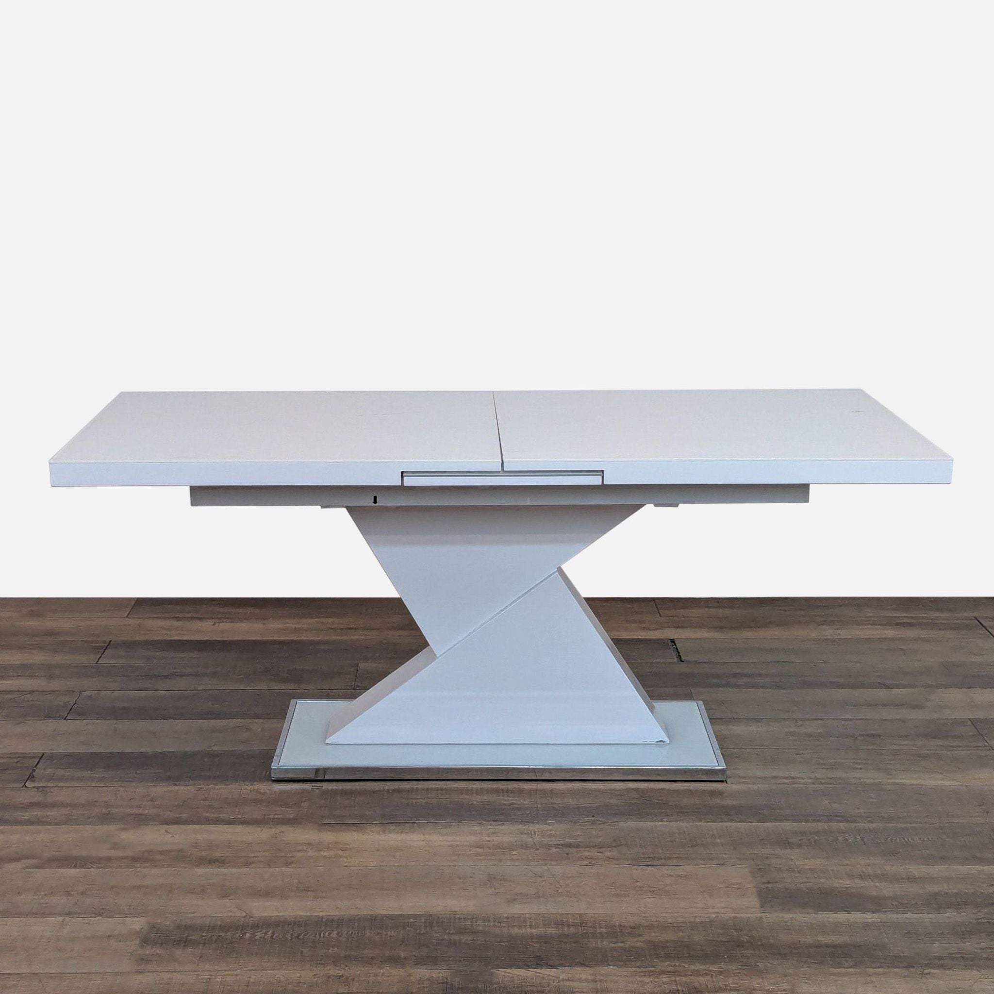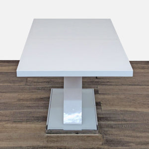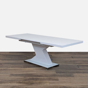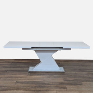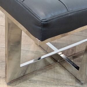 This dining set includes a modern expandable dining table with four upholstered chairs with metal frames and a matching bench.