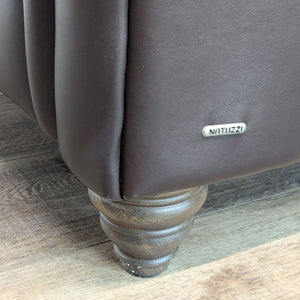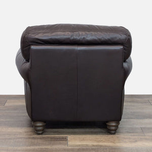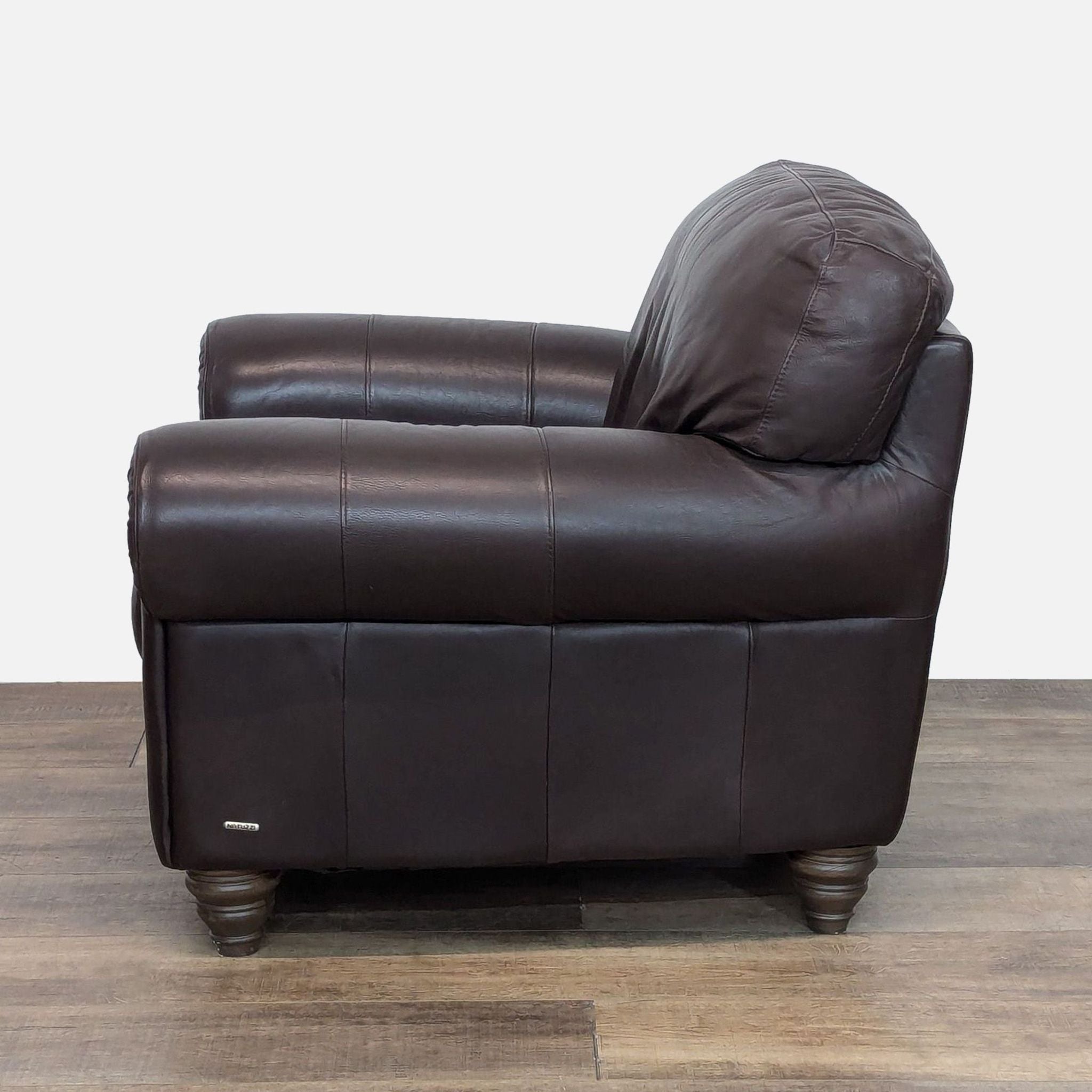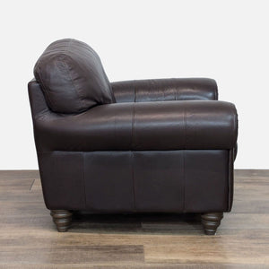 Features rolled arms, genuine leather upholstery and turned wood feet.