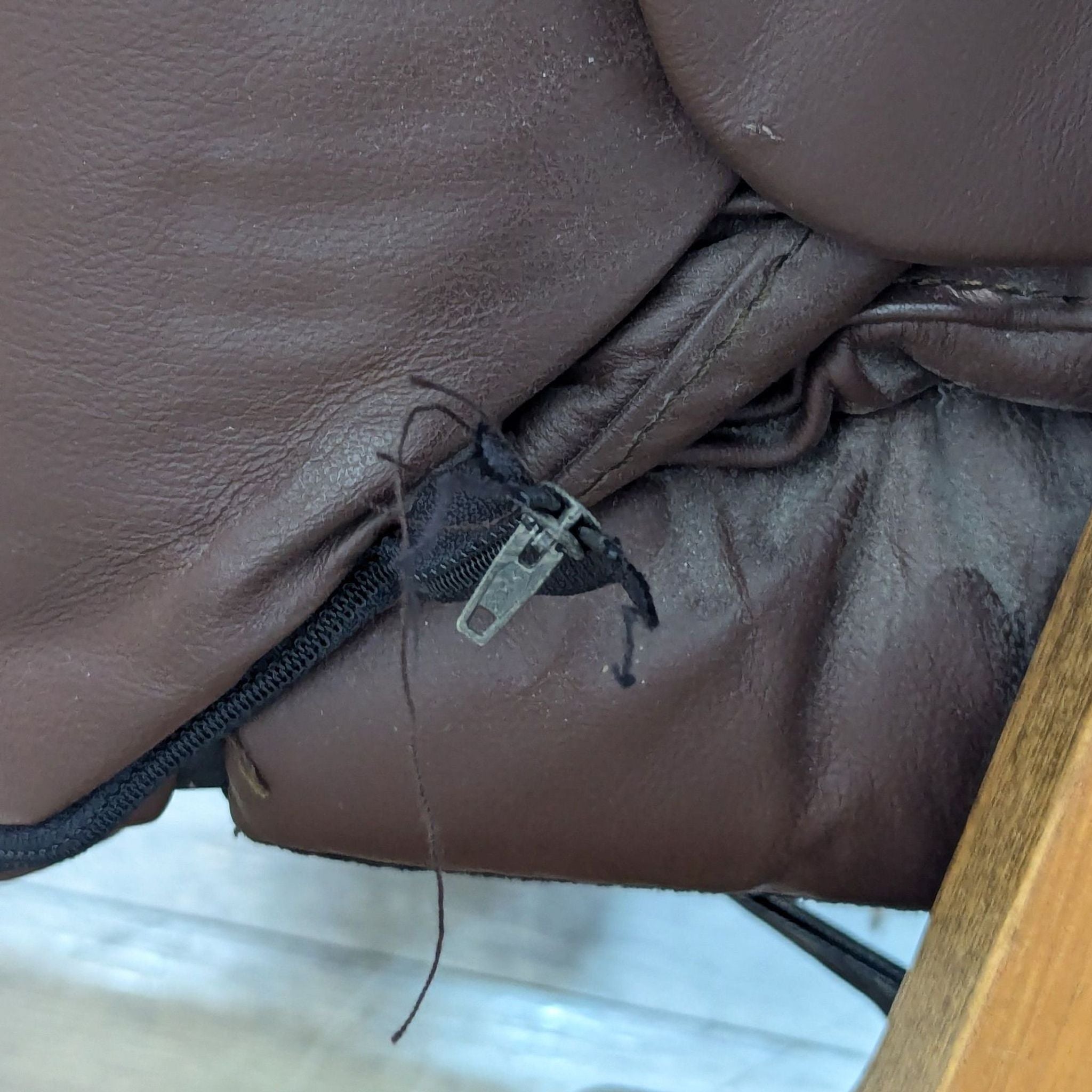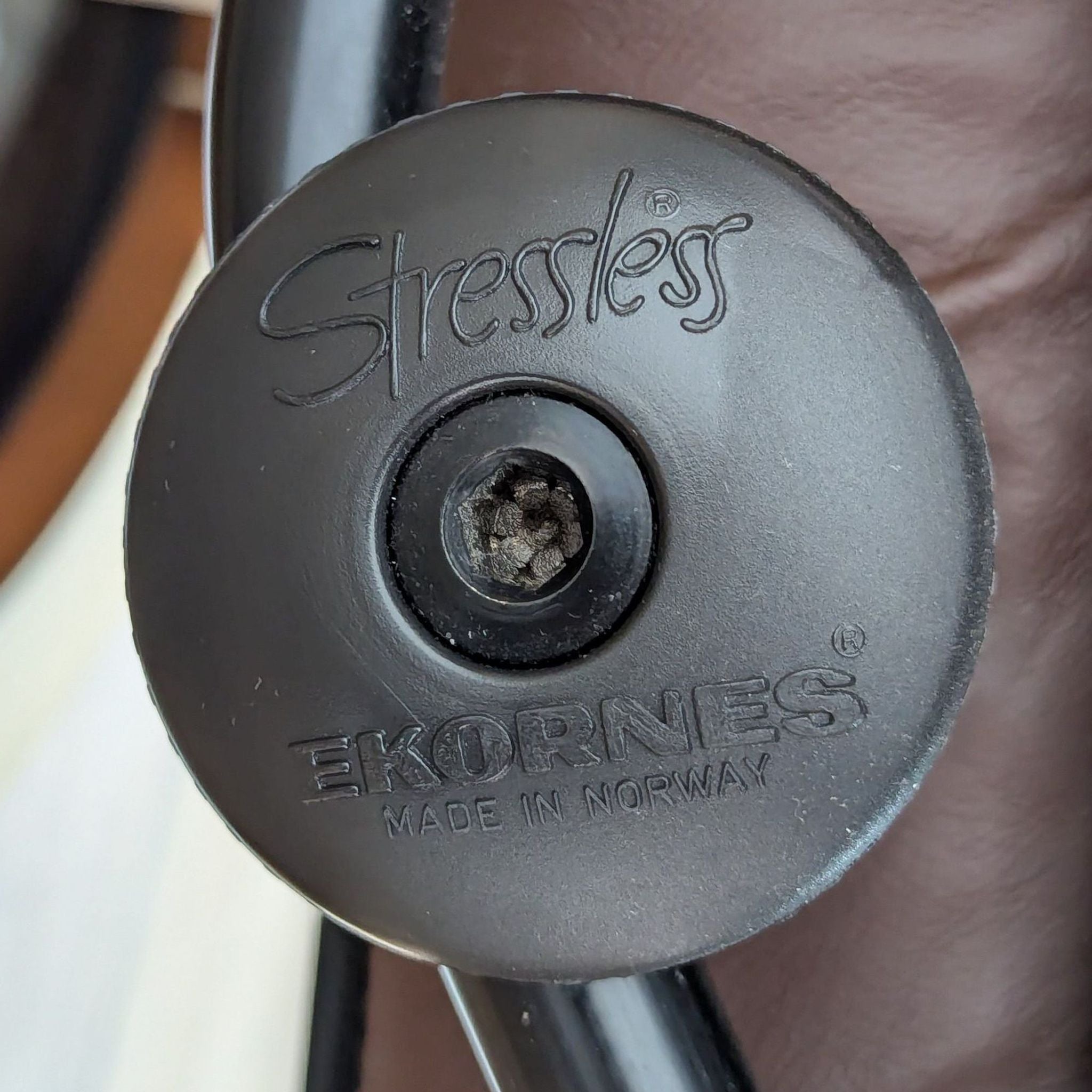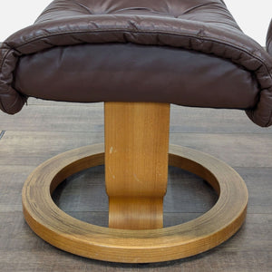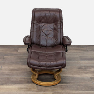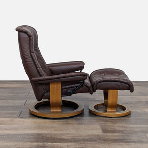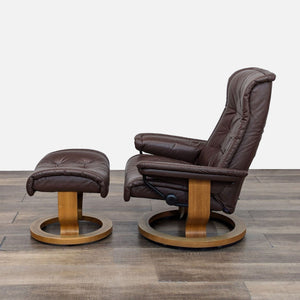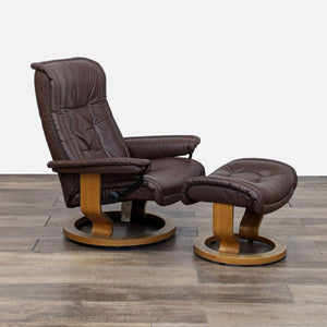 The Ekornes reclining lounge chair and ottoman features Norway Brown Leather Upholstery with a bent wood swivel base.