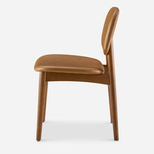 Seat & Back are bent wood with PU foam and top grain leather in caramel. The legs are solid rubberwood in a walnut stain.
