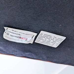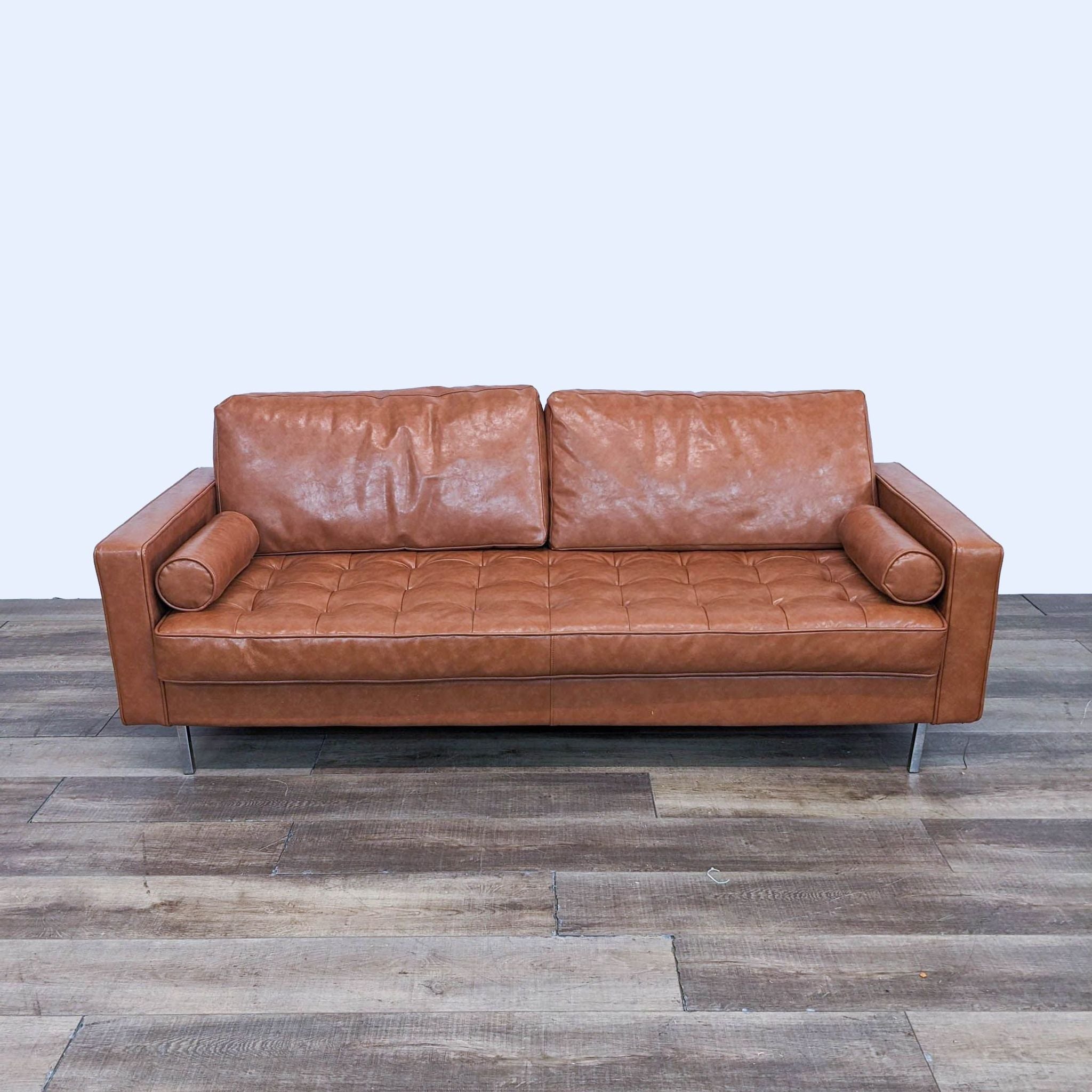 Contemporary leather sofa with tufted seat, metal legs and bolster pillows.