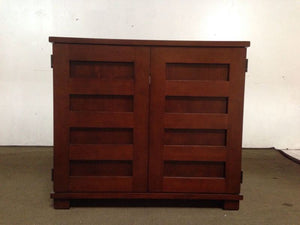 Bearing two doors with geometric shapes on the front which open to interior storage drawers, shelves and compartments
