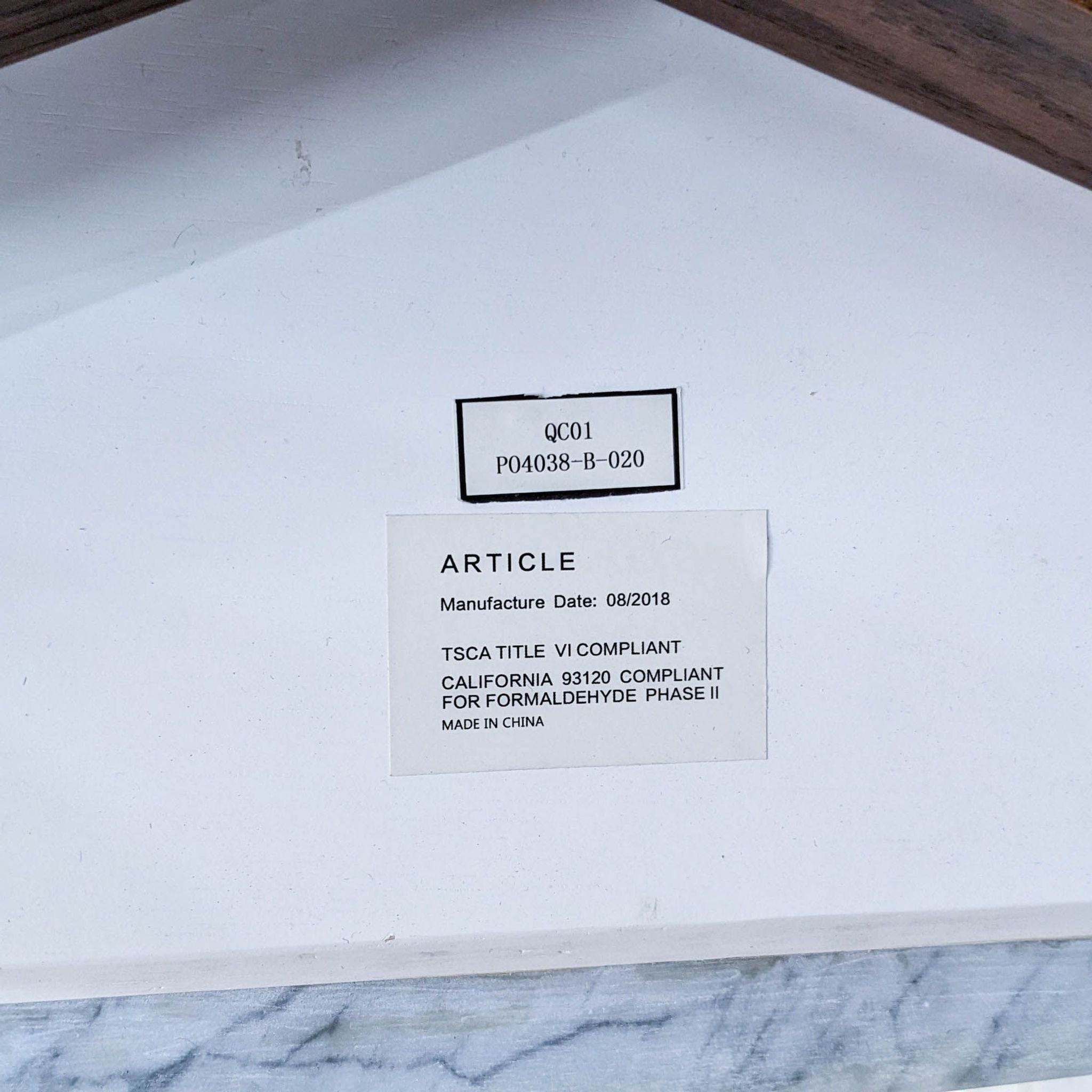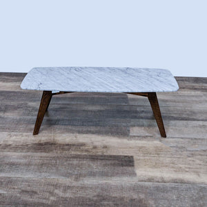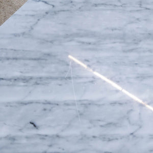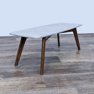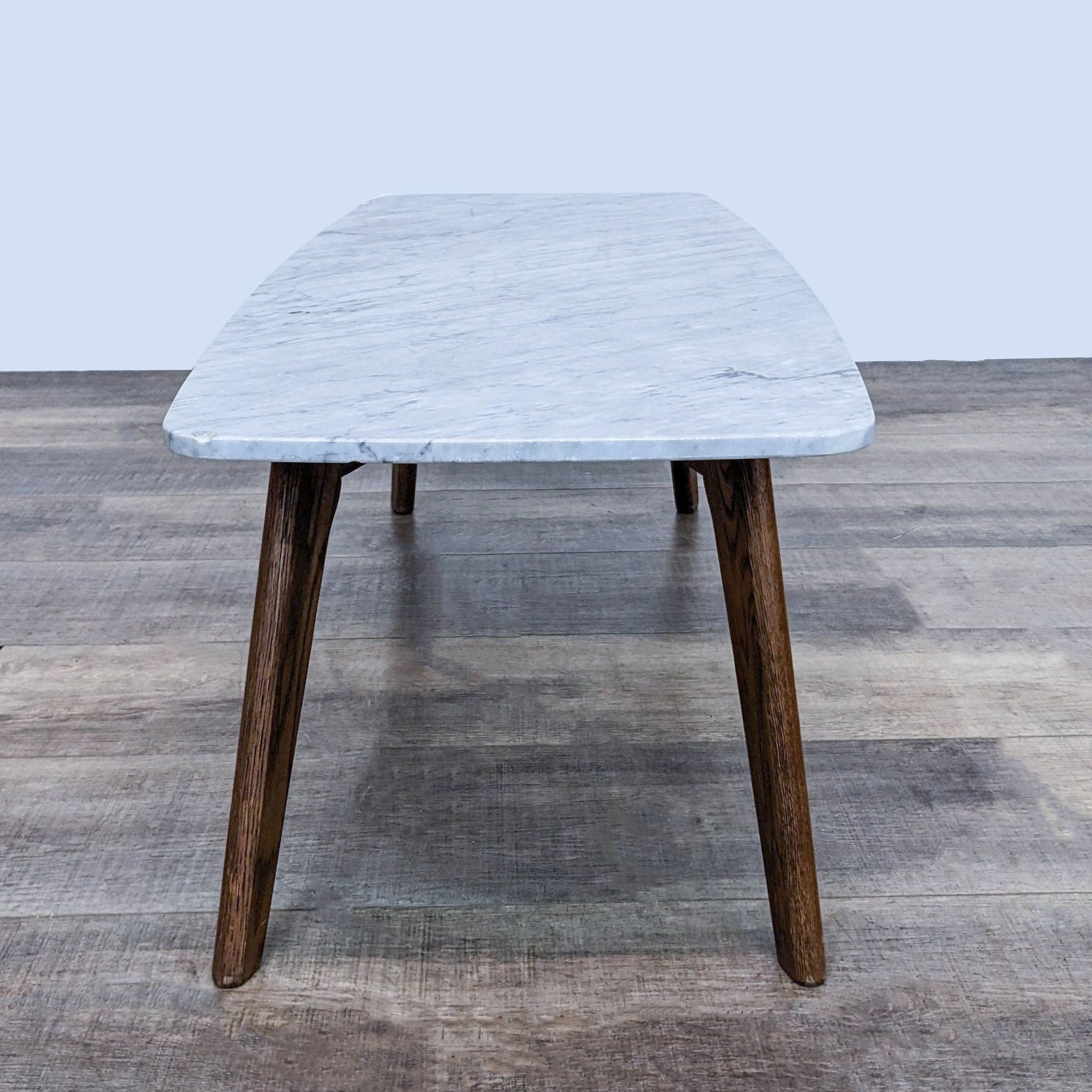 Marble top on white oak legs in a walnut finish - Note: the pink line in the photo is light glare. There is a scratch on the table top.