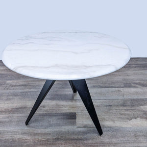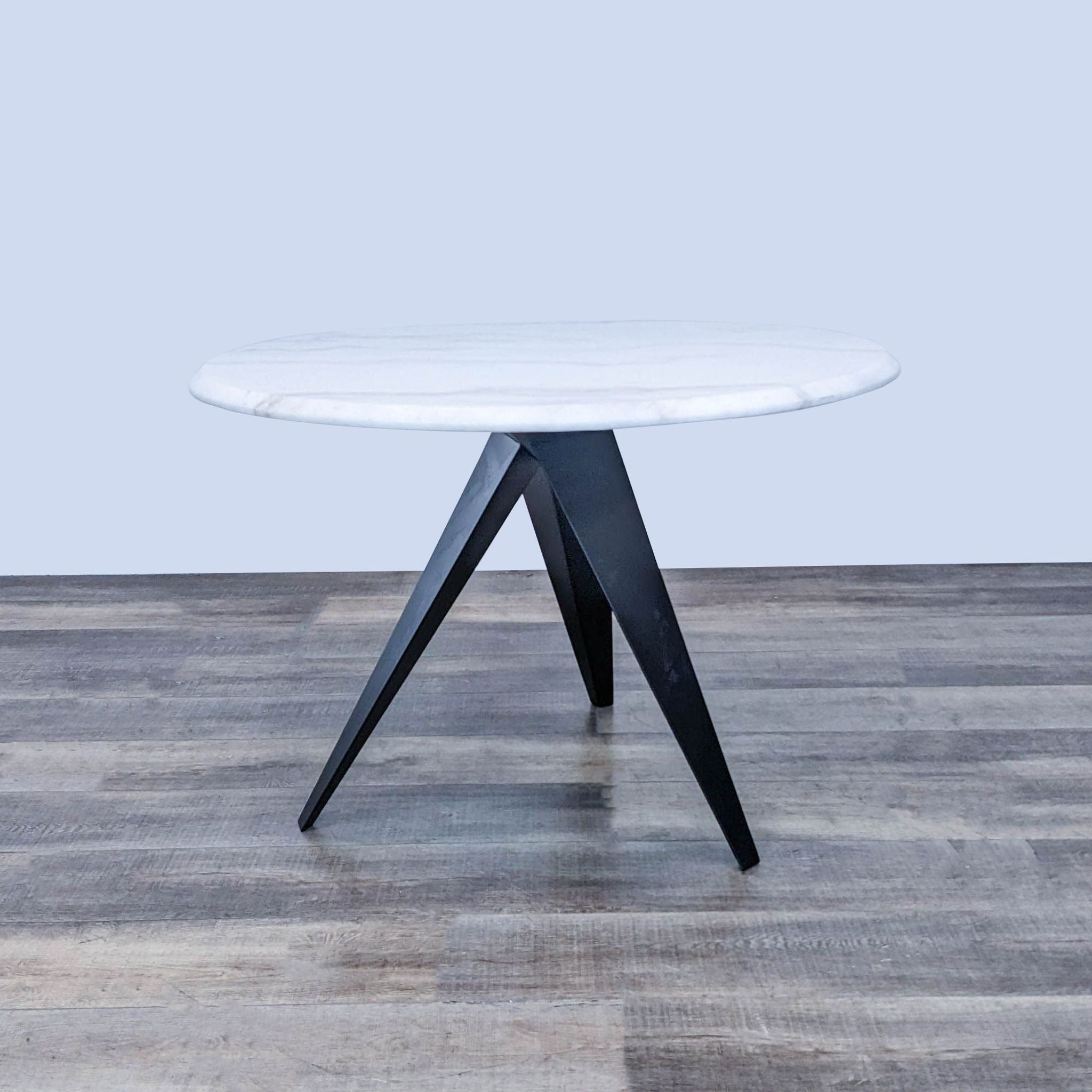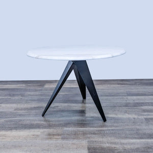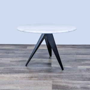 This modern dining table blends sculptural lines with visual simplicity featuring a coated steel base and a round marble top with a beveled edge.