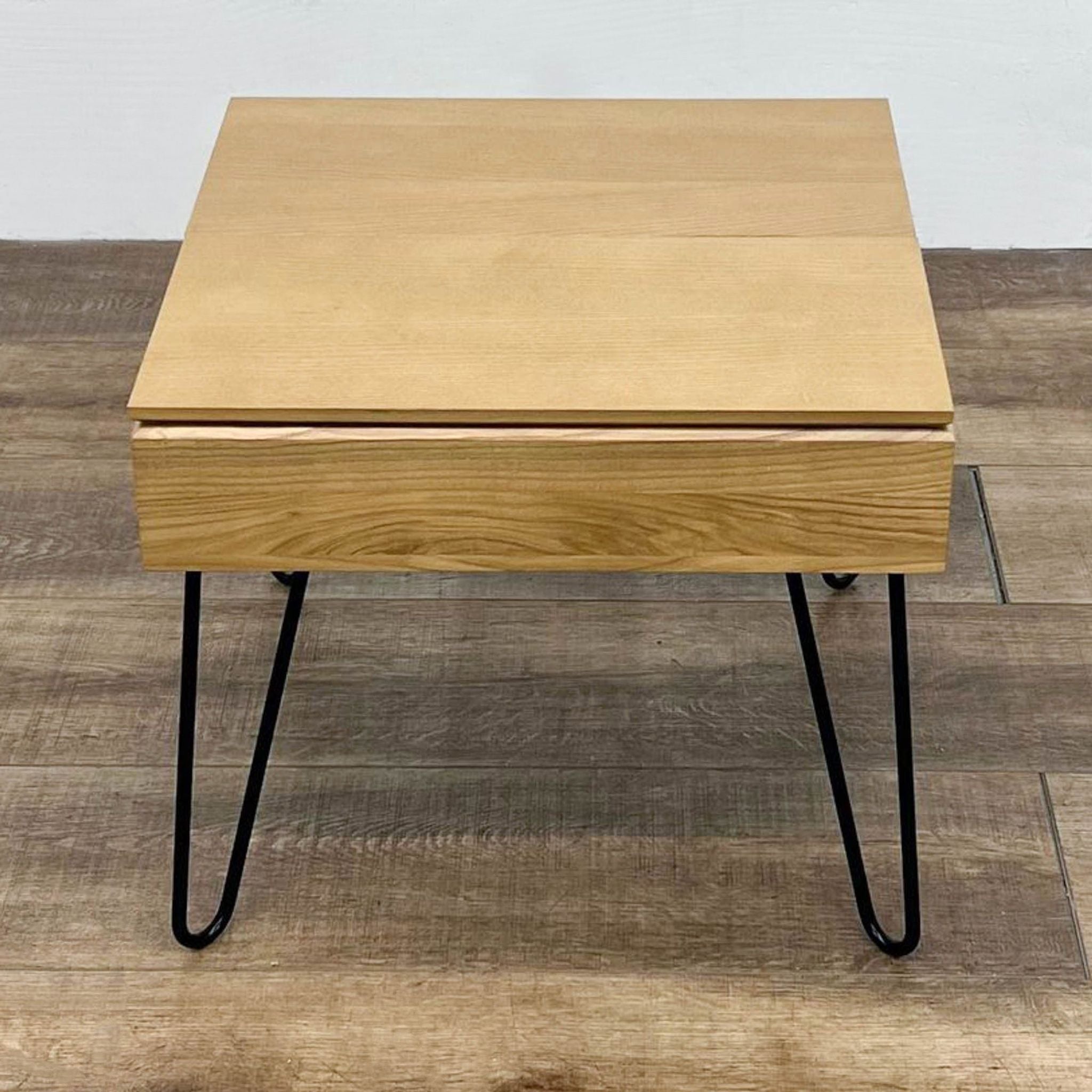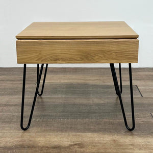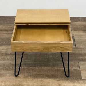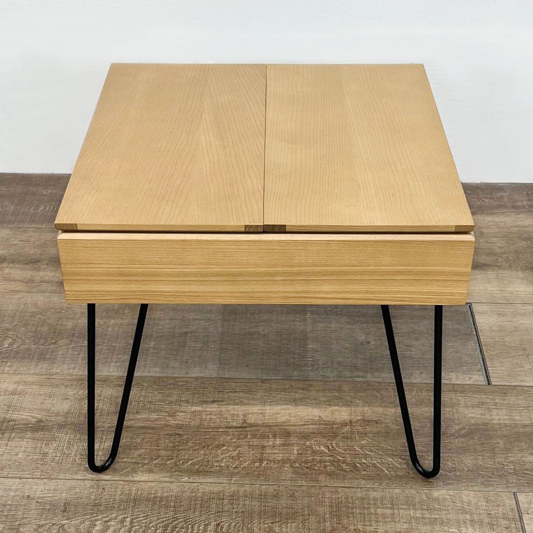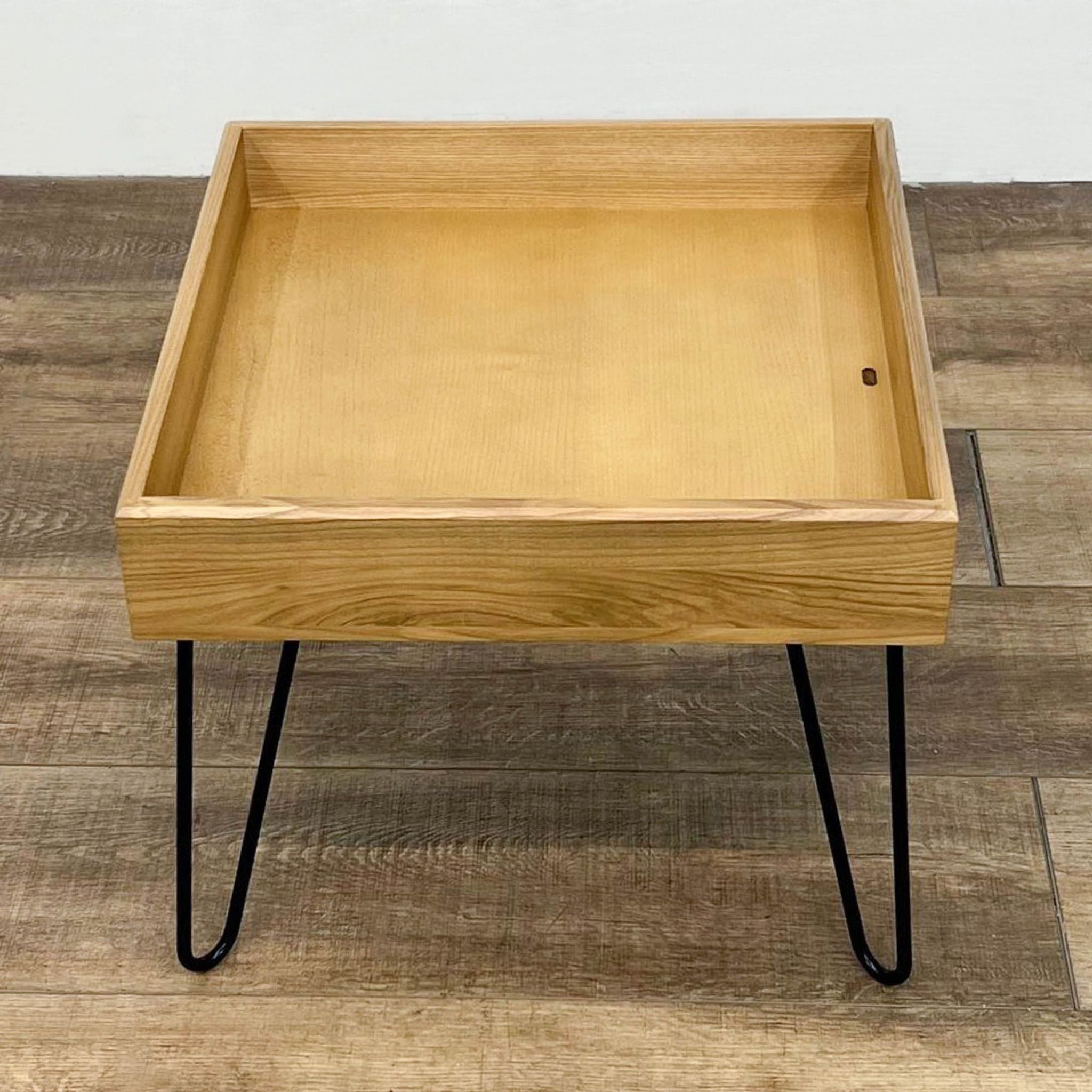 The table, with hairpin legs, features two removable multipurpose trays and a convenient cord slot. It's made of ash wood, mdf, and ash veneer with powder coated steel legs.