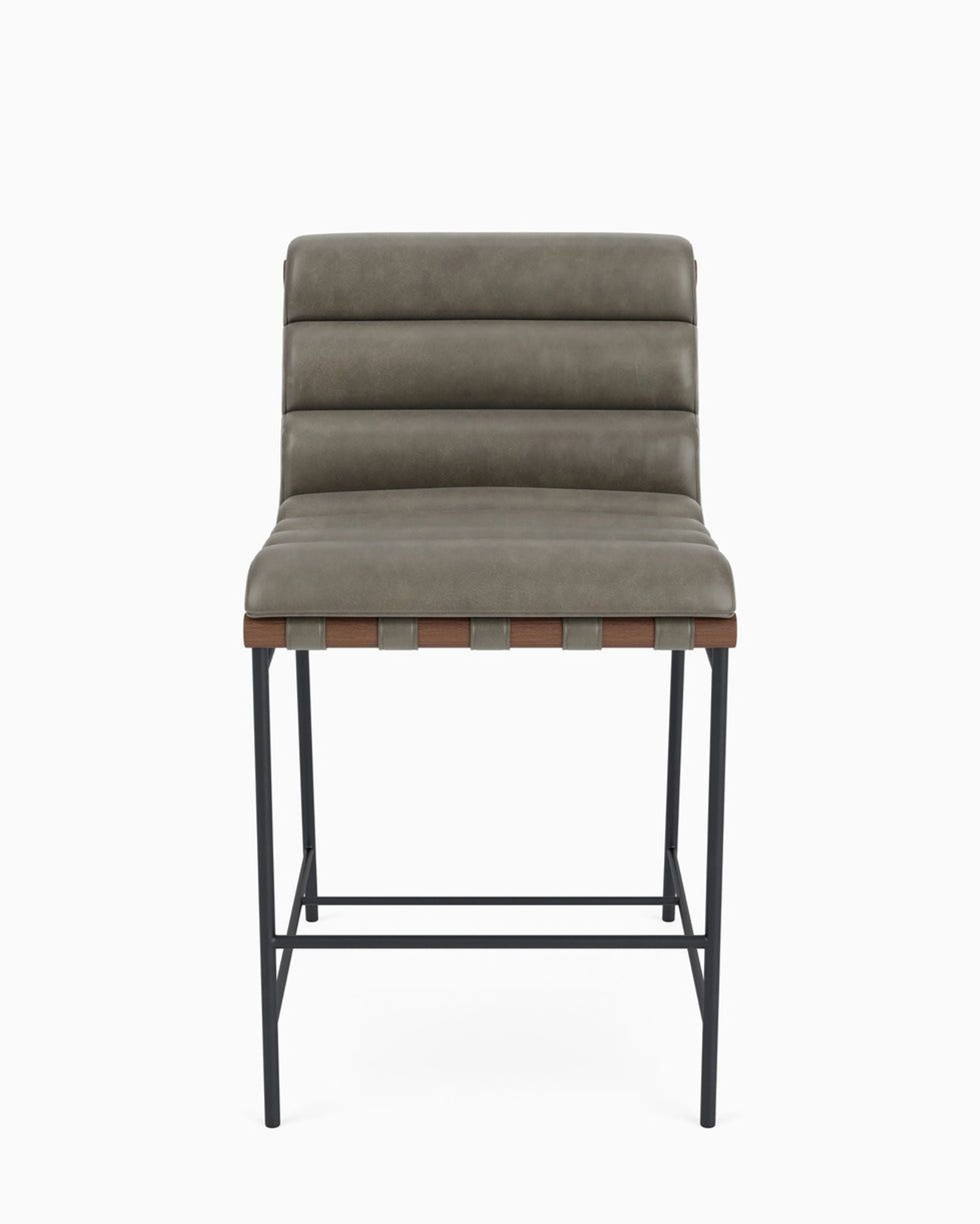 Modern Brown Leather Channel Padded Seat Stool With Wood And Stitched Leather Detail On Metal Frame