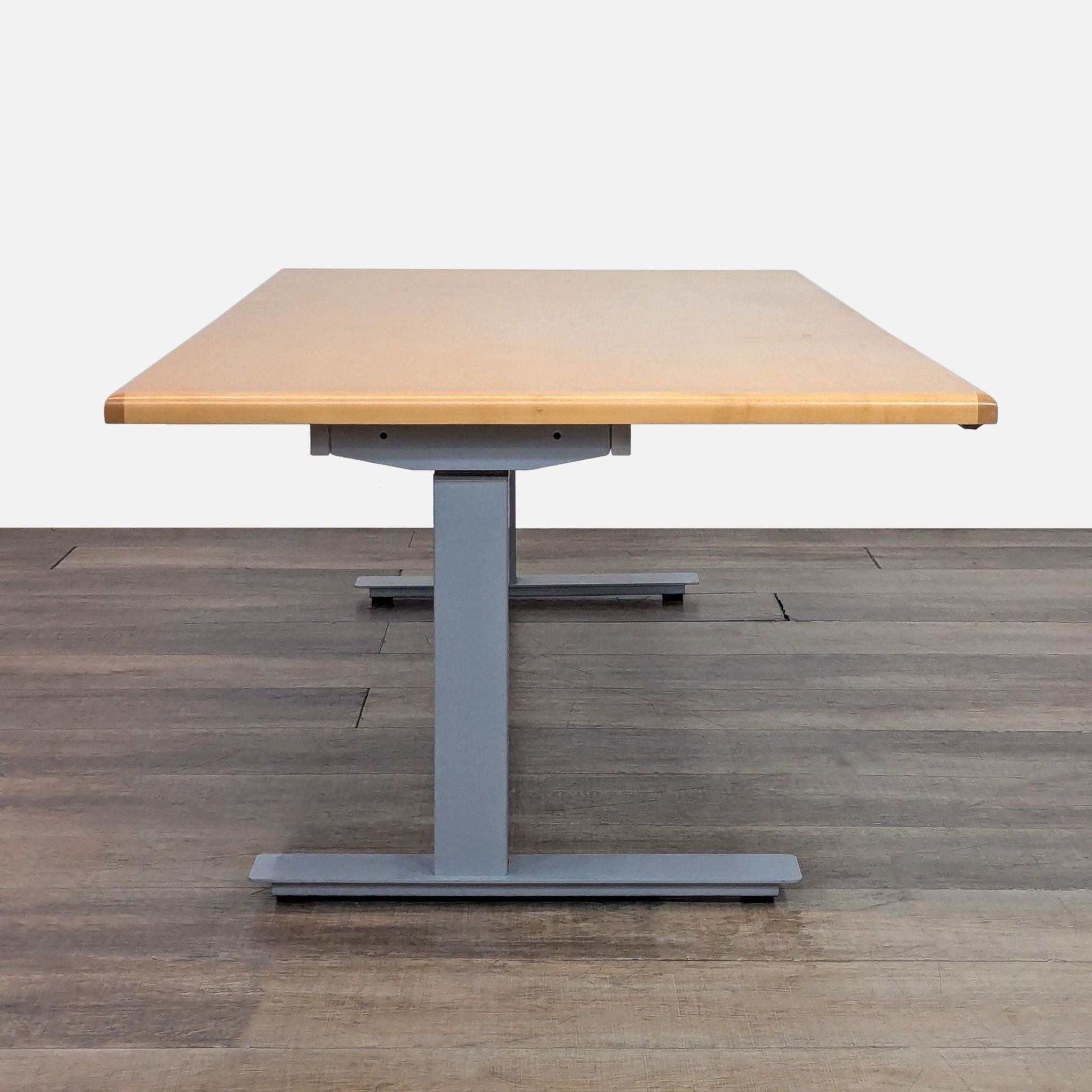 Adjustable height sit-stand desk featuring a sleek wood finish, sturdy metal legs and programmable keypad.