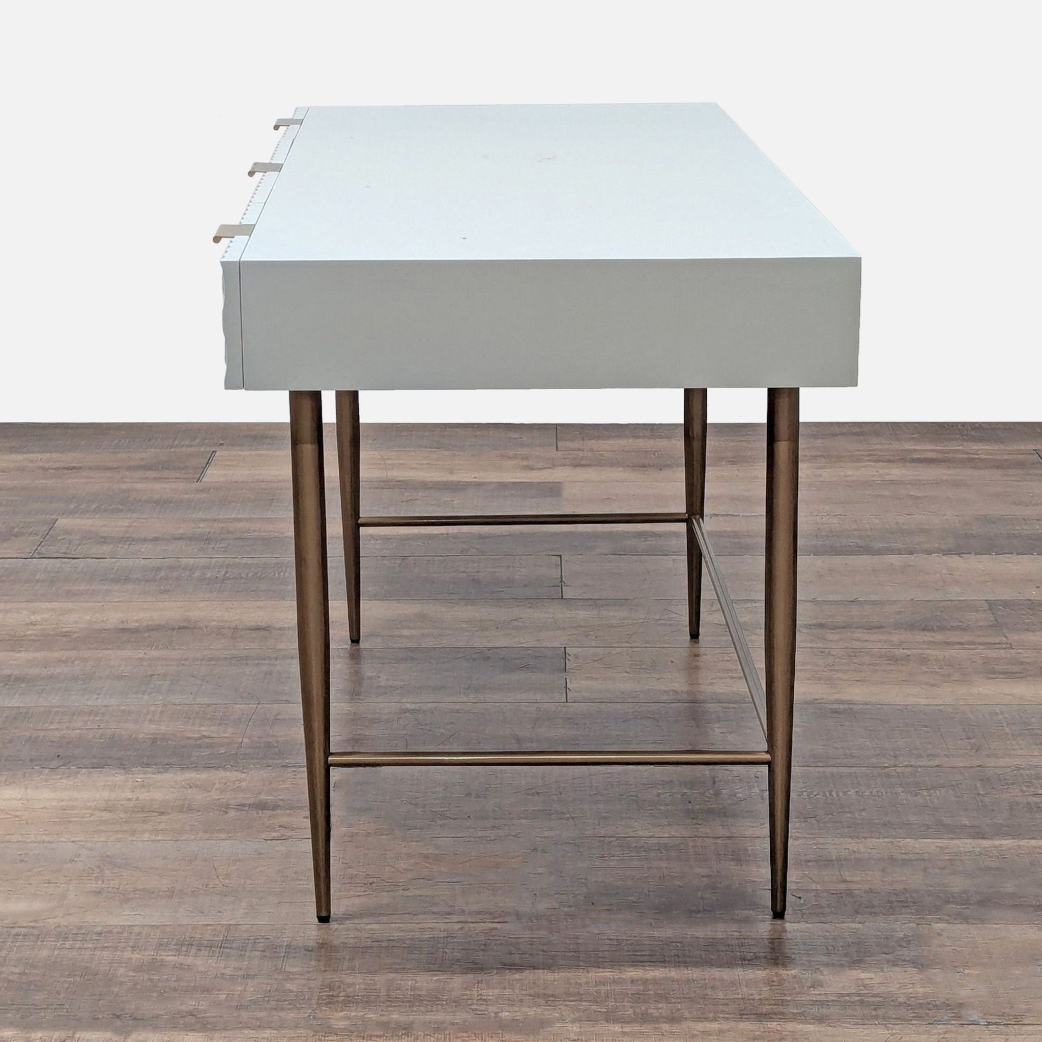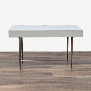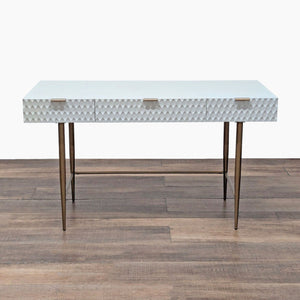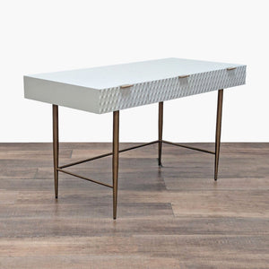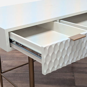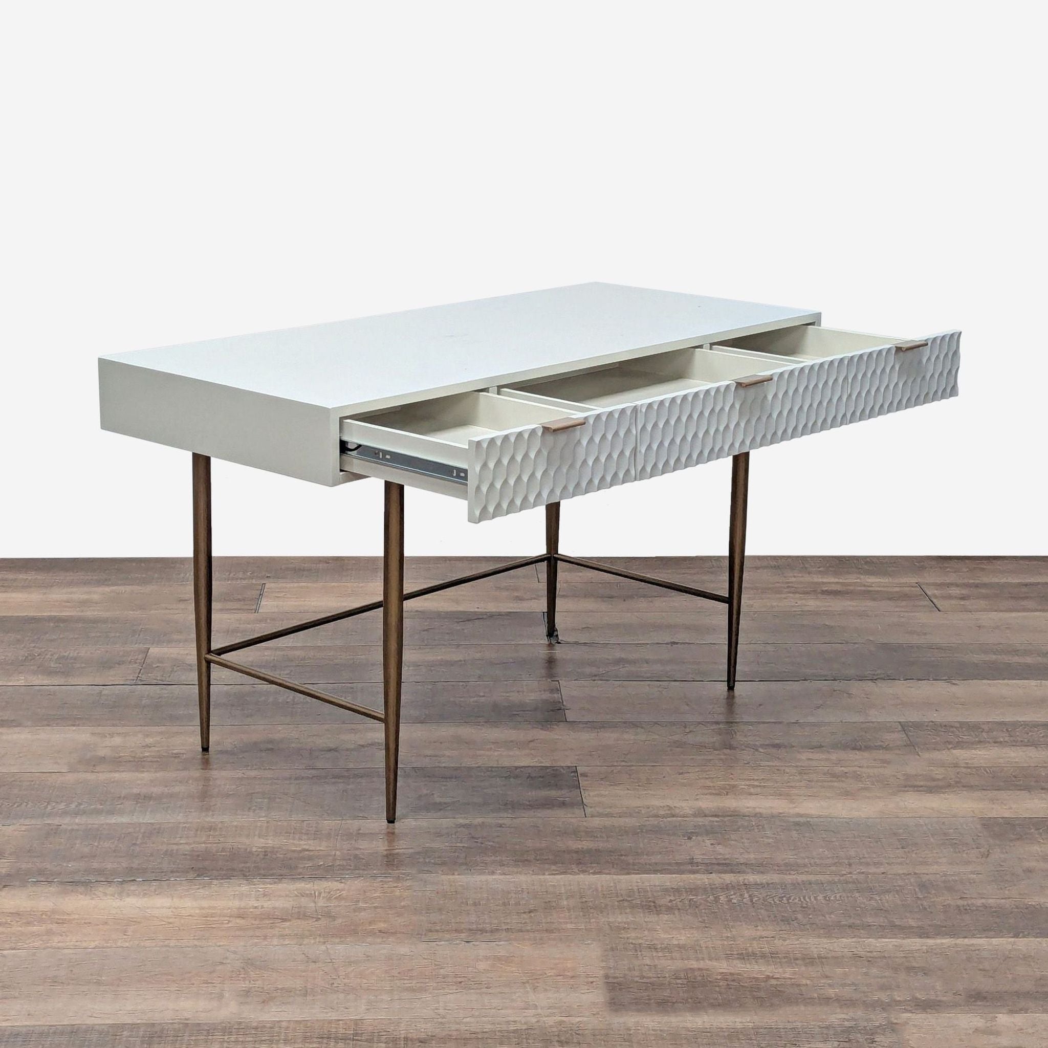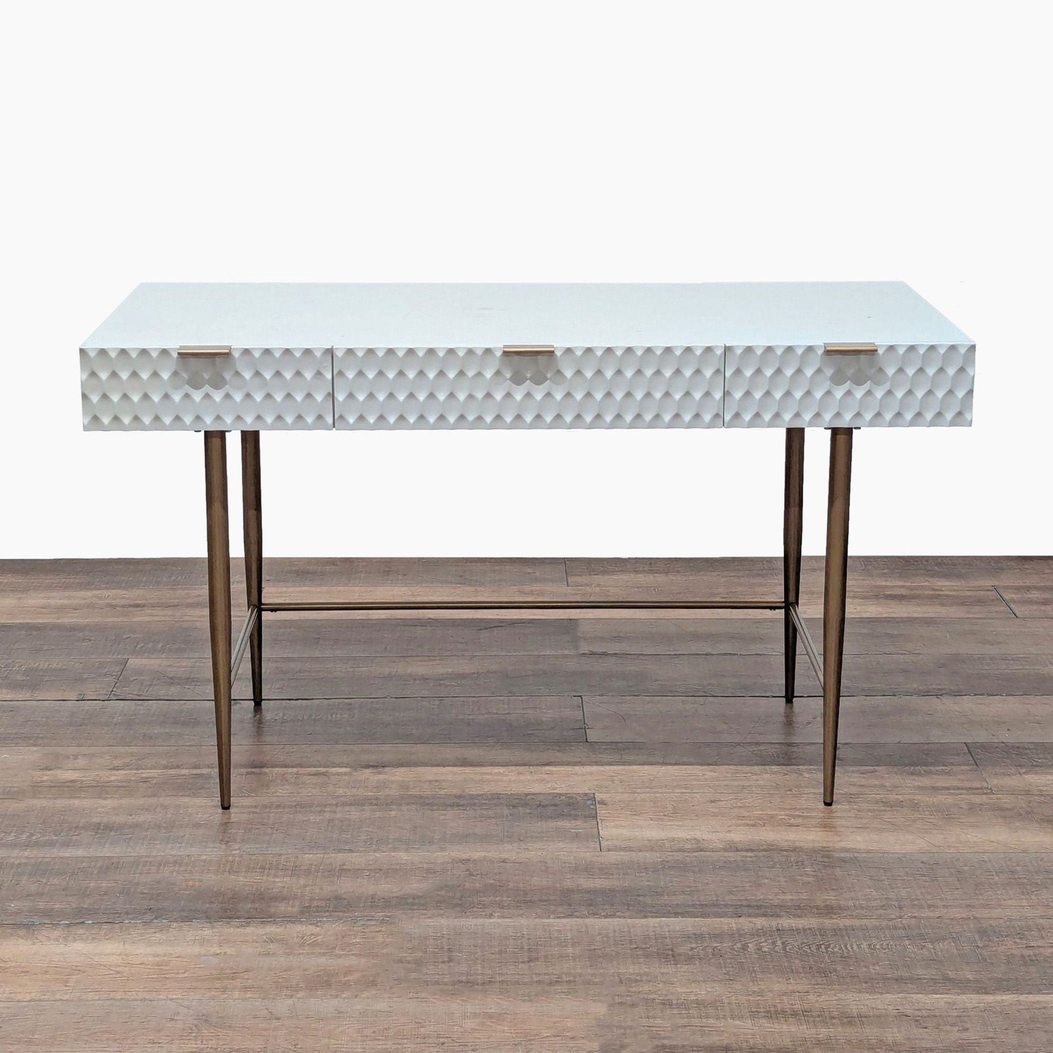 The West Elm Audrey Desk is a retro-inspired, compact desk suitable for various spaces, featuring geo-textured drawers and antique brass legs.