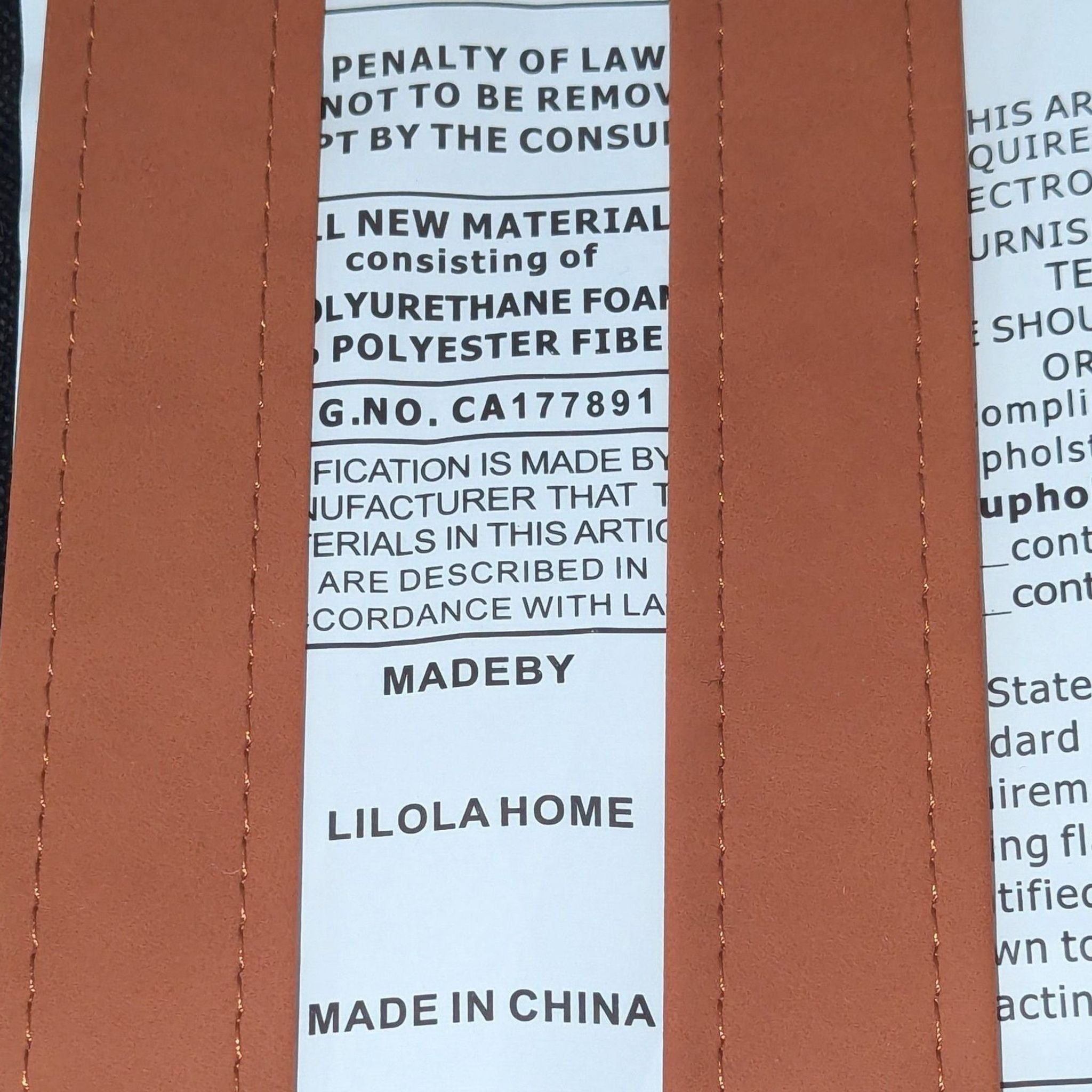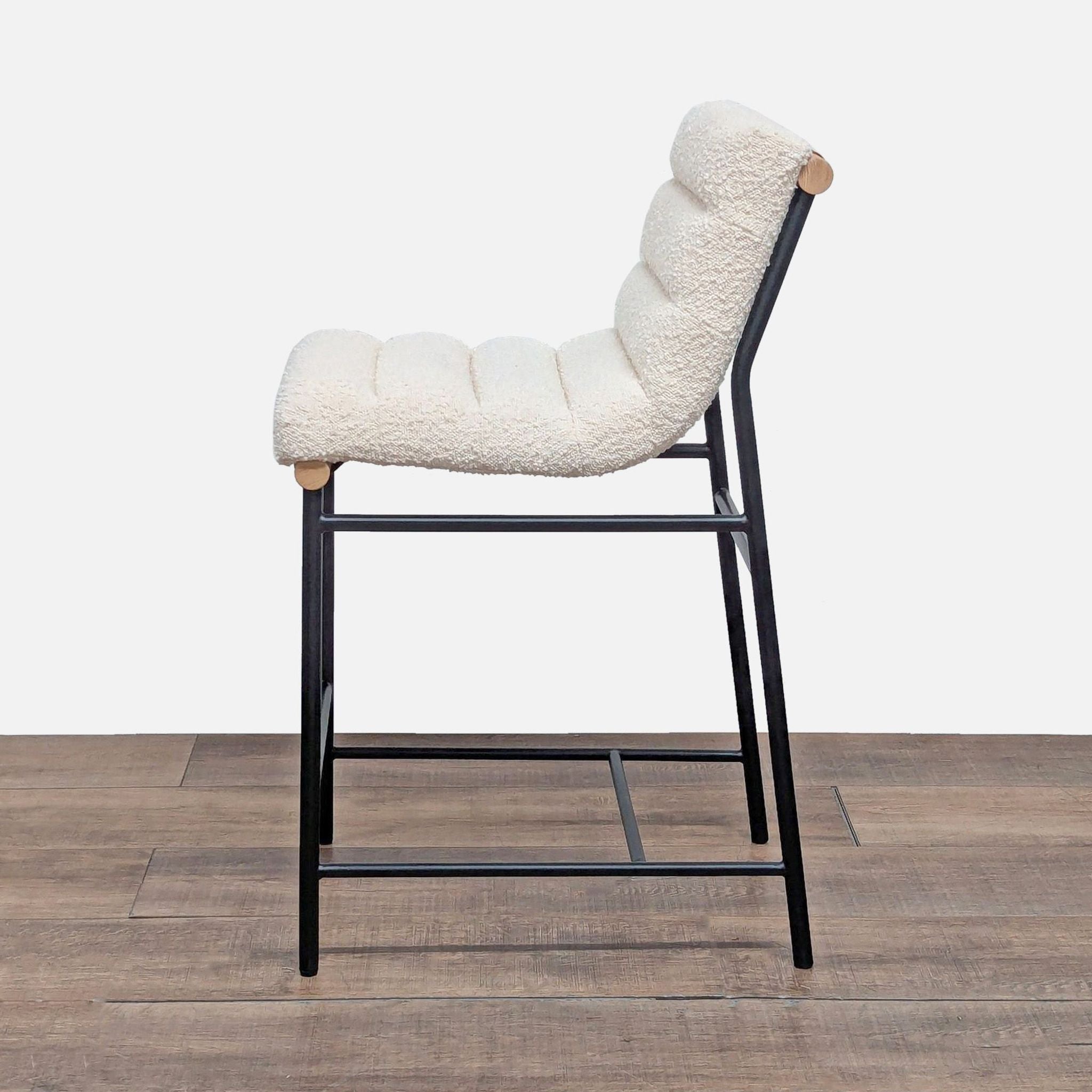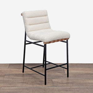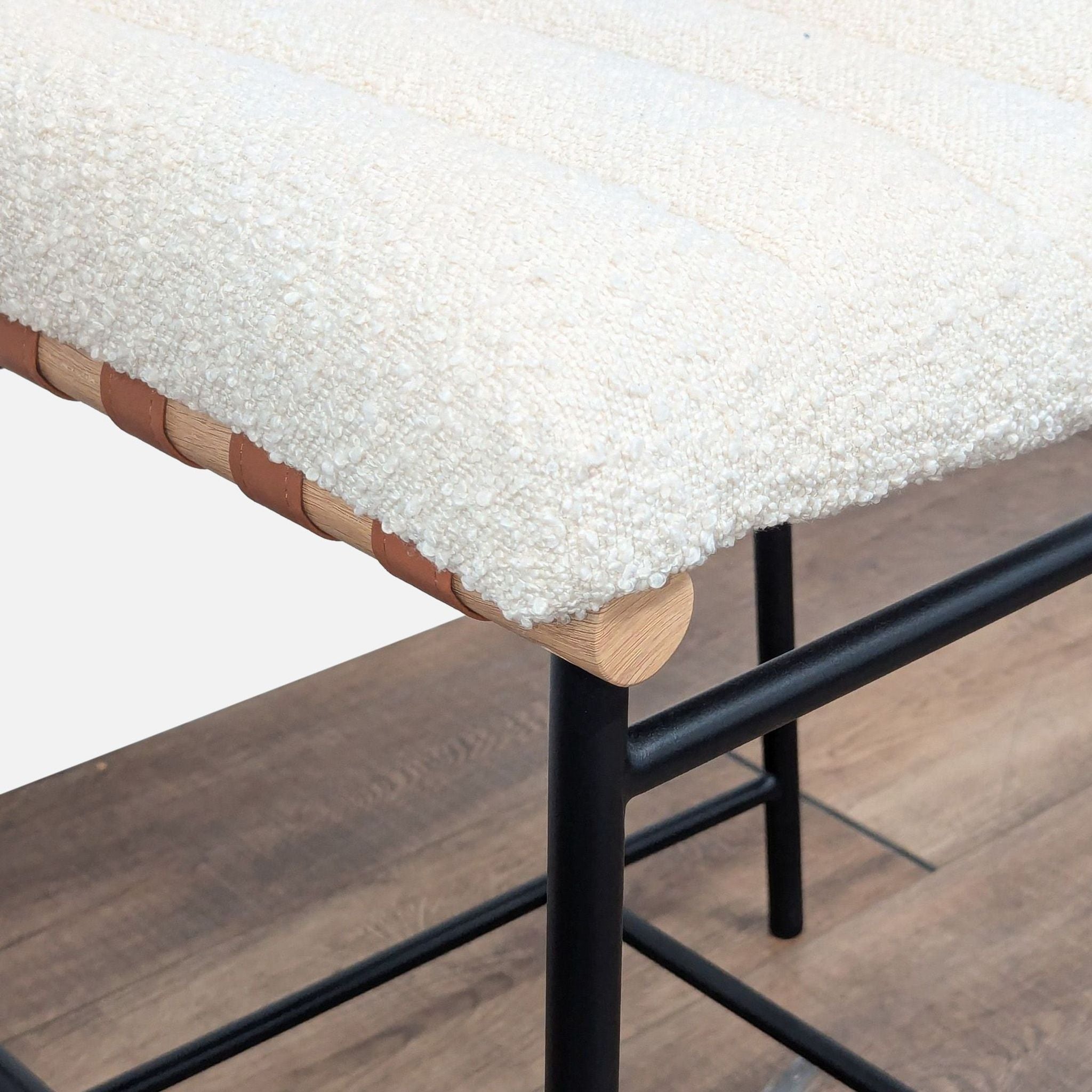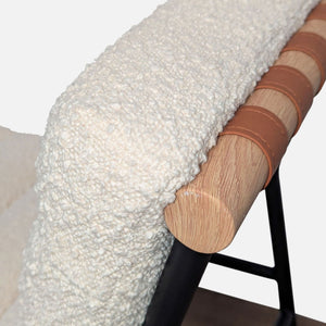 This channel tufted boucle upholstered chair has Cognac PU leather detailing with a wood-like finish bar and black iron legs.